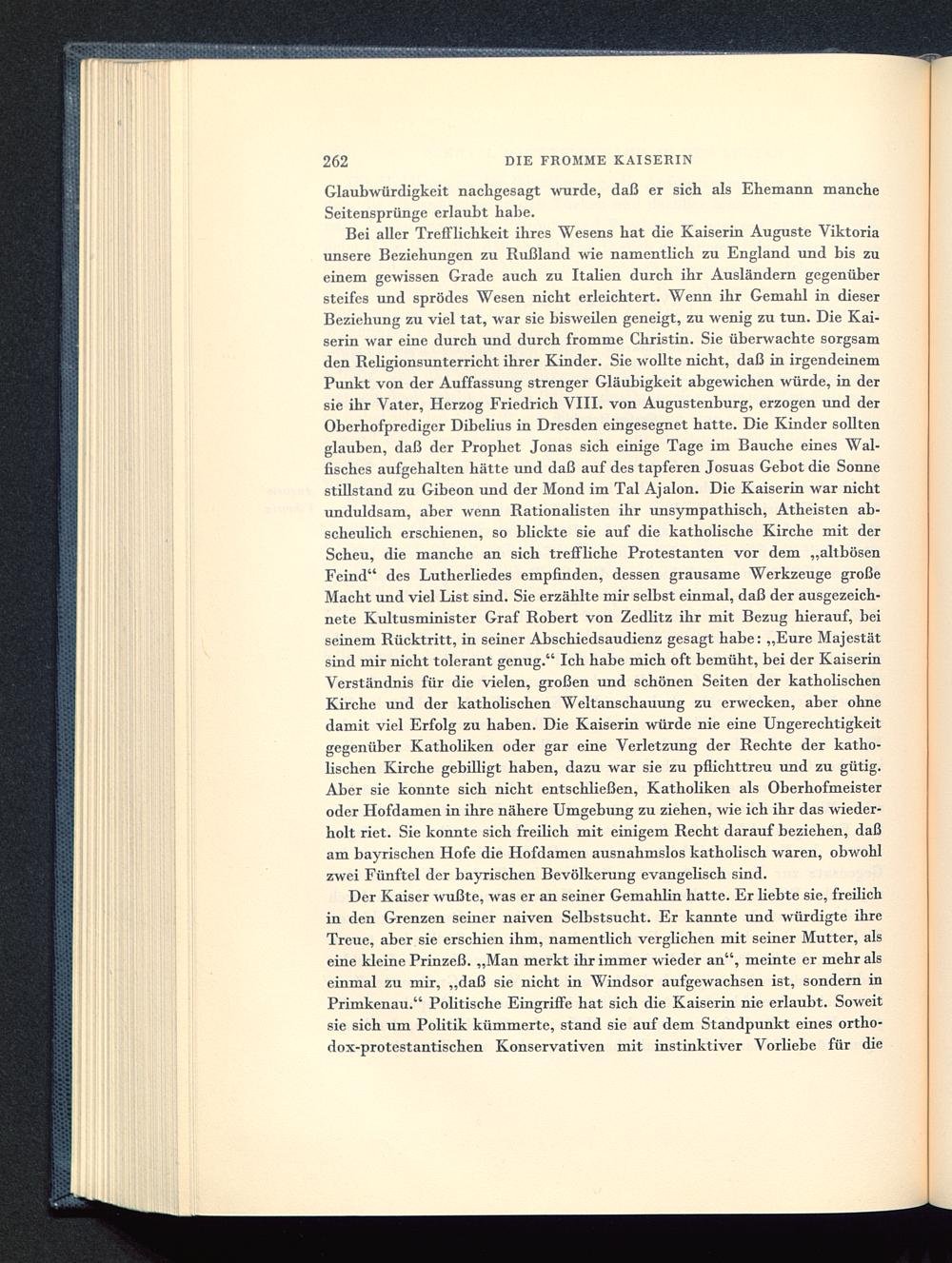 Bei aller Trefflichkeit ihres Wesens hat die Kaiserin Auguste Viktoriaunsere Beziehungen zu Rußland wie namentlich zu England und bis zueinem gewissen Grade auch zu Italien durch ihr Ausländern gegenübersteifes und sprödes Wesen nicht erleichtert. Wenn ihr Gemahl in dieserBeziehung zu viel tat, war sie bisweilen geneigt, zu wenig zu tun. Die Kai-serin war eine durch und durch fromme Christin. Sie überwachte sorgsamden Religionsunterricht ihrer Kinder. Sie wollte nicht, daß in irgendeinemPunkt von der Auffassung strenger Gläubigkeit abgewichen würde, in dersie ihr Vater, Herzog Friedrich VIII. von Augustenburg, erzogen und derOberhofprediger Dibelius in Dresden eingesegnet hatte. Die Kinder solltenglauben, daß der Prophet Jonas sich einige Tage im Bauche eines Wal-fisches aufgehalten hätte und daß auf des tapferen Josuas Gebot die Sonnestillstand zu Gibeon und der Mond im Tal Ajalon. Die Kaiserin war nichtunduldsam, aber wenn Rationalisten ihr unsympathisch, Atheisten ab-scheulich erschienen, so blickte sie auf die katholische Kirche mit derScheu, die manche an sich treffliche Protestanten vor dem „altbösenFeind" des Lutherliedes empfinden, dessen grausame Werkzeuge großeMacht und viel List sind. Sie erzählte mir selbst einmal, daß der ausgezeich-nete Kultusminister Graf Robert von Zedlitz ihr mit Bezug hierauf, beiseinem Rücktritt, in seiner Abschiedsaudienz gesagt habe: „Eure Majestätsind mir nicht tolerant genug." Ich habe mich oft bemüht, bei der KaiserinVerständnis für die vielen, großen und schönen Seiten der katholischenKirche und der katholischen Weltanschauung zu erwecken, aber ohnedamit viel Erfolg zu haben. Die Kaiserin würde nie eine Ungerechtigkeitgegenüber Katholiken oder gar eine Verletzung der Rechte der katho-lischen Kirche gebilligt haben, dazu war sie zu pflichttreu und zu gütig.Aber sie konnte sich nicht entschließen, Katholiken als Oberhofmeisteroder Hofdamen in ihre nähere Umgebung zu ziehen, wie ich ihr das wieder-holt riet. Sie konnte sich freilich mit einigem Recht darauf beziehen, daßam bayrischen Hofe die Hofdamen ausnahmslos katholisch waren, obwohlzwei Fünftel der bayrischen Bevölkerung evangelisch sind.