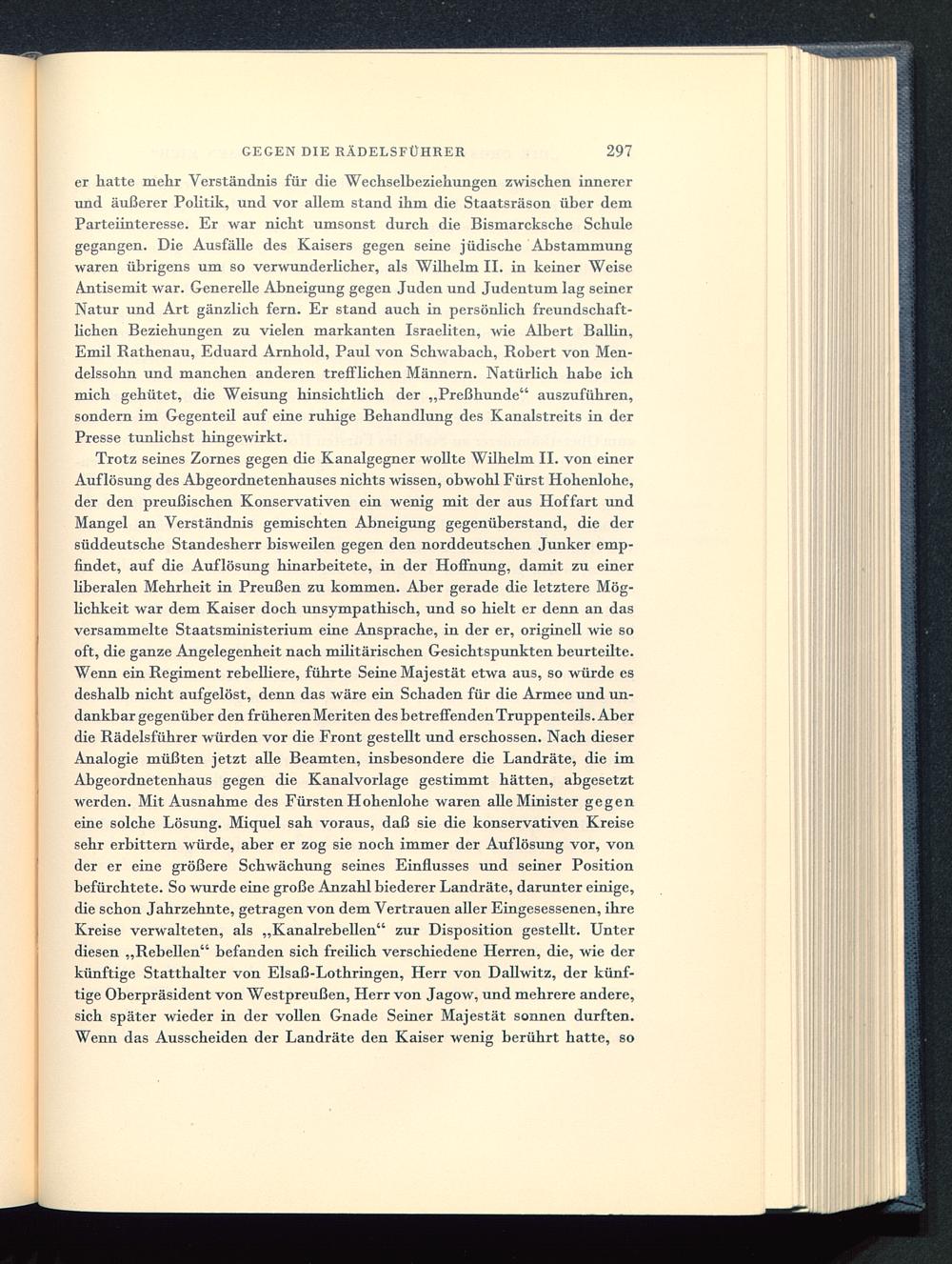 er hatte mehr Verständnis für die Wechselbeziehungen zwischen innererund äußerer Politik, und vor allem stand ihm die Staatsräson über demParteiinteresse. Er war nicht umsonst durch die Bismarcksche Schulegegangen. Die Ausfälle des Kaisers gegen seine jüdische Abstammungwaren übrigens um so verwunderlicher, als Wilhelm II. in keiner WeiseAntisemit war. Generelle Abneigung gegen Juden und Judentum lag seinerNatur und Art gänzlich fern. Er stand auch in persönlich freundschaft-lichen Beziehungen zu vielen markanten Israeliten, wie Albert Balün,Emil Rathenau, Eduard Arnhold, Paul von Schwabach, Robert von Men-delssohn und manchen anderen treff liehen Männern. Natürlich habe ichmich gehütet, die Weisung hinsichtlich der „Preßhunde" auszuführen,sondern im Gegenteil auf eine ruhige Behandlung des Kanalstreits in derPresse tunlichst hingewirkt.
