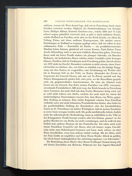 erklären, warum ich Wert darauf lege, daß wir in Petersburg durch einenPreußen vertreten werden. Obgleich die Pietätstraditionen von KöniginLuise, Heiliger Allianz , Kaiserin Charlotte usw., welche 1866 und 70 nochschwer wogen, gründlich verwischt sind, so gibt es doch unlösbare Bande,welche Rußland an Preußen , nicht aber an das Reich fesseln, vor allem dieTeilung Polens mit ihren endlosen Konsequenzen. Ich möchte unsereBeziehungen zu Rußland so sorgsam gepflegt sehen, daß wir selbst in demschlimmsten Falle — Zerwürfnis im Reiche — ein preußisch-russischesBündnis haben können, gleichviel auf wessen Kosten. Nach Kaiser FranzJosefs Abberufung wird es nur zwei wirkliche Monarchen geben. Zwischenihnen muß ein fester Preuße stehen; ein plumper Schwabe, ein liberalerBadenser, ein katholischer Bayer würden solche Geschäfte nicht besorgenkönnen. Darüber, daß ein Fachmann nach Petersburg gehört, bin ich ebensowie 1892 nicht im Zweifel. Besonders erscheint es nicht ratsam, einen Gene-ral dorthin zu schicken: das, was früher so nützlich war, die häufige Begeg-nung mit dem Kaiser, ist weggefallen; eine Erscheinung wie Werder oderich in Krasnoje Selo an der Tafel, wo Kaiser Alexander der Zweite inGegenwart des Generals Chanzy mit mir auf St.-Privat anstieß und denPariser Einzugsmarsch spielen Heß, wäre jetzt, wo die Marseillaise gespieltwird, ein gespensterhafter Anachronismus. Da wäre ein Admiral nochbesser wie ein General. Das dritte meiner Postulate von 1892: vertrauen-erweckende Persönlichkeit, fällt jetzt weg; das Reich braucht in Petersburg einen Vertreter, der nicht bloß mit dem Grafen Murawiew fertig wird, wasja wohl nicht schwer sein dürfte, sondern der auch tanti ist, einem dermerkwürdigsten Staatsmänner unserer Zeit, dem Herrn von Witte, gegen-über Stellung zu nehmen. Eine solche Kapazität würden Euer Exzellenzvielleicht unter mir nicht bekannten Persönlichkeiten finden, aber leider istdie gesellschaftliche Stellung des Botschafters oder des botschaftlichenPaares in St. Petersburg von solcher Wichtigkeit, daß sie meines Erachtensin erster Linie erwogen werden muß. Die große intellektuelle Arbeit, freilichnicht die mikroskopische Beobachtung, kann ja schließlich in der Villa ander Königgrätzer Straße besorgt werden; aber den kleinen ,pannes' in dergroßen Morskoi ist von Berlin aus nicht vorzubeugen, und da weiß ich nunfreilich kein anderes Ehepaar als das Pourtalessche. Ich sehne mich nacheinem Stündchen Gesprächs mit Ihnen, aber ich konnte wegen Unwohl-seins nicht zum Ordenskapitel kommen und kann mich schwer zu einerReise entschließen, wenn kein äußerer Anlaß vorliegt. Mit der Bitte, michder Frau Gräfin zu empfehlen und Ihren Herrn Bruder Alfred zu grüßen,bin ich in treuer Anhänglichkeit Ihr aufrichtig ergebener von Schweinitz."
