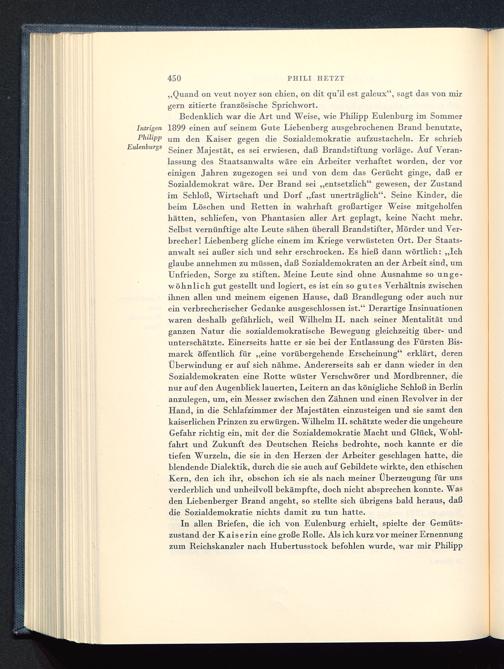 Bedenklich war die Art und Weise, wie Philipp Eulenburg im SommerIntrigen 1899 einen auf seinem Gute Liebenberg ausgebrochenen Brand benutzte,Philipp um den Kaiser gegen die Sozialdemokratie aufzustacheln. Er schrieblenburgs g emer Majestät, es sei erwiesen, daß Brandstiftung vorläge. Auf Veran-lassung des Staatsanwalts wäre ein Arbeiter verhaftet worden, der voreinigen Jahren zugezogen sei und von dem das Gerücht ginge, daß erSozialdemokrat wäre. Der Brand sei „entsetzlich" gewesen, der Zustandim Schloß, Wirtschaft und Dorf „fast unerträglich". Seine Kinder, diebeim Löschen und Retten in wahrhaft großartiger Weise mitgeholfenhätten, schliefen, von Phantasien aller Art geplagt, keine Nacht mehr.Selbst vernünftige alte Leute sähen überall Brandstifter, Mörder und Ver-brecher! Liebenberg gliche einem im Kriege verwüsteten Ort. Der Staats-anwalt sei außer sich und sehr erschrocken. Es hieß dann wörtlich: „Ichglaube annehmen zu müssen, daß Sozialdemokraten an der Arbeit sind, umUnfrieden, Sorge zu stiften. Meine Leute sind ohne Ausnahme so unge-wöhnlich gut gestellt und logiert, es ist ein so gutes Verhältnis zwischenihnen allen und meinem eigenen Hause, daß Brandlegung oder auch nurein verbrecherischer Gedanke ausgeschlossen ist." Derartige Insinuationenwaren deshalb gefährlich, weil Wilhelm II. nach seiner Mentalität undganzen Natur die sozialdemokratische Bewegung gleichzeitig über- undunterschätzte. Einerseits hatte er sie bei der Entlassung des Fürsten Bis-marck öffentlich für „eine vorübergehende Erscheinung" erklärt, derenUberwindung er auf sich nähme. Andererseits sah er dann wieder in denSozialdemokraten eine Rotte wüster Verschwörer und Mordbrenner, dienur auf den Augenblick lauerten, Leitern an das königliche Schloß in Berlin anzulegen, um, ein Messer zwischen den Zähnen und einen Revolver in derHand, in die Schlafzimmer der Majestäten einzusteigen und sie samt denkaiserlichen Prinzen zu erwürgen. Wilhelm II. schätzte weder die ungeheureGefahr richtig ein, mit der die Sozialdemokratie Macht und Glück, Wohl-fahrt und Zukunft des Deutschen Reichs bedrohte, noch kannte er dietiefen Wurzeln, die sie in den Herzen der Arbeiter geschlagen hatte, dieblendende Dialektik, durch die sie auch auf Gebildete wirkte, den ethischenKern, den ich ihr, obschon ich sie als nach meiner Überzeugung für unsverderblich und unheüvoll bekämpfte, doch nicht absprechen konnte. Wasden Liebenberger Brand angeht, so stellte sich übrigens bald heraus, daßdie Sozialdemokratie nichts damit zu tun hatte.
