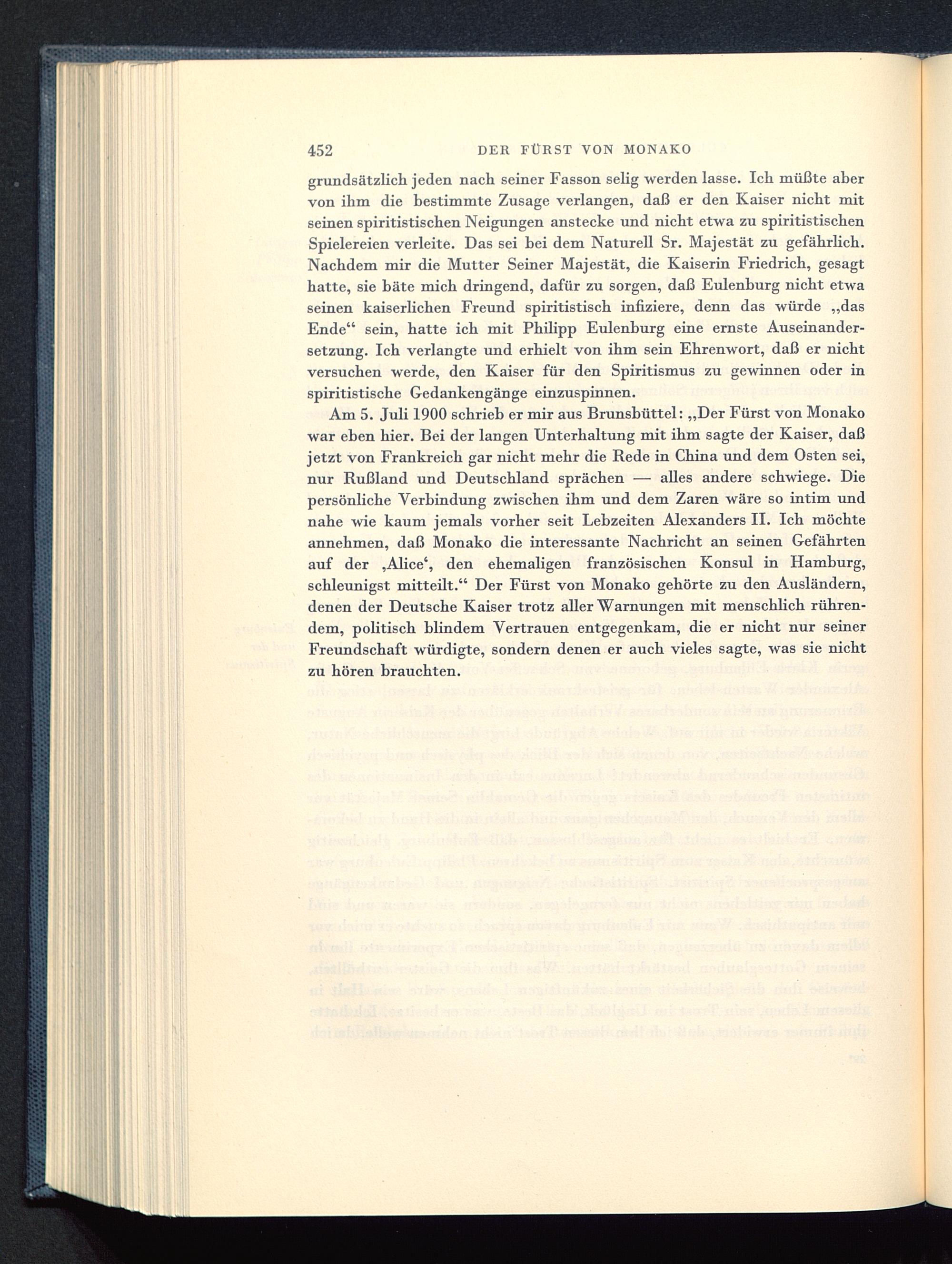 Am 5. Juli 1900 schrieb er mir aus Brunsbüttel: „Der Fürst von Monako war eben hier. Bei der langen Unterhaltung mit ihm sagte der Kaiser, daßjetzt von Frankreich gar nicht mehr die Rede in China und dem Osten sei,nur Rußland und Deutschland sprächen — alles andere schwiege. Diepersönliche Verbindung zwischen ihm und dem Zaren wäre so intim undnahe wie kaum jemals vorher seit Lebzeiten Alexanders II . Ich möchteannehmen, daß Monako die interessante Nachricht an seinen Gefährtenauf der ,Alice', den ehemaligen französischen Konsul in Hamburg ,schleunigst mitteilt." Der Fürst von Monako gehörte zu den Ausländern,denen der Deutsche Kaiser trotz aller Warnungen mit menschlich rühren-dem, politisch blindem Vertrauen entgegenkam, die er nicht nur seinerFreundschaft würdigte, sondern denen er auch vieles sagte, was sie nichtzu hören brauchten.