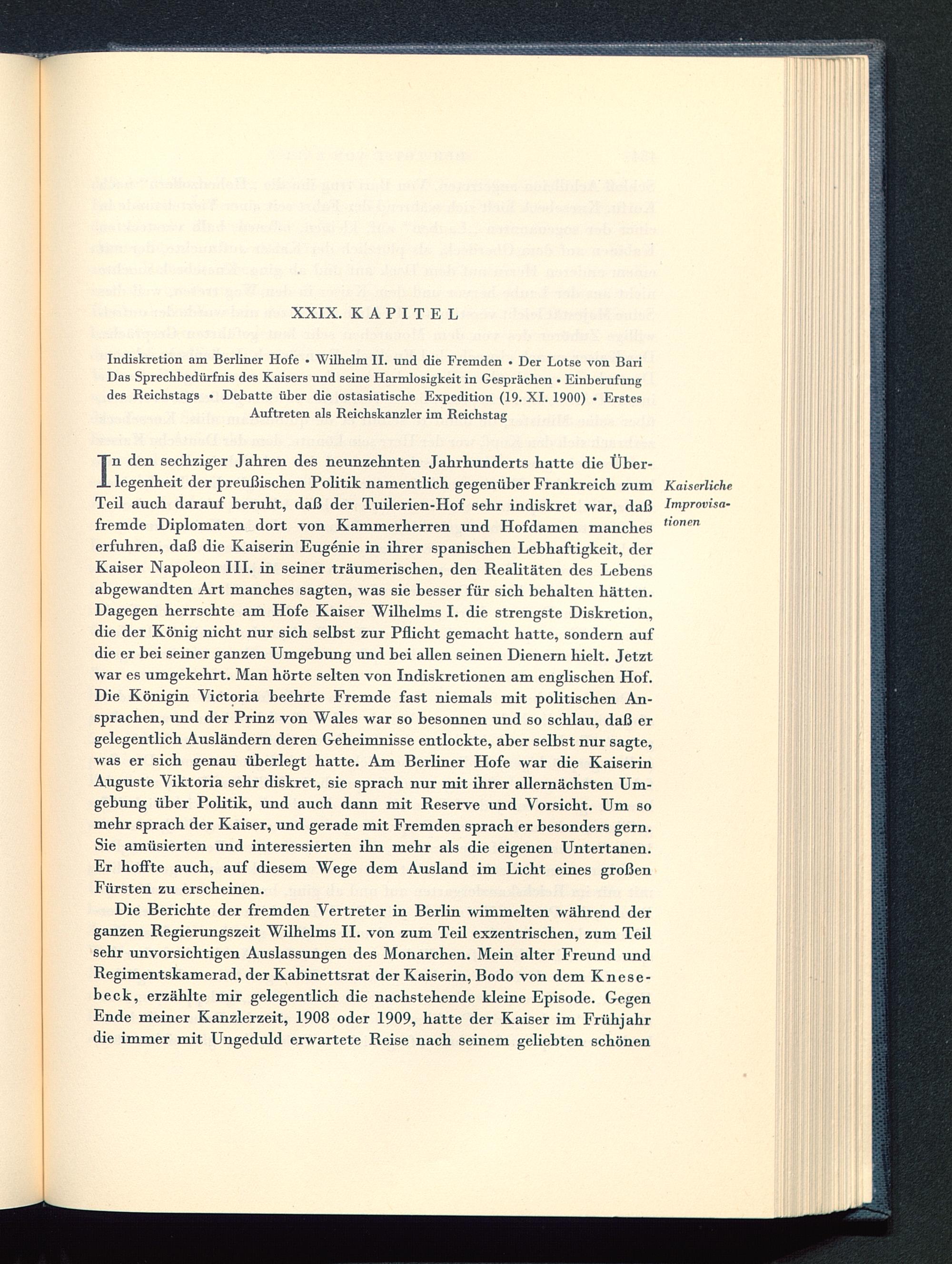Indiskretion am Berliner Hofe • Wilhelm II. und die Fremden • Der Lotse von Bari Das Sprechbedürfnis des Kaisers und seine Harmlosigkeit in Gesprächen • Einberufungdes Reichstags • Debatte über die ostasiatische Expedition (19. XI. 1900) • ErstesAuftreten als Reichskanzler im Reichstag