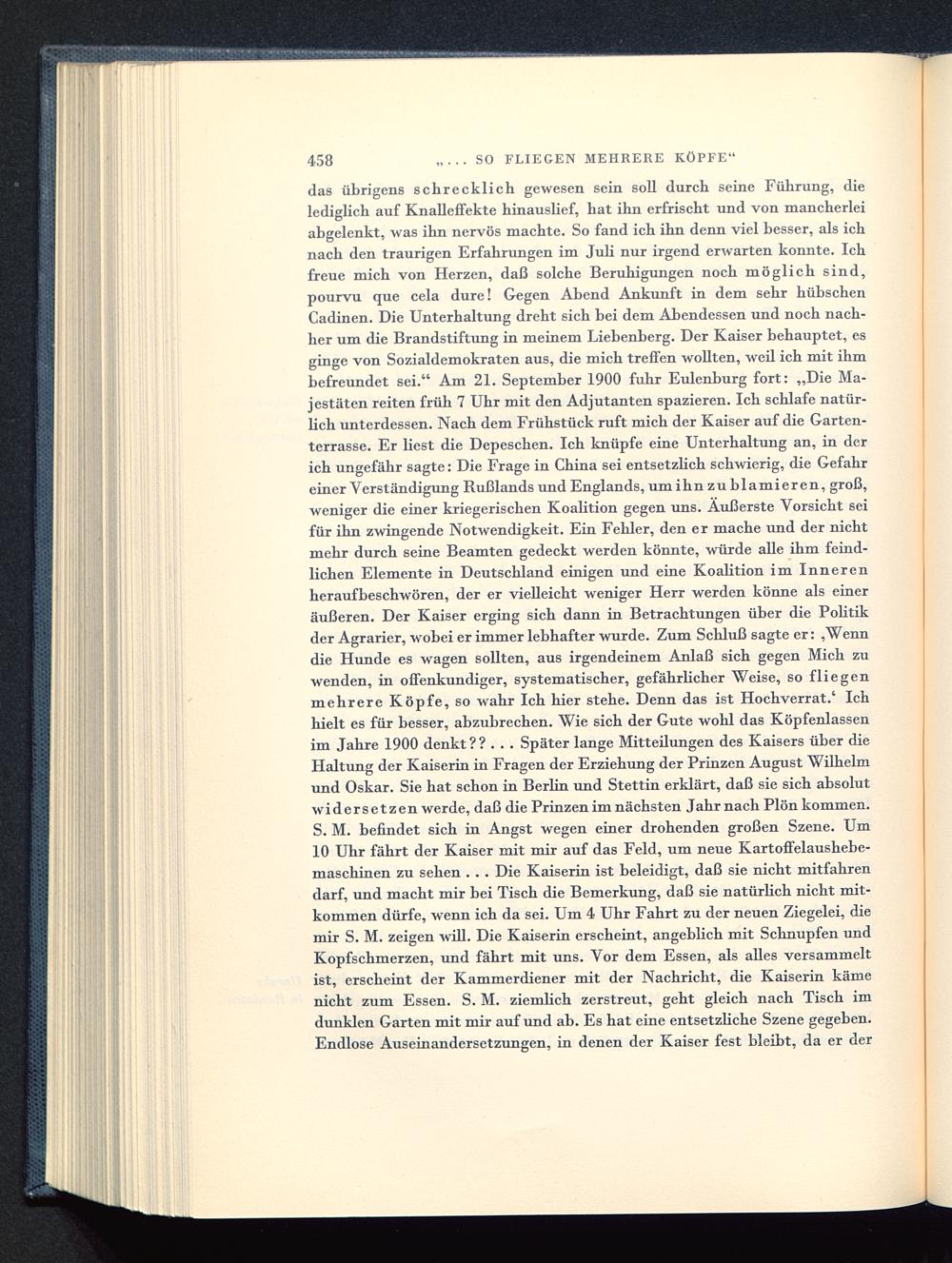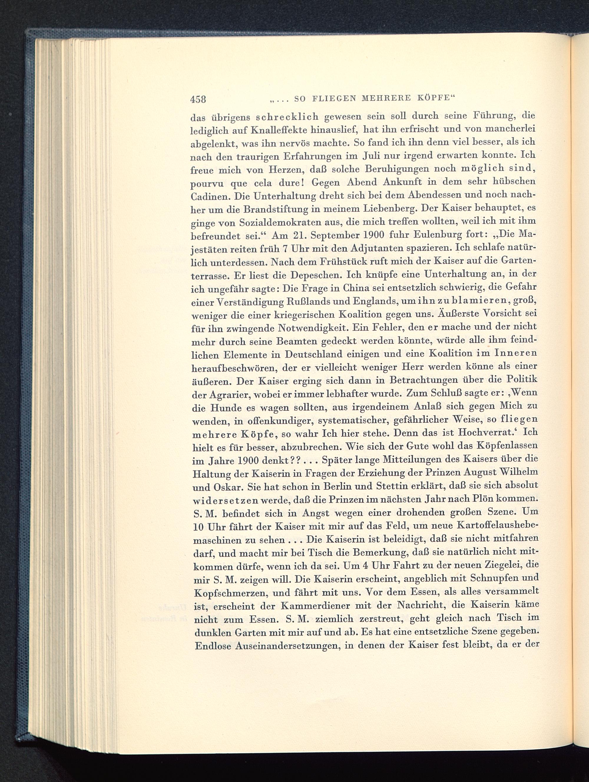 das übrigens schrecklich gewesen sein soll durch seine Führung, dielediglich auf Knalleffekte hinauslief, hat ihn erfrischt und von mancherleiabgelenkt, was ihn nervös machte. So fand ich ihn denn viel besser, als ichnach den traurigen Erfahrungen im Juli nur irgend erwarten konnte. Ichfreue mich von Herzen, daß solche Beruhigungen noch möglich sind,pourvu que cela dure! Gegen Abend Ankunft in dem sehr hübschenCadinen. Die Unterhaltung dreht sich bei dem Abendessen und noch nach-her um die Brandstiftung in meinem Liebenberg. Der Kaiser behauptet, esginge von Sozialdemokraten aus, die mich treffen wollten, weil ich mit ihmbefreundet sei." Am 21. September 1900 fuhr Eulenburg fort: „Die Ma-jestäten reiten früh 7 Uhr mit den Adjutanten spazieren. Ich schlafe natür-lich unterdessen. Nach dem Frühstück ruft mich der Kaiser auf die Garten-terrasse. Er liest die Depeschen. Ich knüpfe eine Unterhaltung an, in derich ungefähr sagte: Die Frage in China sei entsetzlich schwierig, die Gefahreiner Verständigung Rußlands und Englands , um ihnzublamieren, groß,weniger die einer kriegerischen Koalition gegen uns. Äußerste Vorsicht seifür ihn zwingende Notwendigkeit. Ein Fehler, den er mache und der nichtmehr durch seine Beamten gedeckt werden könnte, würde alle ihm feind-lichen Elemente in Deutschland einigen und eine Koabtion im Innerenheraufbeschwören, der er vielleicht weniger Herr werden könne als eineräußeren. Der Kaiser erging sich dann in Betrachtungen über die Politikder Agrarier, wobei er immer lebhafter wurde. Zum Schluß sagte er: ,Wenndie Hunde es wagen sollten, aus irgendeinem Anlaß sich gegen Mich zuwenden, in offenkundiger, systematischer, gefährbcher Weise, so fliegenmehrere Köpfe, so wahr Ich hier stehe. Denn das ist Hochverrat.' Ichhielt es für besser, abzubrechen. Wie sich der Gute wohl das Köpfenlassenim Jahre 1900 denkt ? ? . . . Später lange Mitteilungen des Kaisers über dieHaltung der Kaiserin in Fragen der Erziehung der Prinzen August Wilhelm und Oskar. Sie hat schon in Berlin und Stettin erklärt, daß sie sich absolutwidersetzen werde, daß die Prinzen im nächsten Jahr nach Plön kommen.S. M. befindet sich in Angst wegen einer drohenden großen Szene. Um10 Uhr fährt der Kaiser mit mir auf das Feld, um neue Kartoffelaushebe-maschinen zu sehen . . . Die Kaiserin ist beleidigt, daß sie nicht mitfahrendarf, und macht mir bei Tisch die Bemerkung, daß sie natürbch nicht mit-kommen dürfe, wenn ich da sei. Um 4 Uhr Fahrt zu der neuen Ziegelei, diemir S. M. zeigen will. Die Kaiserin erscheint, angebbch mit Schnupfen undKopfschmerzen, und fährt mit uns. Vor dem Essen, als alles versammeltist, erscheint der Kammerdiener mit der Nachricht, die Kaiserin kämenicht zum Essen. S. M. ziembch zerstreut, geht gleich nach Tisch imdunklen Garten mit mir auf und ab. Es hat eine entsetzbche Szene gegeben.Endlose Auseinandersetzungen, in denen der Kaiser fest bleibt, da er der