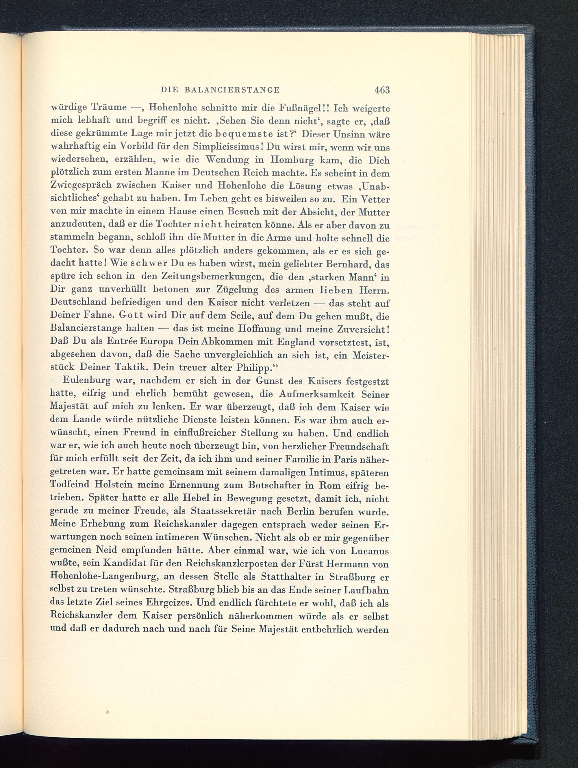 Eulenburg war, nachdem er sich in der Gunst des Kaisers festgestzthatte, eifrig und ehrlich bemüht gewesen, die Aufmerksamkeit SeinerMajestät auf mich zu lenken. Er war überzeugt, daß ich dem Kaiser wiedem Lande würde nützliche Dienste leisten können. Es war ihm auch er-wünscht, einen Freund in einflußreicher Stellung zu haben. Und endlichwar er, wie ich auch heute noch überzeugt bin, von herzlicher Freundschaftfür mich erfüllt seit der Zeit, da ich ihm und seiner Familie in Paris näher-getreten war. Er hatte gemeinsam mit seinem damaligen Intimus, späterenTodfeind Holstein meine Ernennung zum Botschafter in Rom eifrig be-trieben. Später hatte er alle Hebel in Bewegung gesetzt, damit ich, nichtgerade zu meiner Freude, als Staatssekretär nach Berlin berufen wurde.Meine Erhebung zum Reichskanzler dagegen entsprach weder seinen Er-wartungen noch seinen intimeren Wünschen. Nicht als ob er mir gegenübergemeinen Neid empfunden hätte. Aber einmal war, wie ich von Lucanuswußte, sein Kandidat für den Reichskanzlerposten der Fürst Hermann vonHohenlohe-Langenburg, an dessen Stelle als Statthalter in Straßburg erselbst zu treten wünschte. Straßburg blieb bis an das Ende seiner Laufbahndas letzte Ziel seines Ehrgeizes. Und endlich fürchtete er wohl, daß ich alsReichskanzler dem Kaiser persönlich näherkommen würde als er selbstund daß er dadurch nach und nach für Seine Majestät entbehrlich werden