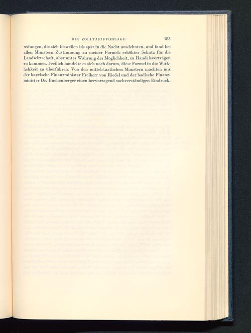 redungen, die sich bisweilen bis spät in die Nacht ausdehnten, und fand beiallen Ministern Zustimmung zu meiner Formel: erhöhter Schutz für dieLandwirtschaft, aber unter Wahrung der Möglichkeit, zu Handelsverträgenzu kommen. Freüich handelte es sich noch darum, diese Formel in die Wirk-lichkeit zu überführen. Von den mittelstaatlichen Ministern machten mirder bayrische Finanzminister Freiherr von Riedel und der badische Finanz-minister Dr. Buchenberger einen hervorragend sachverständigen Eindruck.