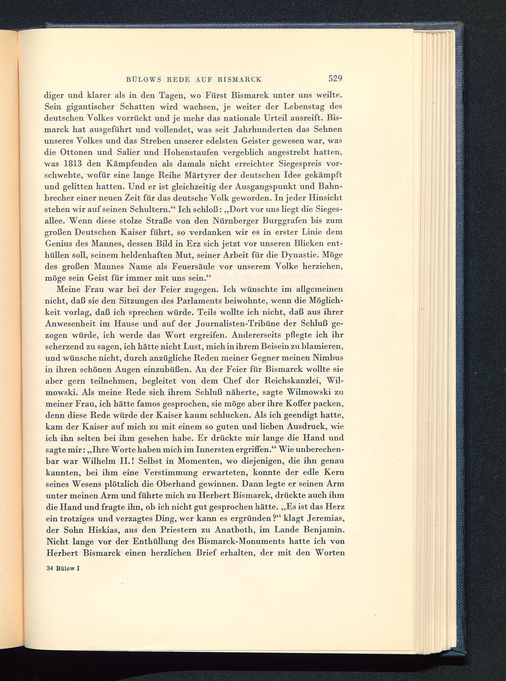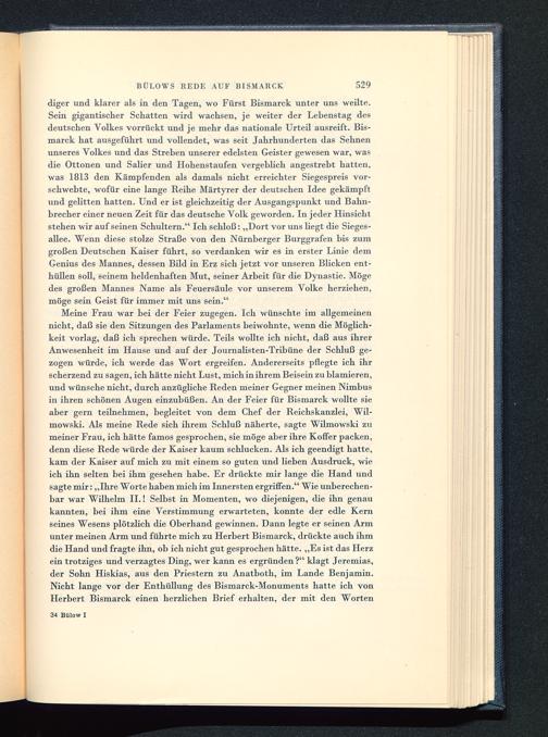 diger und klarer als in den Tagen, wo Fürst Bismarck unter uns weilte.Sein gigantischer Schatten wird wachsen, je weiter der Lebenstag desdeutschen Volkes vorrückt und je mehr das nationale Urteil ausreift. Bis-marck hat ausgeführt und vollendet, was seit Jahrhunderten das Sehnenunseres Volkes und das Streben unserer edelsten Geister gewesen war, wasdie Ottonen und Salier und Hohenstaufen vergeblich angestrebt hatten,was 1813 den Kämpfenden als damals nicht erreichter Siegespreis vor-schwebte, wofür eine lange Reihe Märtyrer der deutschen Idee gekämpftund gelitten hatten. Und er ist gleichzeitig der Ausgangspunkt und Bahn-brecher einer neuen Zeit für das deutsche Volk geworden. In jeder Hinsichtstehen wir auf seinen Schultern." Ich schloß: „Dort vor uns liegt die Sieges-allee. Wenn diese stolze Straße von den Nürnberger Burggrafen bis zumgroßen Deutschen Kaiser führt, so verdanken wir es in erster Linie demGenius des Mannes, dessen Bild in Erz sich jetzt vor unseren Blicken ent-hüllen soll, seinem heldenhaften Mut, seiner Arbeit für die Dynastie. Mögedes großen Mannes Name als Feuersäule vor unserem Volke herziehen,möge sein Geist für immer mit uns sein."
