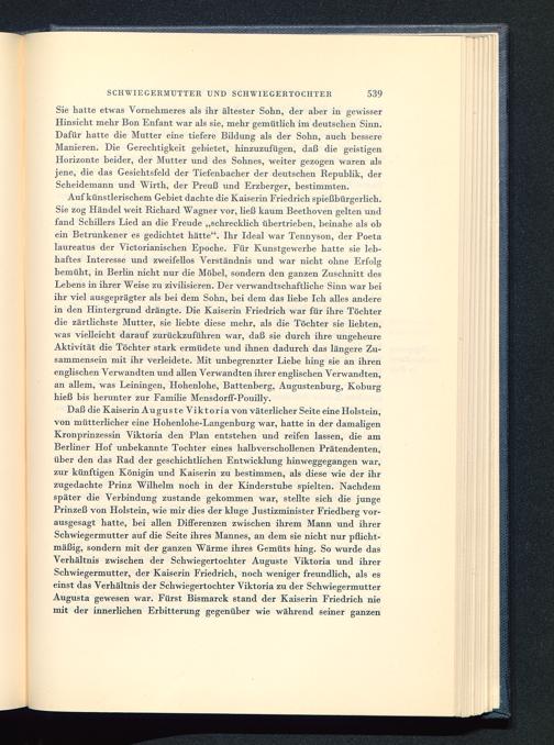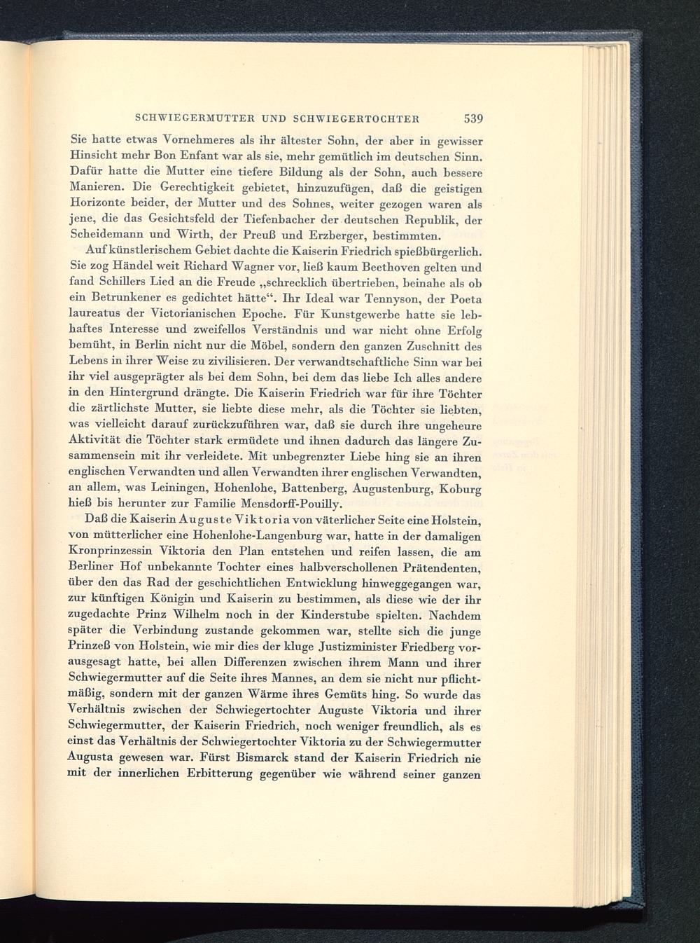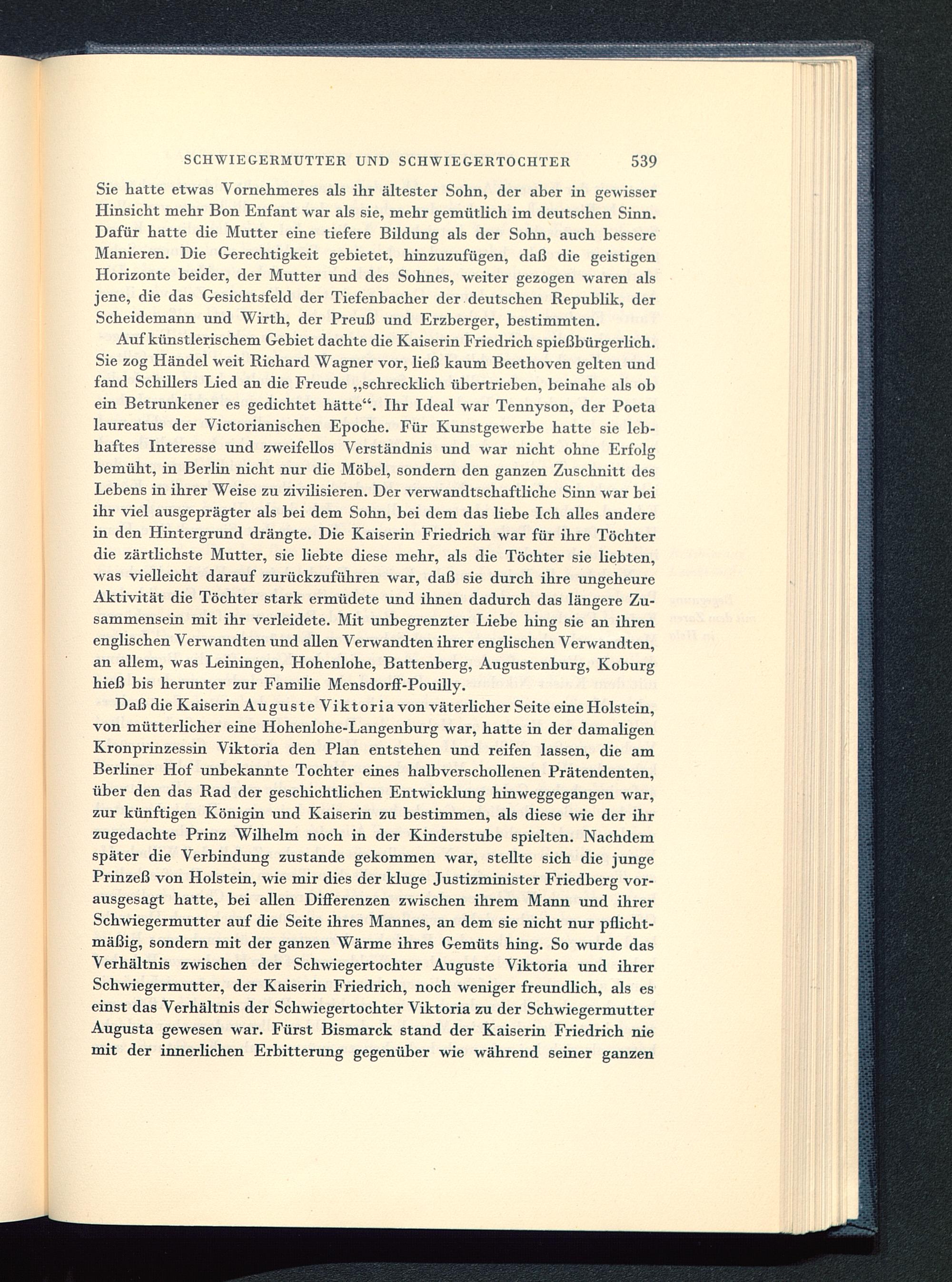 Auf künstlerischem Gebiet dachte die Kaiserin Friedrich spießbürgerhch.Sie zog Händel weit Richard Wagner vor, ließ kaum Beethoven gelten undfand Schillers Lied an die Freude „schrecklich übertrieben, beinahe als obein Betrunkener es gedichtet hätte". Ihr Ideal war Tennyson, der Poeta laureatus der Victorianischen Epoche. Für Kunstgewerbe hatte sie leb-haftes Interesse und zweifellos Verständnis und war nicht ohne Erfolgbemüht, in Berlin nicht nur die Möbel, sondern den ganzen Zuschnitt desLebens in ihrer Weise zu zivilisieren. Der verwandtschaftliche Sinn war beiihr viel ausgeprägter als bei dem Sohn, bei dem das liebe Ich alles anderein den Hintergrund drängte. Die Kaiserin Friedrich war für ihre Töchterdie zärtlichste Mutter, sie liebte diese mehr, als die Töchter sie bebten,was vielleicht darauf zurückzuführen war, daß sie durch ihre ungeheureAktivität die Töchter stark ermüdete und ihnen dadurch das längere Zu-sammensein mit ihr verleidete. Mit unbegrenzter Liebe hing sie an ihrenenglischen Verwandten und allen Verwandten ihrer englischen Verwandten,an allem, was Leiningen, Hohenlohe , Battenberg, Augustenburg, Koburghieß bis herunter zur Familie Mensdorff-Pouilly.
