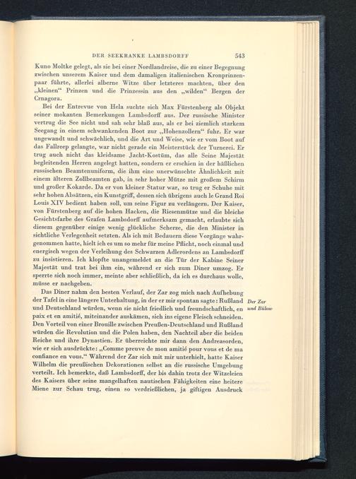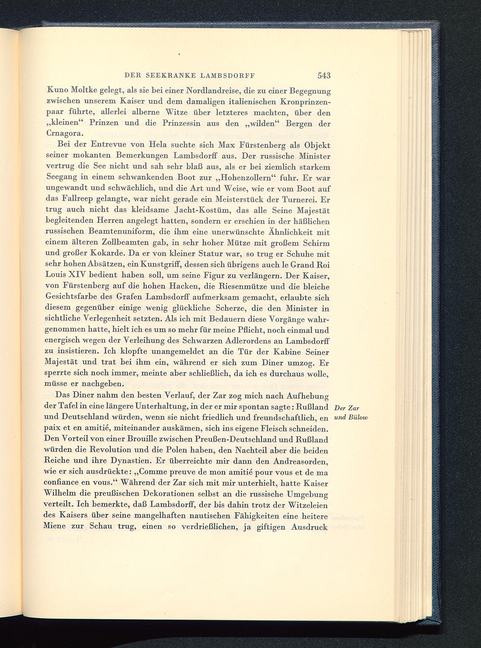 Bei der Entrevue von Heia suchte sich Max Fürstenberg als Objektseiner mokanten Bemerkungen Lambsdorff aus. Der russische Ministervertrug die See nicht und sah sehr blaß aus, als er bei ziemhch starkemSeegang in einem schwankenden Boot zur „Hohenzollern " fuhr. Er warungewandt und schwächlich, und die Art und Weise, wie er vom Boot aufdas Fallreep gelangte, war nicht gerade ein Meisterstück der Turnerei. Ertrug auch nicht das kleidsame Jacht-Kostüm, das alle Seine Majestätbegleitenden Herren angelegt hatten, sondern er erschien in der häßlichenrussischen Beamtenuniform, die ihm eine unerwünschte Ähnlichkeit miteinem älteren Zollbeamten gab, in sehr hoher Mütze mit großem Schirmund großer Kokarde. Da er von kleiner Statur war, so trug er Schuhe mitsehr hohen Absätzen, ein Kunstgriff, dessen sich übrigens auch le Grand RoiLouis XIV bedient haben soll, um seine Figur zu verlängern. Der Kaiser,von Fürstenberg auf die hohen Hacken, die Riesenmütze und die bleicheGesichtsfarbe des Grafen Lambsdorff aufmerksam gemacht, erlaubte sichdiesem gegenüber einige wenig glückliche Scherze, die den Minister insichtliche Verlegenheit setzten. Als ich mit Bedauern diese Vorgänge wahr-genommen hatte, hielt ich es um so mehr für meine Pflicht, noch einmal undenergisch wegen der Verleihung des Schwarzen Adlerordens an Lambsdorffzu insistieren. Ich klopfte unangemeldet an die Tür der Kabine SeinerMajestät und trat bei ihm ein, während er sich zum Diner umzog. Ersperrte sich noch immer, meinte aber schließlich, da ich es durchaus wolle,müsse er nachgeben.