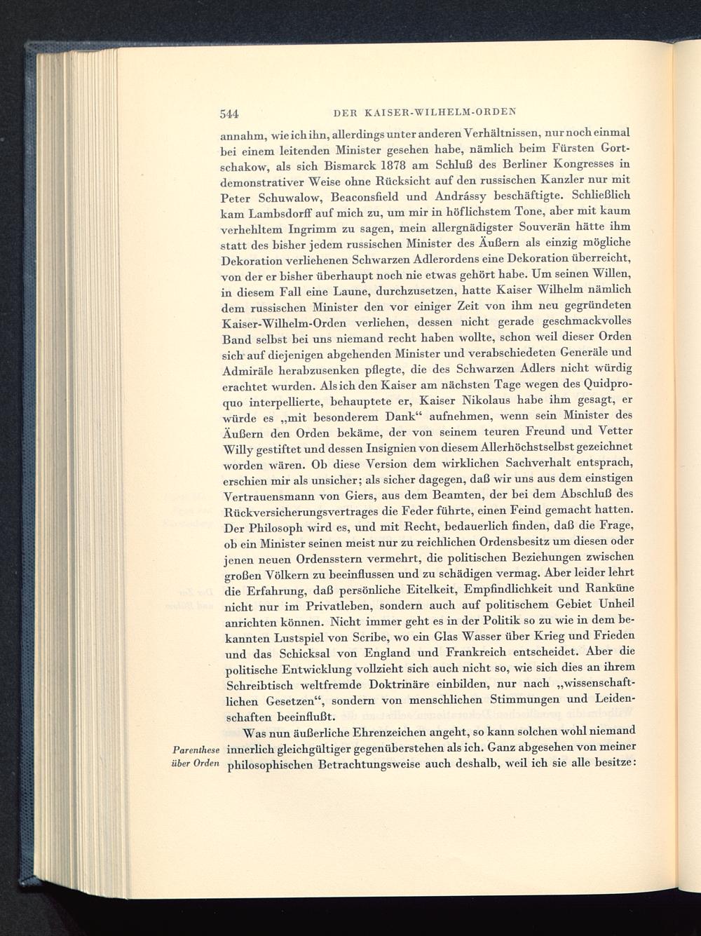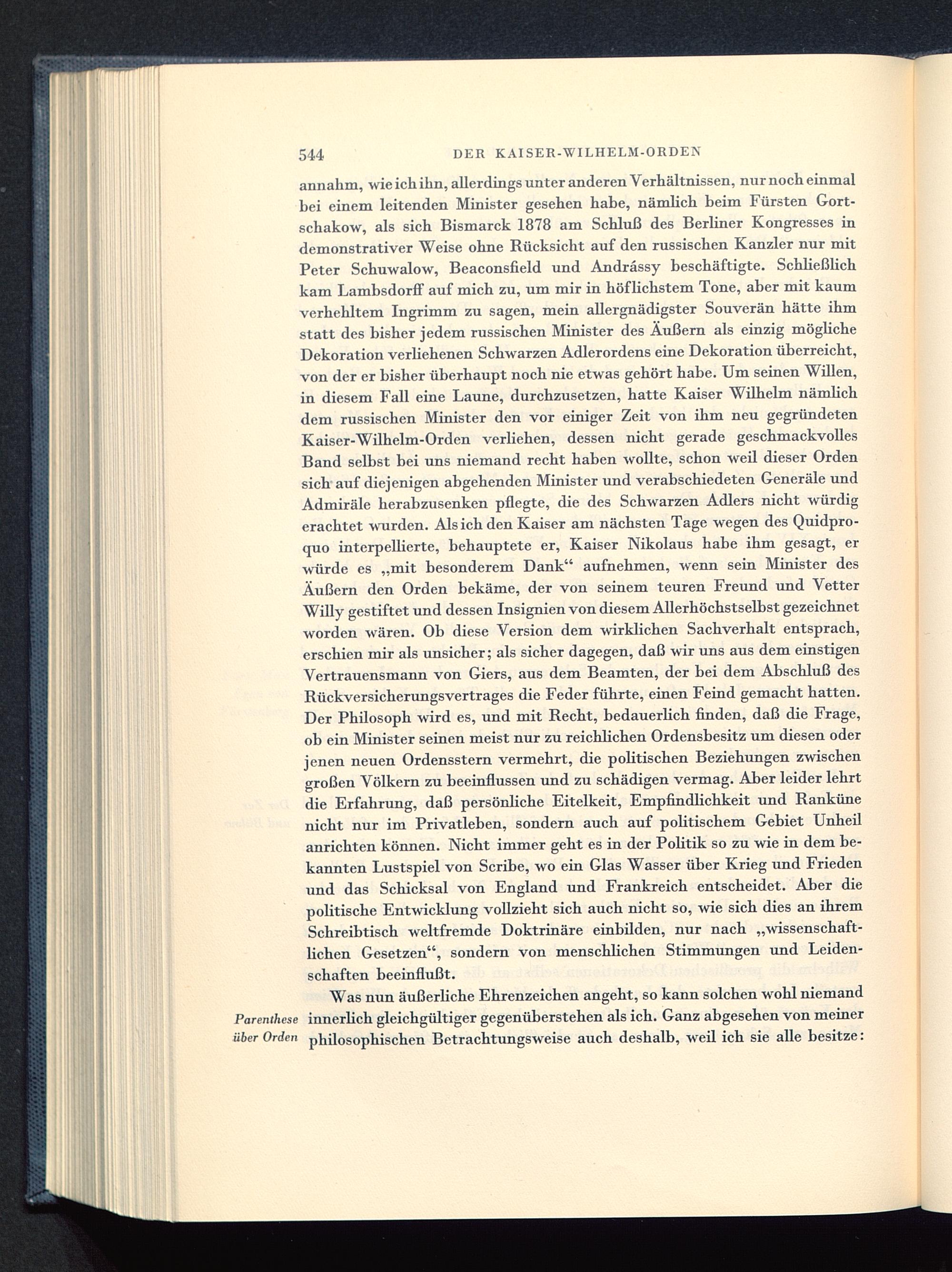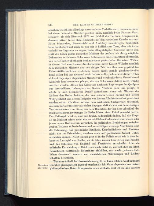 annahm, wie ich ihn, allerdings unter anderen Verhältnissen, nur noch einmalbei einem leitenden Minister gesehen habe, nämlich beim Fürsten Gort-schakow, als sich Bismarck 1878 am Schluß des Berliner Kongresses indemonstrativer Weise ohne Rücksicht auf den russischen Kanzler nur mitPeter Schuwalow, Beaconsfield und Andrässy beschäftigte. Schließlichkam Lambsdorff auf mich zu, um mir in höflichstem Tone, aber mit kaumverhehltem Ingrimm zu sagen, mein allergnädigster Souverän hätte ihmstatt des bisher jedem russischen Minister des Äußern als einzig möglicheDekoration verliehenen Schwarzen Adlerordens eine Dekoration überreicht,von der er bisher überhaupt noch nie etwas gehört habe. Um seinen Willen,in diesem Fall eine Laune, durchzusetzen, hatte Kaiser Wilhelm nämlichdem russischen Minister den vor einiger Zeit von ihm neu gegründetenKaiser-Wilhelm-Orden verliehen, dessen nicht gerade geschmackvollesBand selbst bei uns niemand recht haben wollte, schon weil dieser Ordensich auf diejenigen abgehenden Minister und verabschiedeten Generäle undAdmiräle herabzusenken pflegte, die des Schwarzen Adlers nicht würdigerachtet wurden. Als ich den Kaiser am nächsten Tage wegen des Quidpro-quo interpellierte, behauptete er, Kaiser Nikolaus habe ihm gesagt, erwürde es „mit besonderem Dank" aufnehmen, wenn sein Minister desÄußern den Orden bekäme, der von seinem teuren Freund und VetterWilly gestiftet und dessen Insignien von diesem Allerhöchstselbst gezeichnetworden wären. Ob diese Version dem wirklichen Sachverhalt entsprach,erschien mir als unsicher; als sicher dagegen, daß wir uns aus dem einstigenVertrauensmann von Giers, aus dem Beamten, der bei dem Abschluß desRückVersicherungsvertrages die Feder führte, einen Feind gemacht hatten.Der Philosoph wird es, und mit Recht, bedauerlich finden, daß die Frage,ob ein Minister seinen meist nur zu reichlichen Ordensbesitz um diesen oderjenen neuen Ordensstern vermehrt, die politischen Beziehungen zwischengroßen Völkern zu beeinflussen und zu schädigen vermag. Aber leider lehrtdie Erfahrung, daß persönliche Eitelkeit, Empfindlichkeit und Rankünenicht nur im Privatleben, sondern auch auf politischem Gebiet Unheilanrichten können. Nicht immer geht es in der Politik so zu wie in dem be-kannten Lustspiel von Scribe, wo ein Glas Wasser über Krieg und Friedenund das Schicksal von England und Frankreich entscheidet. Aber diepolitische Entwicklung vollzieht sich auch nicht so, wie sich dies an ihremSchreibtisch weltfremde Doktrinäre einbilden, nur nach „wissenschaft-lichen Gesetzen", sondern von menschlichen Stimmungen und Leiden-schaften beeinflußt.