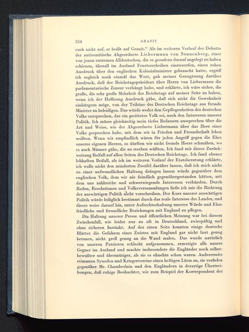 euch nicht auf, er beißt auf Granit." Als im weiteren Verlauf der Debatteder antisemitische Abgeordnete Liebermann von Sonnenberg , einervon jenen extremen Alldeutschen, die es geradezu darauf angelegt zu habenschienen, überall im Ausland Fensterscheiben einzuwerfen, einen rohenAusdruck über den englischen Kolonialminister gebraucht hatte, ergriffich sogleich noch einmal das Wort, gab meiner Genugtuung darüberAusdruck, daß der Reichstagspräsident über Herrn von Liebermann dieparlamentarische Zensur verhängt habe, und erklärte, ich wäre sicher, diegroße, die sehr große Mehrheit des Reichstags auf meiner Seite zu haben,wenn ich der Hoffnung Ausdruck gäbe, daß sich nicht die Gewohnheiteinbürgern möge, von der Tribüne des Deutschen Reichstags aus fremdeMinister zu beleidigen. Das würde weder den Gepflogenheiten des deutschenVolks entsprechen, das ein gesittetes Volk sei, noch den Interessen unsererPolitik. Ich müsse gleichzeitig mein tiefes Bedauern aussprechen über dieArt und Weise, wie der Abgeordnete Liebermarm über das Heer einesVolks gesprochen habe, mit dem wir in Frieden und Freundschaft lebenwollten. Wenn wir empfindHch wären für jeden Angriff gegen die Ehreunseres eigenen Heeres, so dürften wir nicht fremde Heere schmähen, woes auch Männer gäbe, die zu sterben wüßten. Ich fand mit dieser Zurück-weisung Beifall auf allen Seiten des Deutschen Reichstags. Ich fand ebensolebhaften Beifall, als ich im weiteren Verlauf der Etatsberatung erklärte,ich wolle nicht den mindesten Zweifel darüber lassen, daß ich mich nichtzu einer unfreundlichen Haltung drängen lassen würde gegenüber demenglischen Volk, dem wir nie feindlich gegenübergestanden hätten, mitdem uns zahlreiche und schwerwiegende Interessen verbänden. DurchReden, Resolutionen und Volksversammlungen Heße ich mir die Richtungder auswärtigen Politik nicht vorschreiben. Der Kurs unserer auswärtigenPobtik würde ledigbch bestimmt durch das reale Interesse des Landes, unddieses weise darauf hin, unter Aufrechterhaltung unserer Würde und Ehrefriedbche und freundliche Beziehungen mit England zu pflegen.