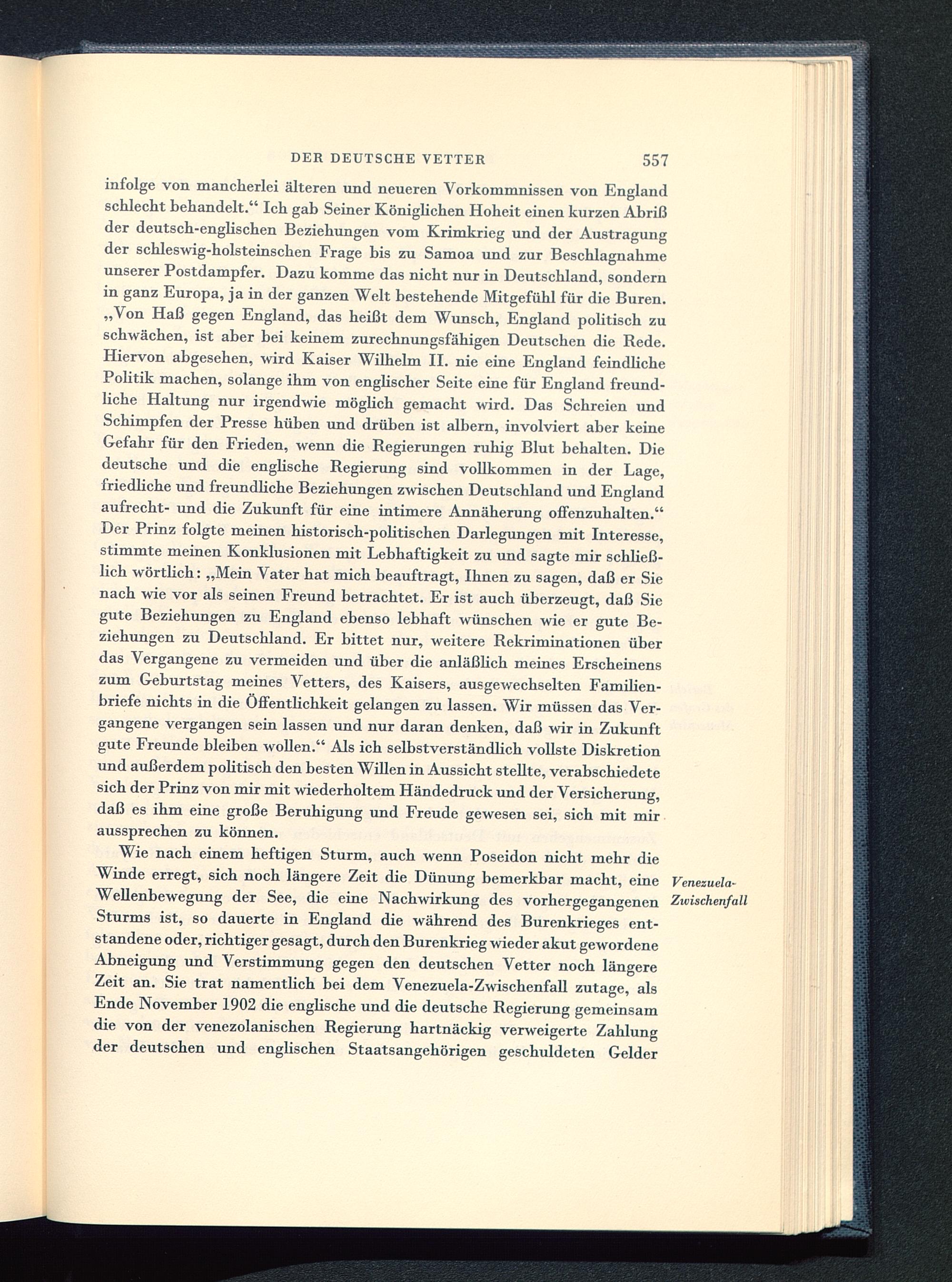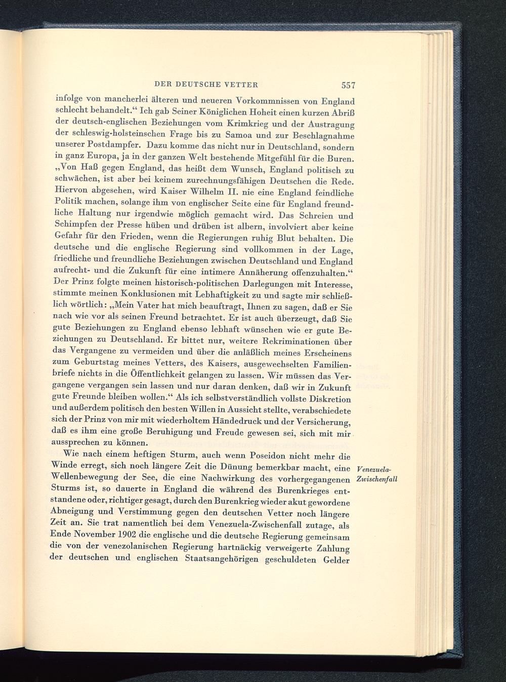 infolge von mancherlei älteren und neueren Vorkommnissen von England schlecht behandelt." Ich gab Seiner Königlichen Hoheit einen kurzen Abrißder deutsch-englischen Beziehungen vom Krim krieg und der Austragungder schleswig -holsteinschen Frage bis zu Samoa und zur Beschlagnahmeunserer Postdampfer. Dazu komme das nicht nur in Deutschland , sondernin ganz Europa , ja in der ganzen Welt bestehende Mitgefühl für die Buren.„Von Haß gegen England, das heißt dem Wunsch, England politisch zuschwächen, ist aber bei keinem zurechnungsfähigen Deutschen die Rede.Hiervon abgesehen, wird Kaiser Wilhelm II. nie eine England feindlichePolitik machen, solange ihm von engbscher Seite eine für England freund-liche Haltung nur irgendwie möglich gemacht wird. Das Schreien undSchimpfen der Presse hüben und drüben ist albern, involviert aber keineGefahr für den Frieden, wenn die Regierungen ruhig Blut behalten. Diedeutsche und die englische Regierung sind vollkommen in der Lage,friedliche und freundliche Beziehungen zwischen Deutschland und England aufrecht- und die Zukunft für eine intimere Annäherung offenzuhalten."Der Prinz folgte meinen historisch-politischen Darlegungen mit Interesse,stimmte meinen Konklusionen mit Lebhaftigkeit zu und sagte mir schließ-lich wörtlich: „Mein Vater hat mich beauftragt, Ihnen zu sagen, daß er Sienach wie vor als seinen Freund betrachtet. Er ist auch überzeugt, daß Siegute Beziehungen zu England ebenso lebhaft wünschen wie er gute Be-ziehungen zu Deutschland . Er bittet nur, weitere Rekriminationen überdas Vergangene zu vermeiden und über die anläßlich meines Erscheinenszum Geburtstag meines Vetters, des Kaisers, ausgewechselten Familien-briefe nichts in die Öffentlichkeit gelangen zu lassen. Wir müssen das Ver-gangene vergangen sein lassen und nur daran denken, daß wir in Zukunftgute Freunde bleiben wollen." Als ich selbstverständlich vollste Diskretionund außerdem politisch den besten Willen in Aussicht stellte, verabschiedetesich der Prinz von mir mit wiederholtem Händedruck und der Versicherung,daß es ihm eine große Beruhigung und Freude gewesen sei, sich mit miraussprechen zu können.