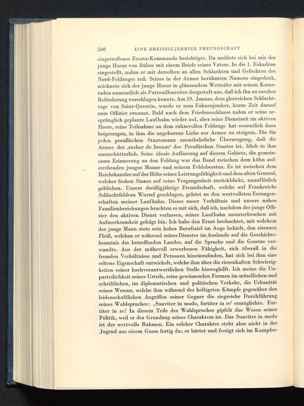 eingetroffenes Ersatz-Kommando besichtigte. Da meldete sich bei mir derjunge Husar von Bülow mit einem Briefe seines Vaters. In die 1. Eskadroneingestellt, nahm er mit derselben an allen Schlachten und Gefechten desNord-Feldzuges teil. Seines in der Armee berühmten Namens eingedenk,zeichnete sich der junge Husar in glänzendem Wetteifer mit seinen Kame-raden namentlich als Patrouillenreiter dergestalt aus, daß ich ihn zu rascherBeförderung vorschlagen konnte. Am 19. Januar, dem glorreichen Schlacht-tage von Saint-Quentin, wurde er zum Fahnenjunker, kurze Zeit daraufzum Offizier ernannt. Bald nach dem Friedensschlüsse nahm er seine ur-sprünglich geplante Laufbahn wieder auf, aber seine Dienstzeit im aktivenHeere, seine Teilnahme an dem ruhmvollen Feldzuge hat wesentlich dazubeigetragen, in ihm die angeborene Liebe zur Armee zu steigern. Die fürjeden preußischen Staatsmann unentbehrliche Uberzeugung, daß dieArmee der ,rocher de bronze' des Preußischen Staates ist, blieb in ihmunerschütterlich. Seine ideale Auffassung auf diesem Gebiete, die gemein-same Erinnerung an den Feldzug war das Band zwischen dem kühn auf-strebenden jungen Manne und seinem Feldobersten. Es ist zwischen demReichskanzler auf der Höhe seiner Leistungsfähigkeit und dem alten General,welcher frohen Sinnes auf seine Vergangenheit zurückbbekt, unauflöslichgeblieben. Unsere dreißigjährige Freundschaft, welche auf Frankreichs Schlachtfeldern Wurzel geschlagen, gehört zu den wertvollsten Errungen-schaften meiner Laufbahn. Dieses unser Verhältnis und unsere nahenFamüienbeziehungen brachten es mit sich, daß ich, nachdem der junge Offi-zier den aktiven Dienst verlassen, seiner Laufbahn ununterbrochen mitAufmerksamkeit gefolgt bin. Ich habe den Ernst beobachtet, mit welchemder junge Mann stets sein hohes Berufsziel im Auge behielt, den eisernenFleiß, welchen er während seines Dienstes im Auslande auf die Geschichts-kenntnis des betreffenden Landes, auf die Sprache und die Gesetze ver-wandte. Aus der mühevoll erworbenen Fähigkeit, sich überall in diefremden Verhältnisse und Personen hineinzufinden, hat sich bei ihm eineseltene Eigenschaft entwickelt, welche ihm über die riesenhaften Schwierig-keiten seiner hochverantwortüchen Stelle hinweghilft. Ich meine die Un-parteilichkeit seines Urteils, seine gewinnenden Formen im mündlichen undschriftlichen, im diplomatischen und politischen Verkehr, die Urbanitätseines Wesens, welche ihm während der heftigsten Kämpfe gegenüber denleidenschaftlichen Angriffen seiner Gegner die siegreiche Durchführungseines Wahlspruches: ,Suaviter in modo, fortiter in re'ermöglichte. For-titer in re! In diesem Teile des Wahlspruches gipfelt das Wesen seinerPolitik, weil er der Grundzug seines Charakters ist. Das Suaviter in modoist der wertvolle Rahmen. Ein solcher Charakter steht aber nicht in derJugend aus einem Gusse fertig da; er härtet und festigt sich im Kampfes-