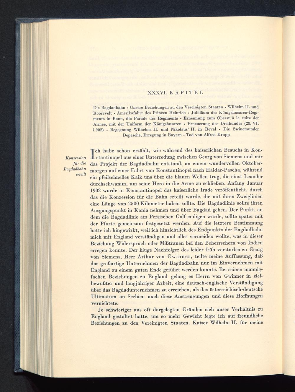 Die Bagdadbahn • Unsere Beziehungen zu den Vereinigten Staaten • Wilhelm II. undRoosevelt • Amerikafahrt des Prinzen Heinrich • Jubiläum des Königshusaren-Regi-ments in Bonn , die Parade des Regiments • Ernennung zum Oberst ä la suite derArmee, mit der Uniform der Königshusaren • Erneuerung des Dreibundes (28. VI.1 902) • Begegnung Wilhelms II. und Nikolaus' II. in Reval • Die SwinemünderDepesche, Erregung in Bayern • Tod von Alfred Krupp