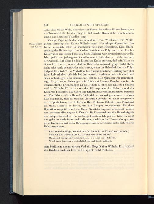 Wenige Tage nach der Zusammenkunft von Wiesbaden und Wolfs-Hahoperation garten unterzog sich Kaiser Wilhelm einer Stimmlippen-Operation. Derdes Kaisers Kaiser verspürte schon in Wiesbaden eine leise Heiserkeit. Eine Unter-suchung des Halses ergab das Vorhandensein eines Polypen. Ich suchte denKaiser noch am selben Tage auf. Seine Haltung war bewunderungswürdig.Ich appelliere an jeden gerecht und human Urteilenden: wo ist der Mensch,der, wissend, daß seine beiden Eltern am Krebs starben, daß sein Vater aneinem furchtbaren, schmerzhaften Halskrebs zugrunde ging, nicht stark,nicht sehr stark beeindruckt sein würde, wenn im Halse bei ihm ein Polypfestgestellt würde ? Das Verhalten des Kaisers bei dieser Prüfung war überjedes Lob erhaben. Als ich bei ihm eintrat, winkte er mir mit der Handeinen wehmütigen, aber herzlichen Gruß zu. Das Sprechen war ihm unter-sagt. Er gab seine Weisungen schriftlich auf kleinen Zetteln, was in mirmelancholische Erinnerungen an die letzten Wochen des Kaisers Friedrichweckte. Wilhelm II. hatte trotz des Widerspruchs der Kaiserin und derLeibärzte bestimmt, daß über seine Erkrankung wahrheitsgetreue Berichteveröffentlicht werden sollten. Es dürfe nichts verschwiegen werden, das Volkhabe ein Becht, alles zu erfahren. Es wurde beschlossen, einen ausgezeich-neten Spezialisten, den Geheimen Bat Professor Schmidt aus Frankfurtam Main , kommen zu lassen, um den Polypen zu operieren. Bis dieseOperation ausgeführt und das kleine Gewächs sorgsam untersucht wordenwar, erschien alles ungewiß. Erst als die Untersuchung die Harmlosigkeitdes Polypen feststellte, war die Sorge behoben. Ich gab der Kaiserin rechtund gebe ihr auch heute recht, die mir, nachdem die Untersuchung statt-gefunden hatte, mit tiefer Bewegung schrieb, der Kaiser habe sich wie einHeld benommen.
