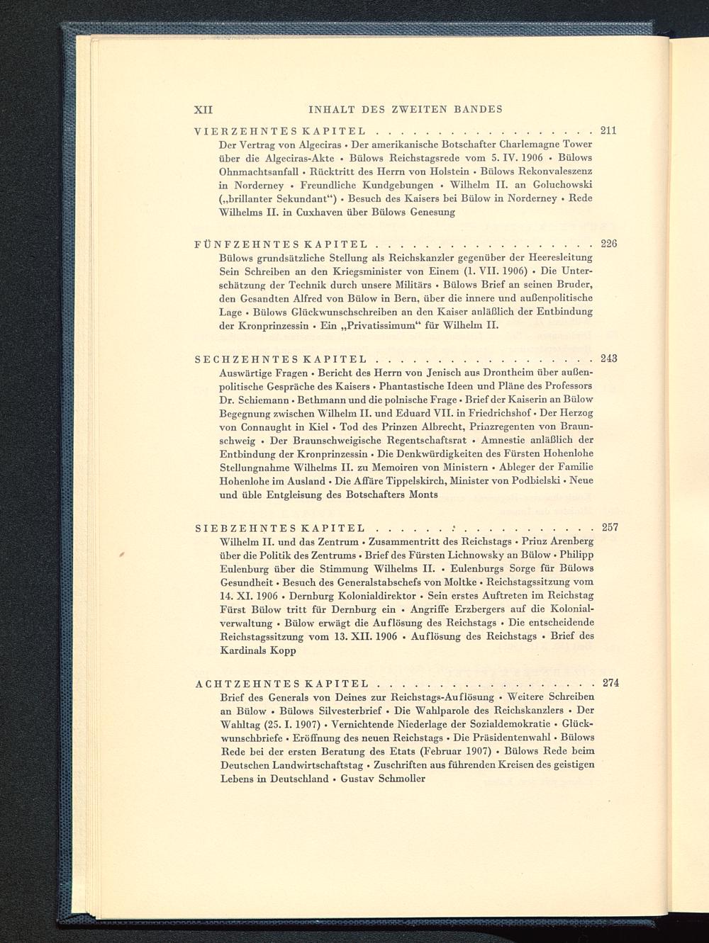 Brief des Generals von Deines zur Reichstags-Au flösung • Weitere Schreibenan Bülow • Bülows Silvesterbrief • Die Wahlparole des Reichskanzlers • DerWahltag (25. I. 1907) • Vernichtende Niederlage der Sozialdemokratie • Glück-wunschbriefe • Eröffnung des neuen Reichstags • Die Präsidentenwahl • BülowsRede bei der ersten Beratung des Etats (Februar 1907) • Bülows Rede beimDeutschen Landwirtschaftstag • Zuschriften aus führenden Kreisen des geistigenLebens in Deutschland • Gustav Schmoller