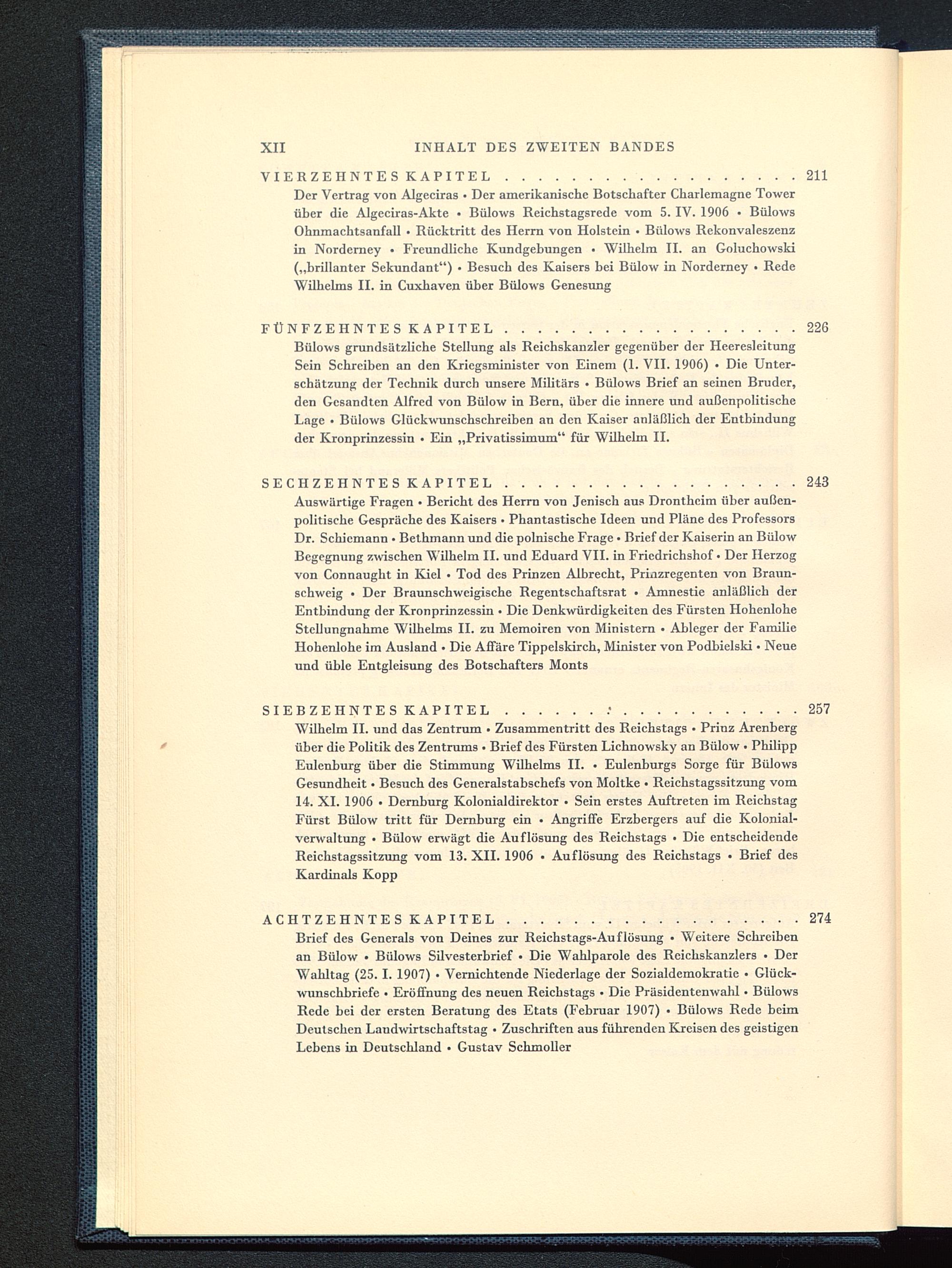 Wilhelm II. und das Zentrum • Zusammentritt des Reichstags • Prinz Arenbergüber die Politik des Zentrums • Brief des Fürsten Lichnowsky an Bülow • PhilippEulenburg über die Stimmung Wilhelms II. • Eulenburgs Sorge für BülowsGesundheit • Besuch des Generalstabschefs von Moltke • Reichstagssitzung vom14. XI. 1906 • Dernburg Kolonialdirektor • Sein erstes Auftreten im ReichstagFürst Bülow tritt für Dernburg ein • Angriffe Erzbergers auf die Kolonial-verwaltung • Bülow erwägt die Auflösung des Reichstags • Die entscheidendeReichstagssitzung vom 13. XII. 1906 • Auflösung des Reichstags • Brief desKardinals Kopp