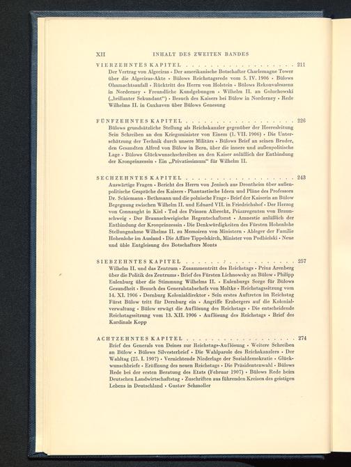 Bülows grundsätzliche Stellung als Reichskanzler gegenüber der HeeresleitungSein Schreiben an den Kriegsminister von Einem (1. VII. 1906) • Die Unter-schätzung der Technik durch unsere Militärs • Bülows Brief an seinen Bruder,den Gesandten Alfred von Bülow in Bern , über die innere und außenpolitischeLage • Bülows Glückwunschschreiben an den Kaiser anläßlich der Entbindungder Kronprinzessin • Ein „Privatissimum" für Wilhelm II.
