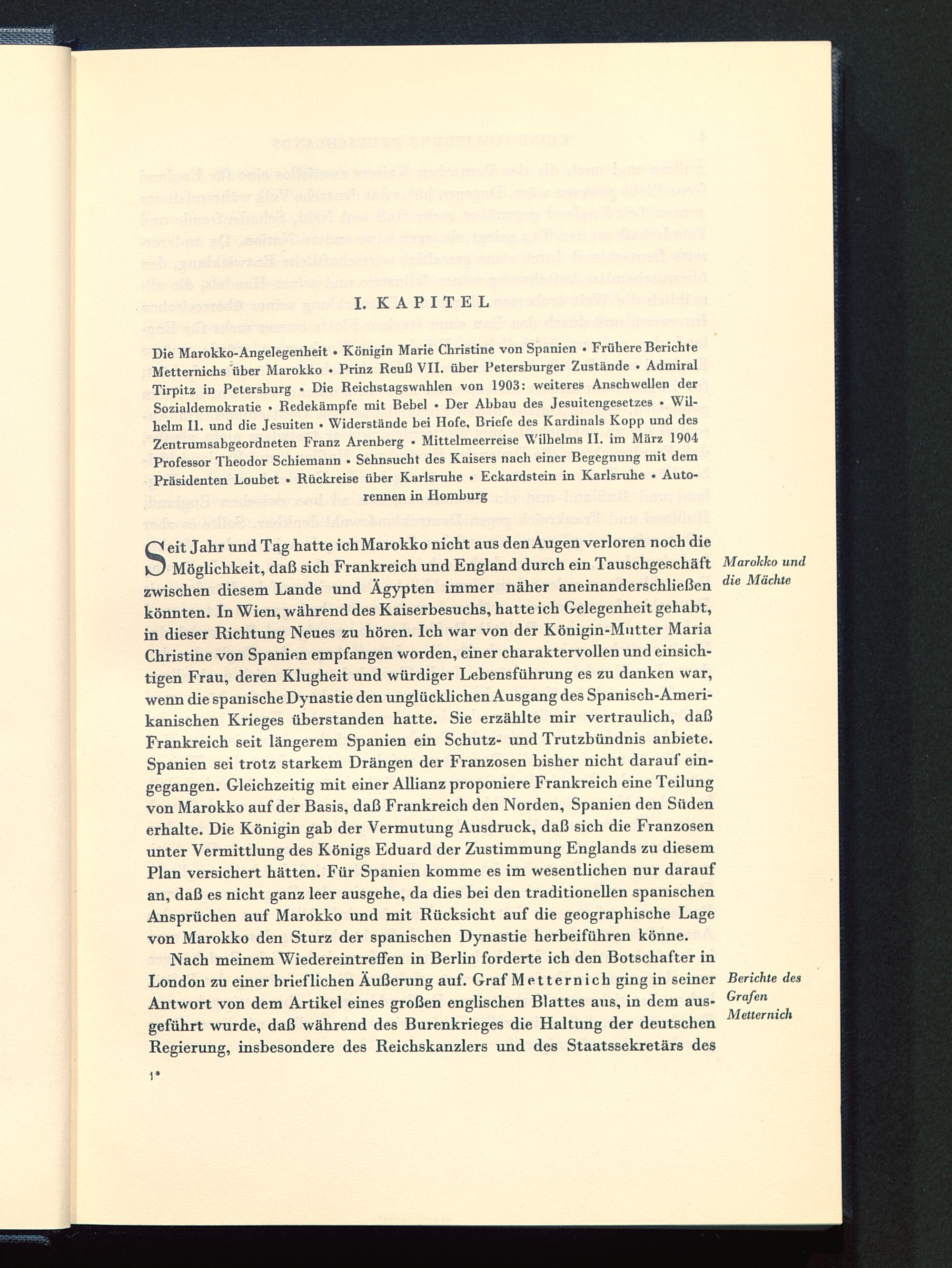 Die Marokko-Angelegenheit • Königin Marie Christine von Spanien • Frühere BerichteMetternichs über Marokko • Prinz Reuß VII. über Petersburger Zustände • AdmiralTirpitz in Petersburg • Die Reichstagswahlen von 1903: weiteres Anschwellen derSozialdemokratie • Redekämpfe mit Bebel • Der Abbau des Jesuitengesetzes • Wil-helm II. und die Jesuiten • Widerstände bei Hofe, Briefe des Kardinals Kopp und desZentrumsabgeordneten Franz Arenberg • Mittelmeerreise Wilhelms II. im März 1904Professor Theodor Schiemann . Sehnsucht des Kaisers nach einer Begegnung mit demPräsidenten Loubet • Rückreise über Karlsruhe • Eckardstein in Karlsruhe • Auto-rennen in Homburg