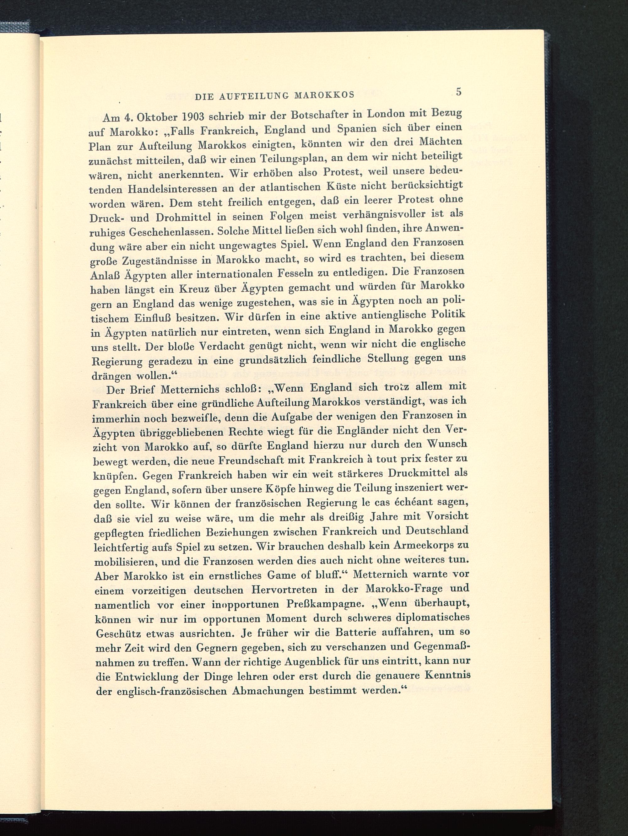 Am 4. Oktober 1903 schrieb mir der Botschafter in London mit Bezugauf Marokko: „Falls Frankreich, England und Spanien sich über einenPlan zur Aufteilung Marokkos einigten, könnten wir den drei Mächtenzunächst mitteilen, daß wir einen Teilungsplan, an dem wir nicht beteiligtwären, nicht anerkennten. Wir erhöben also Protest, weil unsere bedeu-tenden Handelsinteressen an der atlantischen Küste nicht berücksichtigtworden wären. Dem steht freüich entgegen, daß ein leerer Protest ohneDruck- und Drohmittel in seinen Folgen meist verhängnisvoller ist alsruhiges Geschehenlassen. Solche Mittel ließen sich wohl finden, ihre Anwen-dung wäre aber ein nicht ungewagtes Spiel. Wenn England den Franzosengroße Zugeständnisse in Marokko macht, so wird es trachten, bei diesemAnlaß Ägypten aller internationalen Fesseln zu entledigen. Die Franzosenhaben längst ein Kreuz über Ägypten gemacht und würden für Marokko gern an England das wenige zugestehen, was sie in Ägypten noch an poli-tischem Einfluß besitzen. Wir dürfen in eine aktive antienglische Politikin Ägypten natürlich nur eintreten, wenn sich England in Marokko gegenuns stellt. Der blo(Je Verdacht genügt nicht, wenn wir nicht die englischeRegierung geradezu in eine grundsätzüch feindliche Stellung gegen unsdrängen wollen."