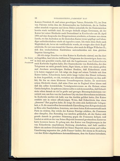 Als ich einige Stunden vor dem Kaiser in Karlsruhe eintraf, um ihn dortDer Kaiser zu begrüßen, fand ich ein chiffriertes Telegramm des Auswärtigen Amts vor,und m d em m i r gemeldet wurde, daß sich der Legationsrat von Eckardsteinnach Karlsruhe begeben habe. Der Staatssekretär von Richthofen, der diesTelegramm an mich gesandt hatte, fügte hinzu, er höre von einem großenund durchaus zuverlässigen Berliner Bankier, daß Eckardstein starkä la baisse engagiert sei. Ich möge ein Auge auf seinen Verkehr mit demKaiser haben. Eckardstein hatte nicht lange vorher den Dienst verlassen,in dem Augenblick, wo ich, trotzdem mir allmählich manches an ihm miß-fiel, für ihn an einen kleineren Gesandtenposten dachte. Er motivierteseinen Rücktritt damit, daß seine Frau nur in England leben könne unddaß ihn selbst beträchtliche Vermögensinteressen an die Heimat seinerGattin knüpften. In späteren Jahren sollte es sich herausstellen, daß Eckard-stein schon damals zu tief in große und gewagte Börsenspekulationen ver-wickelt war, um fern von der Londoner City ein Amt übernehmen zu können.In Karlsruhe merkte ich bald, was ihn dorthin geführt hatte. Der Kaisererzählte mir in seiner offenherzigen Weise, daß Eckardstein ihm einen„famosen" Rat gegeben habe. Er möge die erste sich darbietende Gelegen-heit, z. B. die unmittelbar bevorstehende Einweihung eines Kriegerdenkmalsin Metz oder Saarbrücken, benutzen, um einen festen Kaltwasserstrahl nachParis zu richten. Das würde des Kaisers Prestige erhöhen, die Franzosenaber dämpfen. Der Ratschlag war insofern gefährlich, als der Kaiser sichgerade damals in gereizter Stimmung gegen die Franzosen befand, weilLoubet es nicht zu der von Seiner Majestät brennend gewünschten Entrevuehatte kommen lassen. Es gelang mir, den Kaiser von Entgleisungen in dervon Eckardstein empfohlenen Richtung abzuhalten, und bald nachherführte ein anderer Zwischenfall bei Seiner Majestät einen neuen und vollenUmschwung zugunsten der „belle France" herbei. Bei einem in Homburgvor der Höhe abgehaltenen Automobilrennen, dem der Kaiser beiwohnte,