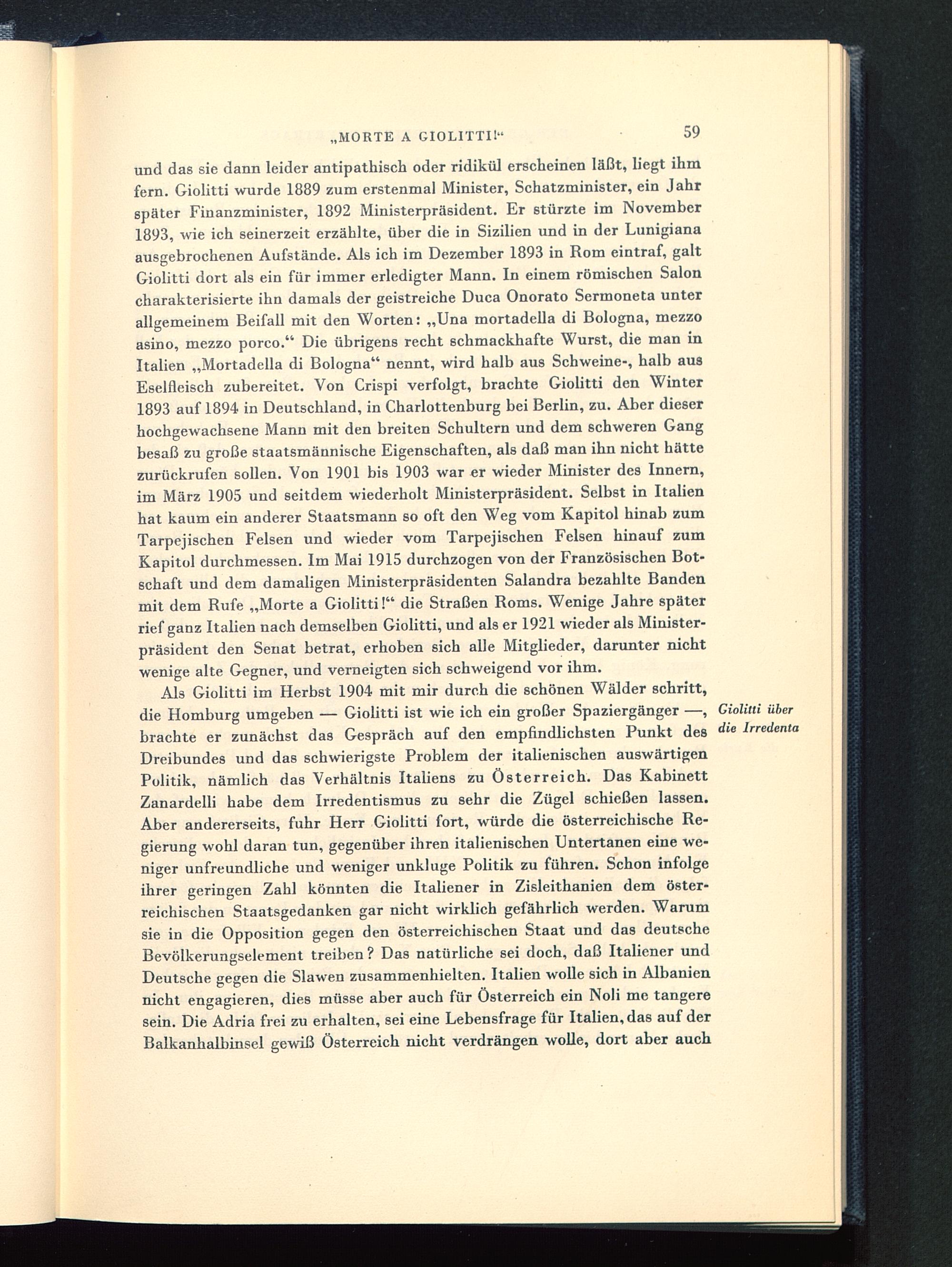 und das sie dann leider antipathisch oder ridikül erscheinen läßt, liegt ihmfern. Giolitti wurde 1889 zum erstenmal Minister, Schatzminister, ein Jahrspäter Finanzminister, 1892 Ministerpräsident. Er stürzte im November1893, wie ich seinerzeit erzählte, über die in Sizilien und in der Lunigianaausgebrochenen Aufstände. Als ich im Dezember 1893 in Rom eintraf, galtGiolitti dort als ein für immer erledigter Mann. In einem römischen Saloncharakterisierte ihn damals der geistreiche Duca Onorato Sermoneta unterallgemeinem Beifall mit den Worten: „Una mortadella di Bologna, mezzoasino, mezzo porco." Die übrigens recht schmackhafte Wurst, die man inItalien „Mortadella di Bologna" nennt, wird halb aus Schweine-, halb ausEselfleisch zubereitet. Von Crispi verfolgt, brachte Giolitti den Winter1893 auf 1894 in Deutschland, in Charlottenburg bei Berlin , zu. Aber dieserhochgewachsene Mann mit den breiten Schultern und dem schweren Gangbesaß zu große staatsmännische Eigenschaften, als daß man ihn nicht hättezurückrufen sollen. Von 1901 bis 1903 war er wieder Minister des Innern,im März 1905 und seitdem wiederholt Ministerpräsident. Selbst in Italien hat kaum ein anderer Staatsmann so oft den Weg vom Kapitol hinab zumTarpejischen Felsen und wieder vom Tarpejischen Felsen hinauf zumKapitol durchmessen. Im Mai 1915 durchzogen von der Französischen Bot-schaft und dem damaligen Ministerpräsidenten Salandra bezahlte Bandenmit dem Rufe „Morte a Giolitti!" die Straßen Roms . Wenige Jahre späterrief ganz Italien nach demselben Giolitti, und als er 1921 wieder als Minister-präsident den Senat betrat, erhoben sich alle Mitglieder, darunter nichtwenige alte Gegner, und verneigten sich schweigend vor ihm.