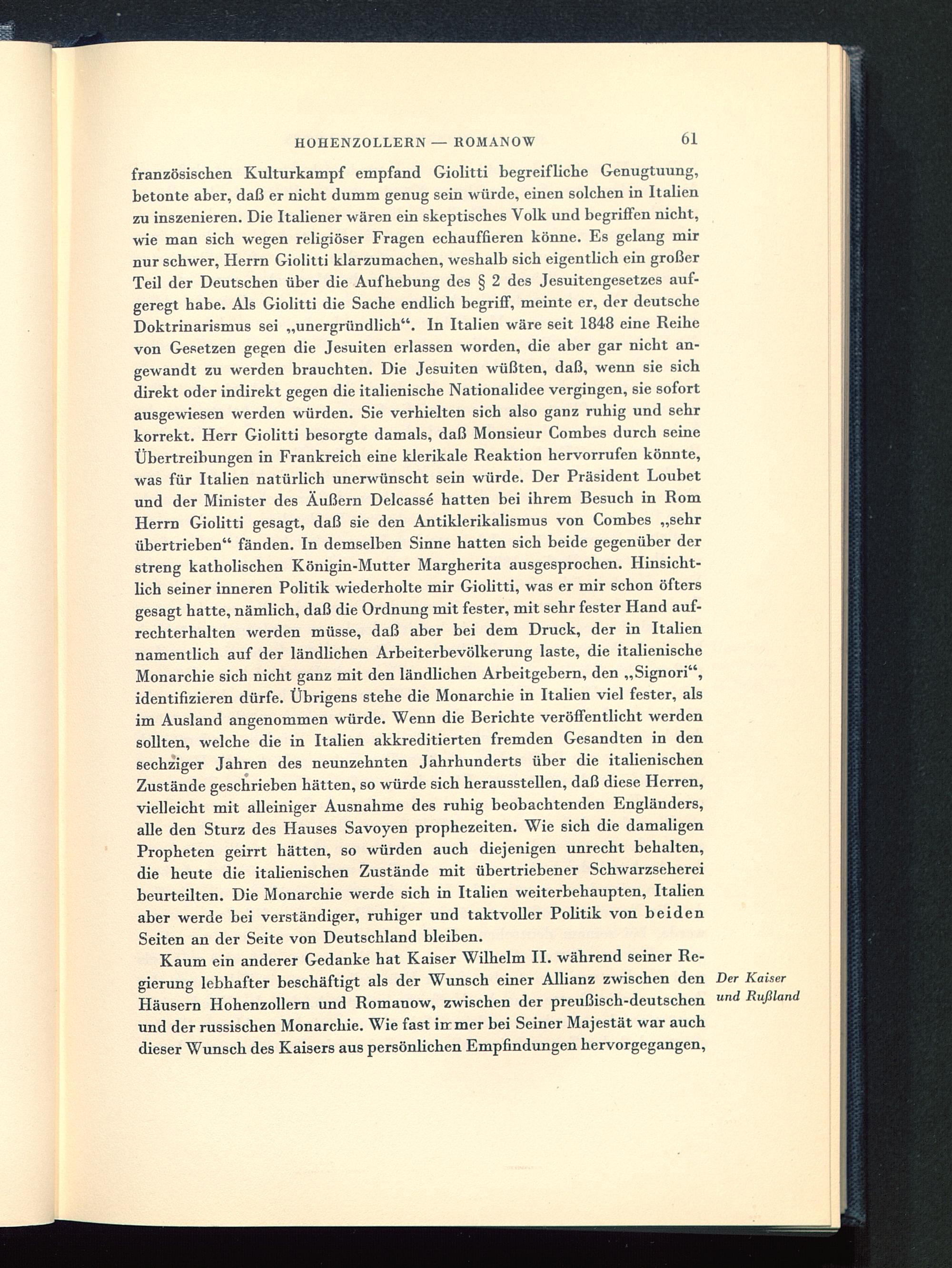 Kaum ein anderer Gedanke hat Kaiser Wilhelm II. während seiner Re-gierung lebhafter beschäftigt als der Wunsch einer Allianz zwischen den Der KaiserHäusern Hohenzollern und Romanow, zwischen der preußisch-deutschen und Rußland und der russischen Monarchie. Wie fast irrmer bei Seiner Majestät war auchdieser Wunsch des Kaisers aus persönüchen Empfindungen hervorgegangen,