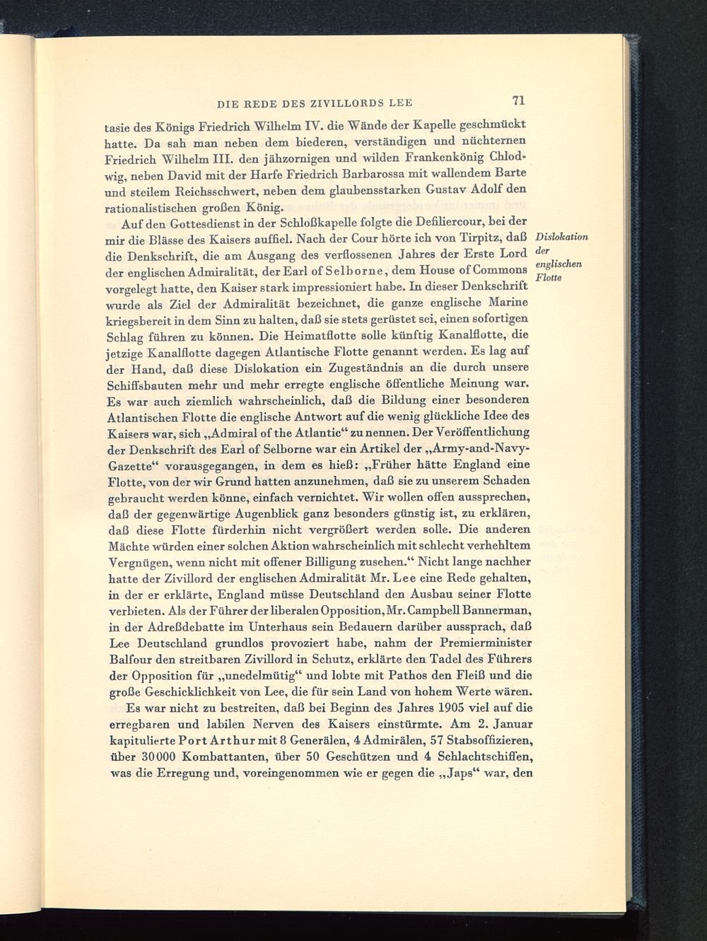 Auf den Gottesdienst in der Schloßkapelle folgte die Defihercour, bei dermir die Blässe des Kaisers auffiel. Nach der Cour hörte ich von Tirpitz, daß Dislokationdie Denkschrift, die am Ausgang des verflossenen Jahres der Erste Lord deTder englischen Admiralität, derEarl of Seiborne, dem House of Commons mvorgelegt hatte, den Kaiser stark impressioniert habe. In dieser Denkschriftwurde als Ziel der Admiralität bezeichnet, die ganze englische Marinekriegsbereit in dem Sinn zu halten, daß sie stets gerüstet sei, einen sofortigenSchlag führen zu können. Die Heimatflotte solle künftig Kanalflotte, diejetzige Kanalflotte dagegen Atlantische Flotte genannt werden. Es lag aufder Hand, daß diese Dislokation ein Zugeständnis an die durch unsereSchiffsbauten mehr und mehr erregte englische öffentliche Meinung war.Es war auch ziemlich wahrscheinlich, daß die Bildung einer besonderenAtlantischen Flotte die englische Antwort auf die wenig glückliche Idee desKaisers war, sich „Admiral of the Atlantic" zu nennen. Der Veröffentlichungder Denkschrift des Earl of Seiborne war ein Artikel der „Army-and-Navy-Gazette" vorausgegangen, in dem es hieß: „Früher hätte England eineFlotte, von der wir Grund hatten anzunehmen, daß sie zu unserem Schadengebraucht werden könne, einfach vernichtet. Wir wollen offen aussprechen,daß der gegenwärtige Augenbhck ganz besonders günstig ist, zu erklären,daß diese Flotte fürderhin nicht vergrößert werden solle. Die anderenMächte würden einer solchen Aktion wahrscheinlich mit schlecht verhehltemVergnügen, wenn nicht mit offener Billigung zusehen." Nicht lange nachherhatte der Zivülord der englischen Admiralität Mr. Lee eine Rede gehalten,in der er erklärte, England müsse Deutschland den Ausbau seiner Flotteverbieten. Als der Führer der liberalen Opposition, Mr. Campbell Bannerman ,in der Adreßdebatte im Unterhaus sein Bedauern darüber aussprach, daßLee Deutschland grundlos provoziert habe, nahm der PremierministerBalfour den streitbaren Zivillord in Schutz, erklärte den Tadel des Führersder Opposition für „unedelmütig" und lobte mit Pathos den Fleiß und diegroße Geschicklichkeit von Lee, die für sein Land von hohem Werte wären.