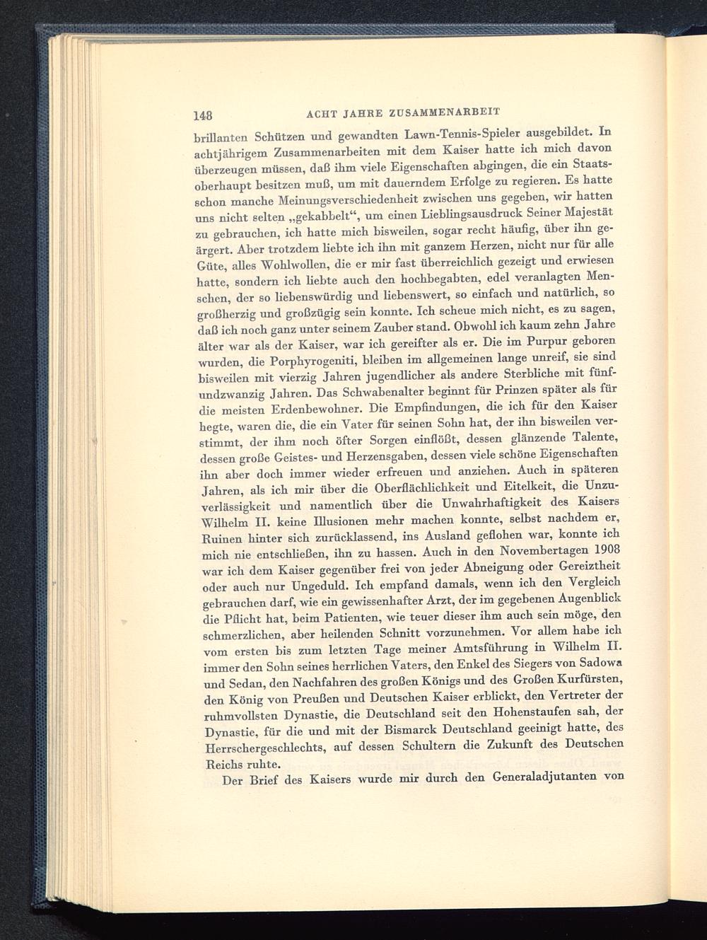 brillanten Schützen und gewandten Lawn-Tennis-Spieler ausgebildet. Inachtjährigem Zusammenarbeiten mit dem Kaiser hatte ich mich davonüberzeugen müssen, daß ihm viele Eigenschaften abgingen, die ein Staats-oberhaupt besitzen muß, um mit dauerndem Erfolge zu regieren. Es hatteschon manche Meinungsverschiedenheit zwischen uns gegeben, wir hattenuns nicht selten „gekabbelt", um einen Lieblingsausdruck Seiner Majestätzu gebrauchen, ich hatte mich bisweilen, sogar recht häufig, über ihn ge-ärgert. Aber trotzdem hebte ich ihn mit ganzem Herzen, nicht nur für alleGüte, alles Wohlwollen, die er mir fast überreichlich gezeigt und erwiesenhatte, sondern ich hebte auch den hochbegabten, edel veranlagten Men-schen, der so liebenswürdig und liebenswert, so einfach und natürlich, sogroßherzig und großzügig sein konnte. Ich scheue mich nicht, es zu sagen,daß ich noch ganz unter seinem Zauber stand. Obwohl ich kaum zehn Jahreälter war als der Kaiser, war ich gereifter als er. Die im Purpur geborenwurden, die Porphyrogeniti, bleiben im allgemeinen lange unreif, sie sindbisweilen mit vierzig Jahren jugendlicher als andere Sterbliche mit fünf-undzwanzig Jahren. Das Schwabenalter beginnt für Prinzen später als fürdie meisten Erdenbewohner. Die Empfindungen, die ich für den Kaiserhegte, waren die, die ein Vater für seinen Sohn hat, der ihn bisweilen ver-stimmt, der ihm noch öfter Sorgen einflößt, dessen glänzende Talente,dessen große Geistes- und Herzensgaben, dessen viele schöne Eigenschaftenihn aber doch immer wieder erfreuen und anziehen. Auch in späterenJahren, als ich mir über die Oberflächlichkeit und Eitelkeit, die Unzu-verlässigkeit und namentlich über die Unwahrhaftigkeit des KaisersWilhelm II. keine Illusionen mehr machen konnte, selbst nachdem er,Ruinen hinter sich zurücklassend, ins Ausland geflohen war, konnte ichmich nie entschließen, ihn zu hassen. Auch in den Novembertagen 1908war ich dem Kaiser gegenüber frei von jeder Abneigung oder Gereiztheitoder auch nur Ungeduld. Ich empfand damals, wenn ich den Vergleichgebrauchen darf, wie ein gewissenhafter Arzt, der im gegebenen Augenblickdie Pflicht hat, beim Patienten, wie teuer dieser ihm auch sein möge, denschmerzlichen, aber heilenden Schnitt vorzunehmen. Vor allem habe ichvom ersten bis zum letzten Tage meiner Amtsführung in Wilhelm II. immer den Sohn seines herrlichen Vaters, den Enkel des Siegers von Sadowaund Sedan, den Nachfahren des großen Königs und des Großen Kurfürsten,den König von Preußen und Deutschen Kaiser erblickt, den Vertreter derruhmvollsten Dynastie, die Deutschland seit den Hohenstaufen sah, derDynastie, für die und mit der Bismarck Deutschland geeinigt hatte, desHerrschergeschlechts, auf dessen Schultern die Zukunft des DeutschenReichs ruhte.