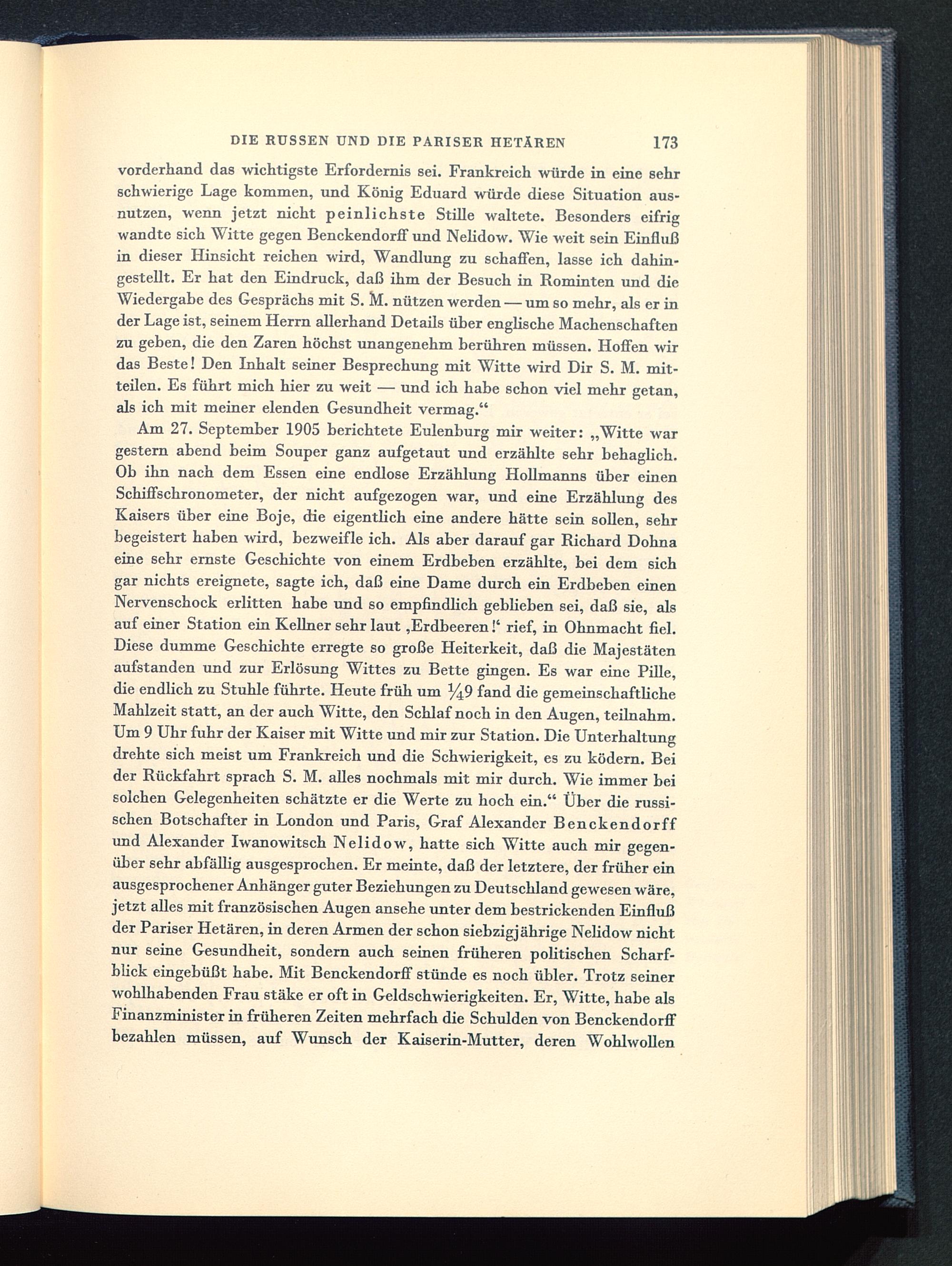 Am 27. September 1905 berichtete Eulenburg mir weiter: „Witte wargestern abend beim Souper ganz aufgetaut und erzählte sehr behaglich.Ob ihn nach dem Essen eine endlose Erzählung Hollmanns über einenSchiffschronometer, der nicht aufgezogen war, und eine Erzählung desKaisers über eine Boje, die eigentlich eine andere hätte sein sollen, sehrbegeistert haben wird, bezweifle ich. Als aber darauf gar Richard Dohna eine sehr ernste Geschichte von einem Erdbeben erzählte, bei dem sichgar nichts ereignete, sagte ich, daß eine Dame durch ein Erdbeben einenNervenschock erlitten habe und so empfindlich geblieben sei, daß sie, alsauf einer Station ein Kellner sehr laut,Erdbeeren!' rief, in Ohnmacht fiel.Diese dumme Geschichte erregte so große Heiterkeit, daß die Majestätenaufstanden und zur Erlösung Wittes zu Bette gingen. Es war eine Pille,die endlich zu Stuhle führte. Heute früh um %9 fand die gemeinschaftlicheMahlzeit statt, an der auch Witte, den Schlaf noch in den Augen, teilnahm.Um 9 Uhr fuhr der Kaiser mit Witte und mir zur Station. Die Unterhaltungdrehte sich meist um Frankreich und die Schwierigkeit, es zu ködern. Beider Rückfahrt sprach S. M. alles nochmals mit mir durch. Wie immer beisolchen Gelegenheiten schätzte er die Werte zu hoch ein." Über die russi-schen Botschafter in London und Paris, Graf Alexander Benckendorff und Alexander Iwanowitsch Nelidow, hatte sich Witte auch mir gegen-über sehr abfällig ausgesprochen. Er meinte, daß der letztere, der früher einausgesprochener Anhänger guter Beziehungen zu Deutschland gewesen wäre,jetzt alles mit französischen Augen ansehe unter dem bestrickenden Einflußder Pariser Hetären, in deren Armen der schon siebzigjährige Nelidow nichtnur seine Gesundheit, sondern auch seinen früheren politischen Scharf-blick eingebüßt habe. Mit Benckendorff stünde es noch übler. Trotz seinerwohlhabenden Frau stäke er oft in Geldschwierigkeiten. Er, Witte, habe alsFinanzminister in früheren Zeiten mehrfach die Schulden von Benckendorffbezahlen müssen, auf Wunsch der Kaiserin -Mutter, deren Wohlwollen