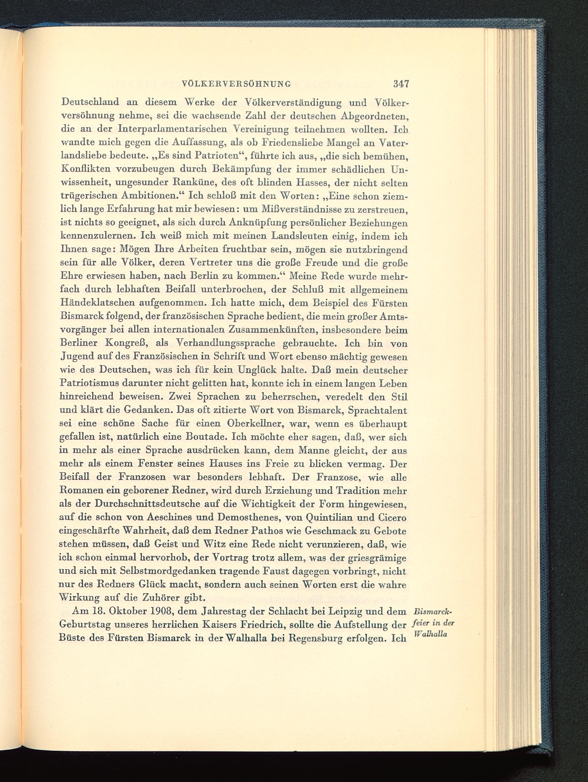 Deutschland an diesem Werke der Völkerverständigung und Völker-versöhnung nehme, sei die wachsende Zahl der deutschen Abgeordneten,die an der Interparlamentarischen Vereinigung teilnehmen wollten. Ichwandte mich gegen die Auffassung, als ob Friedenshebe Mangel an Vater-landsliebe bedeute. „Es sind Patrioten", führte ich aus, „die sich bemühen,Konflikten vorzubeugen durch Bekämpfung der immer schädlichen Un-wissenheit, ungesunder Ranküne, des oft blinden Hasses, der nicht seltentrügerischen Ambitionen." Ich schloß mit den Worten: „Eine schon ziem-lich lange Erfahrung hat mir bewiesen: um Mißverständnisse zu zerstreuen,ist nichts so geeignet, als sich durch Anknüpfung persönlicher Beziehungenkennenzulernen. Ich weiß mich mit meinen Landsleuten einig, indem ichIhnen sage: Mögen Ihre Arbeiten fruchtbar sein, mögen sie nutzbringendsein für alle Völker, deren Vertreter uns die große Freude und die großeEhre erwiesen haben, nach Berlin zu kommen." Meine Rede wurde mehr-fach durch lebhaften Beifall unterbrochen, der Schluß mit allgemeinemHändeklatschen aufgenommen. Ich hatte mich, dem Beispiel des FürstenBismarck folgend, der französischen Sprache bedient, die mein großer Amts-vorgänger bei allen internationalen Zusammenkünften, insbesondere beimBerliner Kongreß, als Verhandlungssprache gebrauchte. Ich bin vonJugend auf des Französischen in Schrift und Wort ebenso mächtig gewesenwie des Deutschen, was ich für kein Unglück halte. Daß mein deutscher Patriotismus darunter nicht gelitten hat, konnte ich in einem langen Lebenhinreichend beweisen. Zwei Sprachen zu beherrschen, veredelt den Stilund klärt die Gedanken. Das oft zitierte Wort von Bismarck , Sprachtalentsei eine schöne Sache für einen Oberkellner, war, wenn es überhauptgefallen ist, natürlich eine Boutade. Ich möchte eher sagen, daß, wer sichin mehr als einer Sprache ausdrücken kann, dem Manne gleicht, der ausmehr als einem Fenster seines Hauses ins Freie zu bücken vermag. DerBeifall der Franzosen war besonders lebhaft. Der Franzose, wie alleRomanen ein geborener Redner, wird durch Erziehung und Tradition mehrals der Durchschnittsdeutsche auf die Wichtigkeit der Form hingewiesen,auf die schon von Aeschines und Demosthenes, von Quintilian und Ciceroeingeschärfte Wahrheit, daß dem Redner Pathos wie Geschmack zu Gebotestehen müssen, daß Geist und Witz eine Rede nicht verunzieren, daß, wieich schon einmal hervorhob, der Vortrag trotz allem, was der griesgrämigeund sich mit Selbstmordgedanken tragende Faust dagegen vorbringt, nichtnur des Redners Glück macht, sondern auch seinen Worten erst die wahreWirkung auf die Zuhörer gibt.