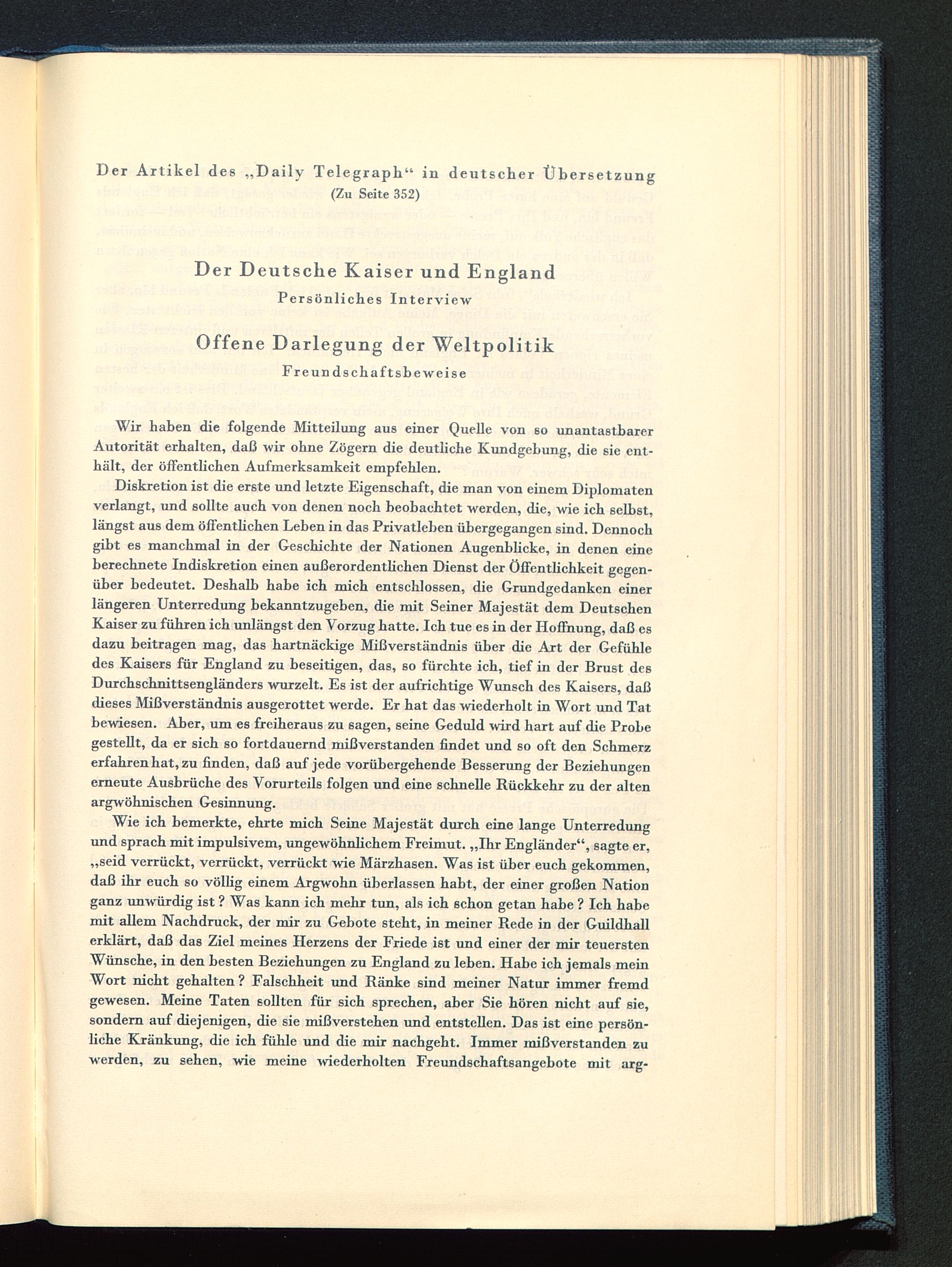 Diskretion ist die erste und letzte Eigenschaft, die man von einem Diplomatenverlangt, und sollte auch von denen noch beobachtet werden, die, wie ich selbst,längst aus dem öffentlichen Leben in das Privatleben übergegangen sind. Dennochgibt es manchmal in der Geschichte der Nationen Augenblicke, in denen eineberechnete Indiskretion einen außerordentlichen Dienst der Öffentlichkeit gegen-über bedeutet. Deshalb habe ich mich entschlossen, die Grundgedanken einerlängeren Unterredung bekanntzugeben, die mit Seiner Majestät dem DeutschenKaiser zu führen ich unlängst den Vorzug hatte. Ich tue es in der Hoffnung, daß esdazu beitragen mag, das hartnäckige Mißverständnis über die Art der Gefühledes Kaisers für England zu beseitigen, das, so fürchte ich, tief in der Brust desDurchschnittsengländers wurzelt. Es ist der aufrichtige Wunsch des Kaisers, daßdieses Mißverständnis ausgerottet werde. Er hat das wiederholt in Wort und Tatbewiesen. Aber, um es freiheraus zu sagen, seine Geduld wird hart auf die Probegestellt, da er sich so fortdauernd mißverstanden findet und so oft den Schmerzerfahren hat, zu finden, daß auf jede vorübergehende Besserung der Beziehungenerneute Ausbrüche des Vorurteils folgen und eine schnelle Rückkehr zu der altenargwöhnischen Gesinnung.