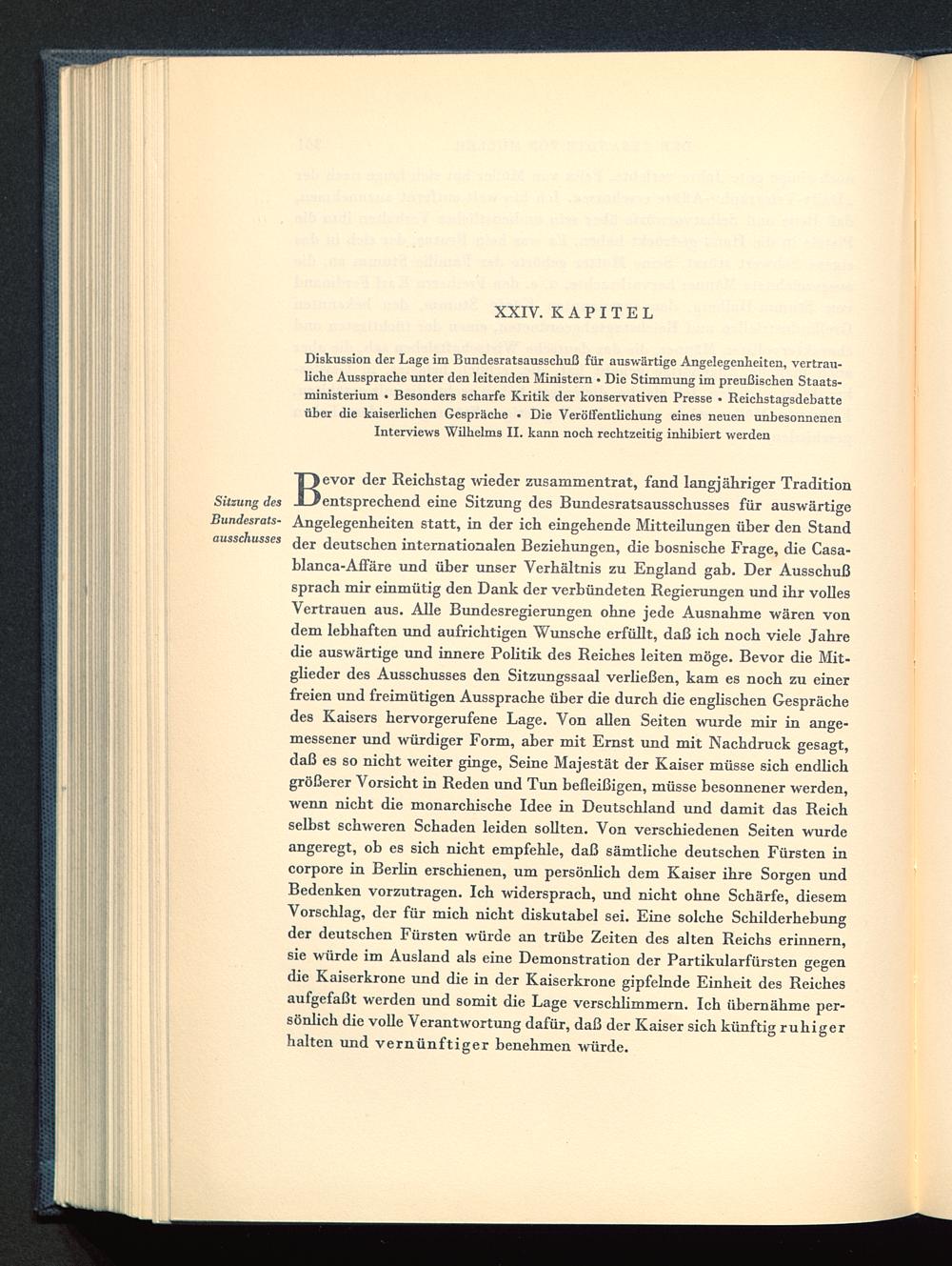 Diskussion der Lage im Bundesratsausschuß für auswärtige Angelegenheiten, vertrau-liche Aussprache unter den leitenden Ministern • Die Stimmung im preußischen Staats-ministerium • Besonders scharfe Kritik der konservativen Presse • Reichstagsdebatteüber die kaiserlichen Gespräche • Die Veröffentlichung eines neuen unbesonnenenInterviews Wilhelms II. kann noch rechtzeitig inhibiert werden