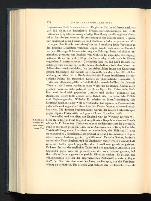 Namentlich und vor allem auf England war die Wirkung der von Wil-Kaiserliches heim IL in England mit Engländern geführten Gespräche die eines Hagel-Interview mit Schlags im Frühsommer. Und sie wäre noch niederschmetternder geworden,wenn es mir nicht gelungen wäre, die in Amerika eben in Gang befindlicheVeröffentlichung eines Interviews zu verhindern, das Wilhelm II. demamerikanischen Journalisten Haie gewährt hatte und das in krassem Gegen-satz zu seinen Auslassungen in Highcliffe stand. Derselbe Kaiser, der in sostürmischer Weise England und die Engländer seiner treuen Freundschaftversichert hatte, sprach gegenüber dem Amerikaner gerade umgekehrt.Er hatte ihn vor der englischen Tücke und den feindlichen Absichten derEngländer gegen Amerika gewarnt und den Amerikanern geraten, beiDeutschland Schutz gegen das perfide Albion zu suchen. Es gelang, denwohlmeinenden Besitzer der amerikanischen Zeitschrift „Century Maga-zine", der dies Interview erworben hatte, zu bewegen, auf die Veröffent-lichung zu verzichten. Um dieselbe Zeit meldete mir der deutsche General-