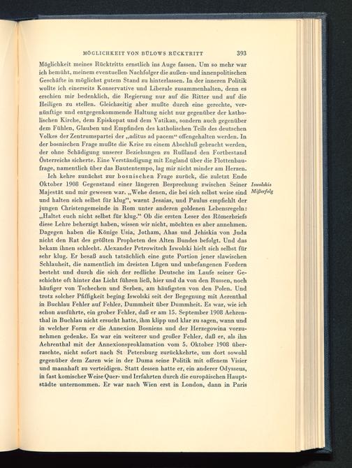 Ich kehre zunächst zur bosnischen Frage zurück, die zuletzt EndeOktober 1908 Gegenstand einer längeren Besprechung zwischen Seiner IswolskisMajestät und mir gewesen war. „Wehe denen, die bei sich selbst weise sind Mißerfolgund halten sich selbst für klug", warnt Jesaias, und Paulus empfiehlt derjungen Christengemeinde in Rom unter anderen goldenen Lebensregeln:„Haltet euch nicht selbst für klug." Ob die ersten Leser des Römerbriefsdiese Lehre beherzigt haben, wissen wir nicht, möchten es aber annehmen.Dagegen haben die Könige Usia, Jotham, Ahas und Jehiskia von Judanicht den Rat des größten Propheten des Alten Bundes befolgt. Und dasbekam ihnen schlecht. Alexander Petrowitsch Iswolski hielt sich selbst fürsehr klug. Er besaß auch tatsächlich eine gute Portion jener slawischenSchlauheit, die namentlich im dreisten Lügen und unbefangenen Fordernbesteht und durch die sich der redliche Deutsche im Laufe seiner Ge-schichte oft hinter das Licht führen ließ, hier und da von den Russen, nochhäufiger von Tschechen und Serben, am häufigsten von den Polen . Undtrotz solcher Pfiffigkeit beging Iswolski seit der Begegnung mit Aerenthalin Buchlau Fehler auf Fehler, Dummheit über Dummheit. Es war, wie ichschon ausführte, ein grober Fehler, daß er am 15. September 1908 Aehren-thal in Buchlau nicht ersucht hatte, ihm klipp und klar zu sagen, wann undin welcher Form er die Annexion Bosniens und der Herzegowina vorzu-nehmen gedenke. Es war ein weiterer und großer Fehler, daß er, als ihnAehrenthal mit der Annexionsproklamation vom 5. Oktober 1908 über-raschte, nicht sofort nach St Petersburg zurückkehrte, um dort sowohlgegenüber dem Zaren wie in der Duma seine Politik mit offenem Visierund mannhaft zu verteidigen. Statt dessen hatte er, ein anderer Odysseus,in fast komischer Weise Quer- und Irrfahrten durch die europäischen Haupt-städte unternommen. Er war nach Wien erst in London, dann in Paris