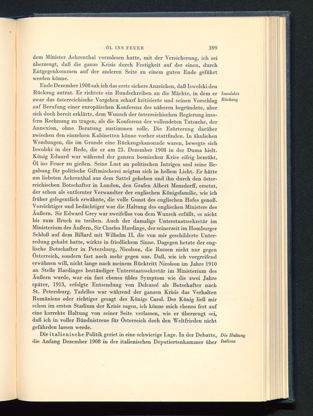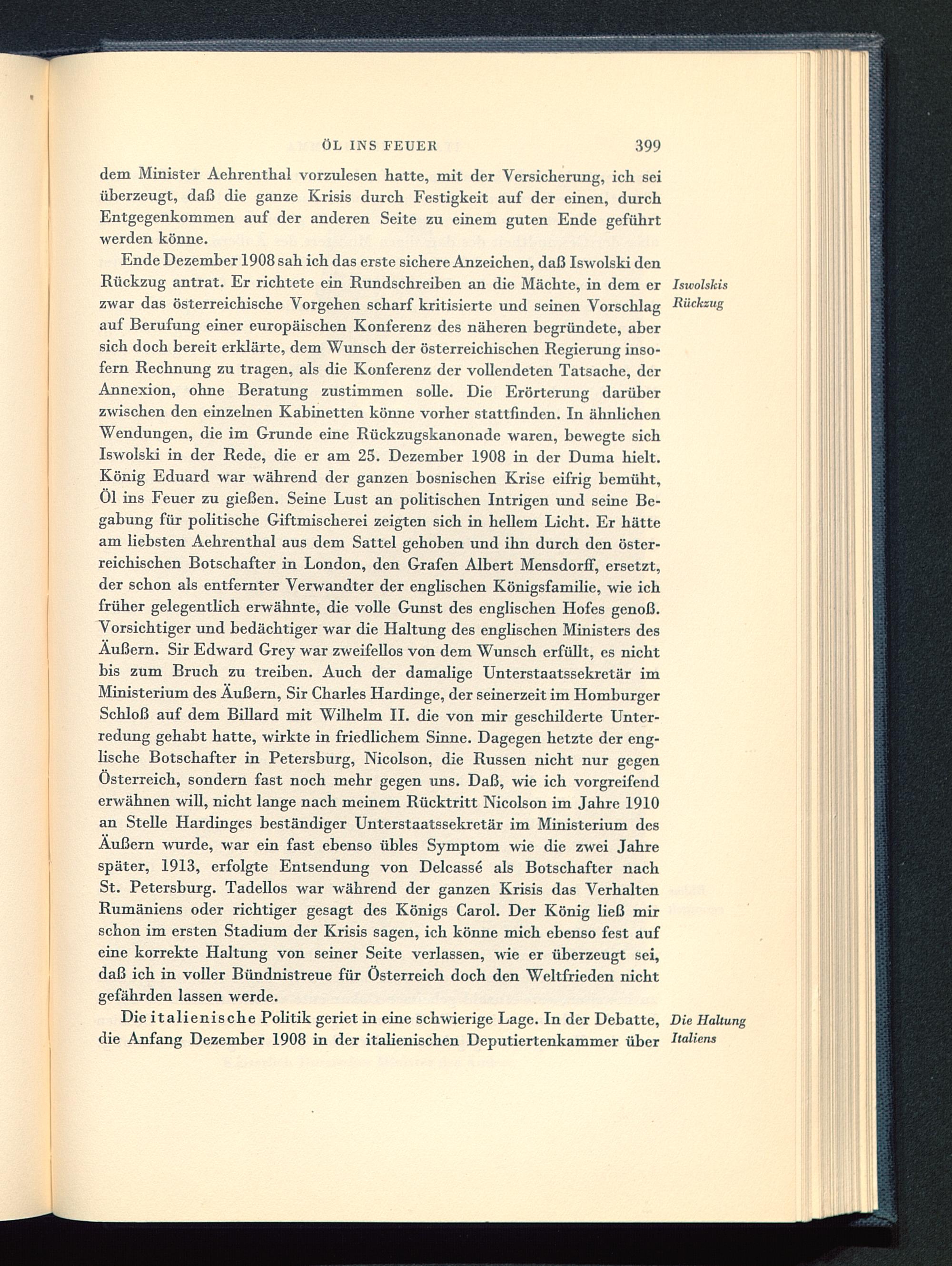 Ende Dezember 1908 sah ich das erste sichere Anzeichen, daß Iswolski denRückzug antrat. Er richtete ein Rundschreiben an die Mächte, in dem er Iswolskzwar das österreichische Vorgehen scharf kritisierte und seinen Vorschlag Rückzugauf Berufung einer europäischen Konferenz des näheren begründete, abersich doch bereit erklärte, dem Wunsch der österreichischen Regierung inso-fern Rechnung zu tragen, als die Konferenz der vollendeten Tatsache, derAnnexion, ohne Beratung zustimmen solle. Die Erörterung darüberzwischen den einzelnen Kabinetten könne vorher stattfinden. In ähnlichenWendungen, die im Grunde eine Rückzugskanonade waren, bewegte sichIswolski in der Rede, die er am 25. Dezember 1908 in der Duma hielt.König Eduard war während der ganzen bosnischen Krise eifrig bemüht,Öl ins Feuer zu gießen. Seine Lust an politischen Intrigen und seine Be-gabung für politische Giftmischerei zeigten sich in hellem Licht. Er hätteam liebsten Aehrenthal aus dem Sattel gehoben und ihn durch den öster-reichischen Botschafter in London, den Grafen Albert Mensdorff , ersetzt,der schon als entfernter Verwandter der englischen Königsfamilie, wie ichfrüher gelegentlich erwähnte, die volle Gunst des englischen Hofes genoß.Vorsichtiger und bedächtiger war die Haltung des englischen Ministers desÄußern. Sir Edward Grey war zweifellos von dem Wunsch erfüllt, es nichtbis zum Bruch zu treiben. Auch der damalige Unterstaatssekretär imMinisterium des Äußern, Sir Charles Hardinge , der seinerzeit im HomburgerSchloß auf dem Billard mit Wilhelm II. die von mir geschilderte Unter-redung gehabt hatte, wirkte in friedlichem Sinne. Dagegen hetzte der eng-lische Botschafter in Petersburg , Nicolson, die Russen nicht nur gegenÖsterreich , sondern fast noch mehr gegen uns. Daß, wie ich vorgreifenderwähnen will, nicht lange nach meinem Rücktritt Nicolson im Jahre 1910an Stelle Hardinges beständiger Unterstaatssekretär im Ministerium desÄußern wurde, war ein fast ebenso übles Symptom wie die zwei Jahrespäter, 1913, erfolgte Entsendung von Delcasse als Botschafter nachSt. Petersburg . Tadellos war während der ganzen Krisis das VerhaltenRumäniens oder richtiger gesagt des Königs Carol. Der König ließ mirschon im ersten Stadium der Krisis sagen, ich könne mich ebenso fest aufeine korrekte Haltung von seiner Seite verlassen, wie er überzeugt sei,daß ich in voller Bündnistreue für Österreich doch den Weltfrieden nichtgefährden lassen werde.