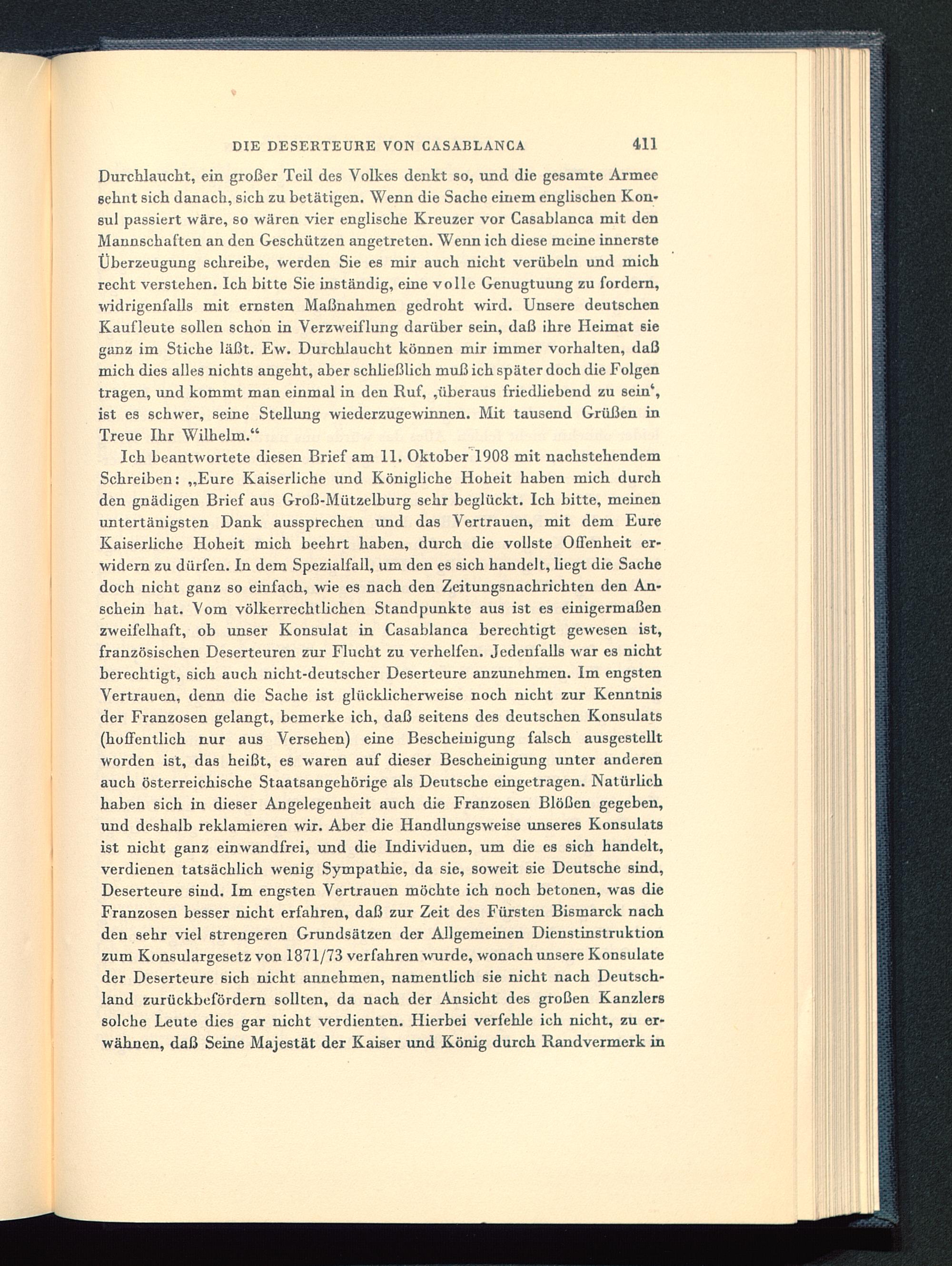 Ich beantwortete diesen Brief am 11. Oktober 1908 mit nachstehendemSchreiben: „Eure Kaiserliche und Königliche Hoheit haben mich durchden gnädigen Brief aus Groß-Mützelburg sehr beglückt. Ich bitte, meinenuntertänigsten Dank aussprechen und das Vertrauen, mit dem EureKaiserliche Hoheit mich beehrt haben, durch die vollste Offenheit er-widern zu dürfen. In dem Spezialfall, um den es sich handelt, liegt die Sachedoch nicht ganz so einfach, wie es nach den Zeitungsnachrichten den An-schein hat. Vom völkerrechtlichen Standpunkte aus ist es einigermaßenzweifelhaft, ob unser Konsulat in Casablanca berechtigt gewesen ist,französischen Deserteuren zur Flucht zu verhelfen. Jedenfalls war es nichtberechtigt, sich auch nicht-deutscher Deserteure anzunehmen. Im engstenVertrauen, denn die Sache ist glücklicherweise noch nicht zur Kenntnisder Franzosen gelangt, bemerke ich, daß seitens des deutschen Konsulats(hoffentlich nur aus Versehen) eine Bescheinigung falsch ausgestelltworden ist, das heißt, es waren auf dieser Bescheinigung unter anderenauch österreichische Staatsangehörige als Deutsche eingetragen. Natürlichhaben sich in dieser Angelegenheit auch die Franzosen Blößen gegeben,und deshalb reklamieren wir. Aber die Handlungsweise unseres Konsulatsist nicht ganz einwandfrei, und die Individuen, um die es sich handelt,verdienen tatsächlich wenig Sympathie, da sie, soweit sie Deutsche sind,Deserteure sind. Im engsten Vertrauen möchte ich noch betonen, was dieFranzosen besser nicht erfahren, daß zur Zeit des Fürsten Bismarck nachden sehr viel strengeren Grundsätzen der Allgemeinen Dienstinstruktionzum Konsulargesetz von 1871/73 verfahren wurde, wonach unsere Konsulateder Deserteure sich nicht annehmen, namentlich sie nicht nach Deutsch-land zurückbefördern sollten, da nach der Ansicht des großen Kanzlerssolche Leute dies gar nicht verdienten. Hierbei verfehle ich nicht, zu er-wähnen, daß Seine Majestät der Kaiser und König durch Randvermerk in