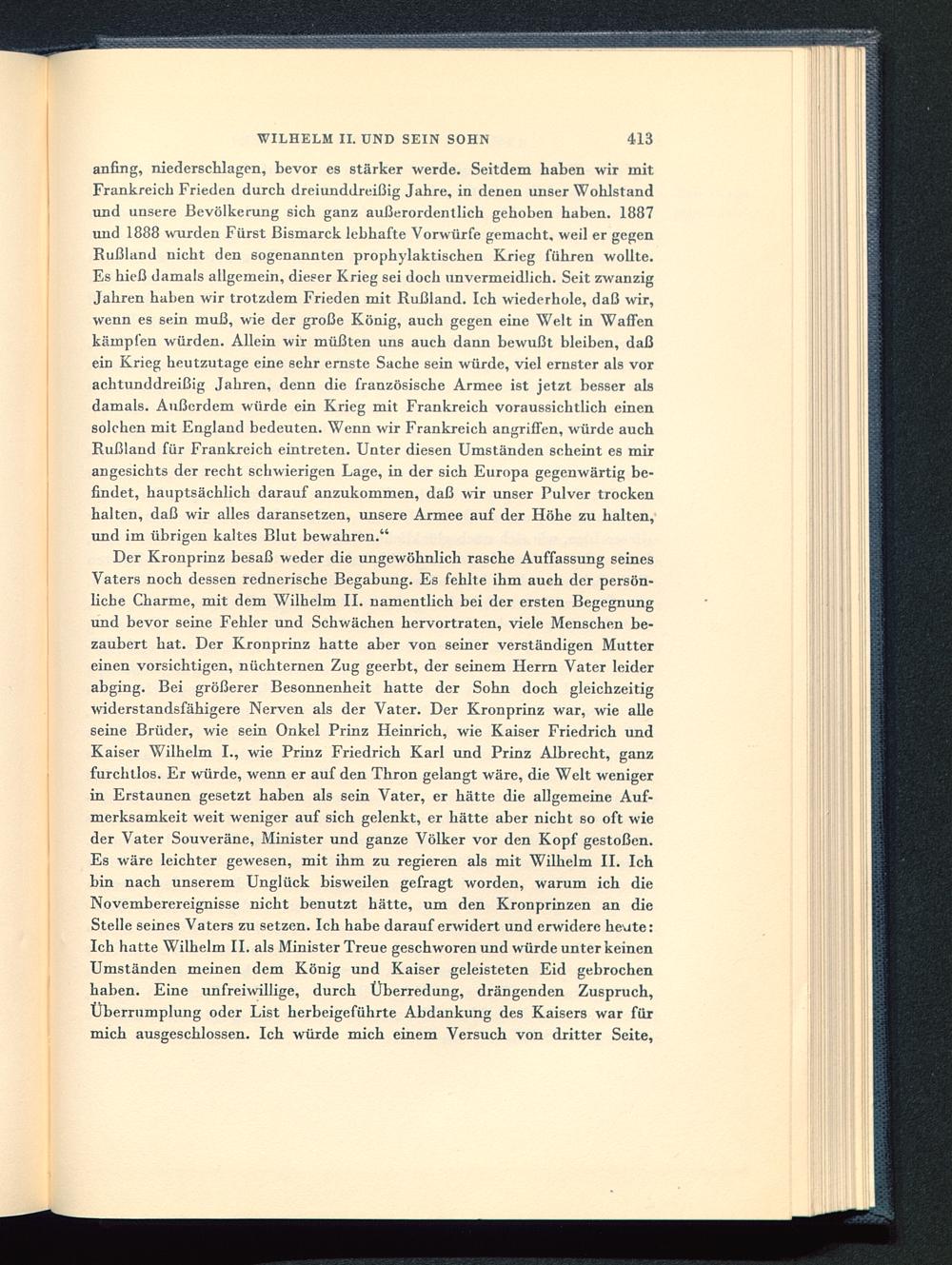 Der Kronprinz besaß weder die ungewöhnlich rasche Auffassung seinesVaters noch dessen rednerische Begabung. Es fehlte ihm auch der persön-liche Charme, mit dem Wilhelm II. namentlich bei der ersten Begegnungund bevor seine Fehler und Schwächen hervortraten, viele Menschen be-zaubert hat. Der Kronprinz hatte aber von seiner verständigen Muttereinen vorsichtigen, nüchternen Zug geerbt, der seinem Herrn Vater leiderabging. Bei größerer Besonnenheit hatte der Sohn doch gleichzeitigwiderstandsfähigere Nerven als der Vater. Der Kronprinz war, wie alleseine Brüder, wie sein Onkel Prinz Heinrich, wie Kaiser Friedrich undKaiser Wilhelm I., wie Prinz Friedrich Karl und Prinz Albrecht , ganzfurchtlos. Er würde, wenn er auf den Thron gelangt wäre, die Welt wenigerin Erstaunen gesetzt haben als sein Vater, er hätte die allgemeine Auf-merksamkeit weit weniger auf sich gelenkt, er hätte aber nicht so oft wieder Vater Souveräne , Minister und ganze Völker vor den Kopf gestoßen.Es wäre leichter gewesen, mit ihm zu regieren als mit Wilhelm II. Ichbin nach unserem Unglück bisweilen gefragt worden, warum ich dieNovemberereignisse nicht benutzt hätte, um den Kronprinzen an dieStelle seines Vaters zu setzen. Ich habe darauf erwidert und erwidere heute:Ich hatte Wilhelm II. als Minister Treue geschworen und würde unter keinenUmständen meinen dem König und Kaiser geleisteten Eid gebrochenhaben. Eine unfreiwillige, durch Überredung, drängenden Zuspruch,Überrumplung oder List herbeigeführte Abdankung des Kaisers war fürmich ausgeschlossen. Ich würde mich einem Versuch von dritter Seite,