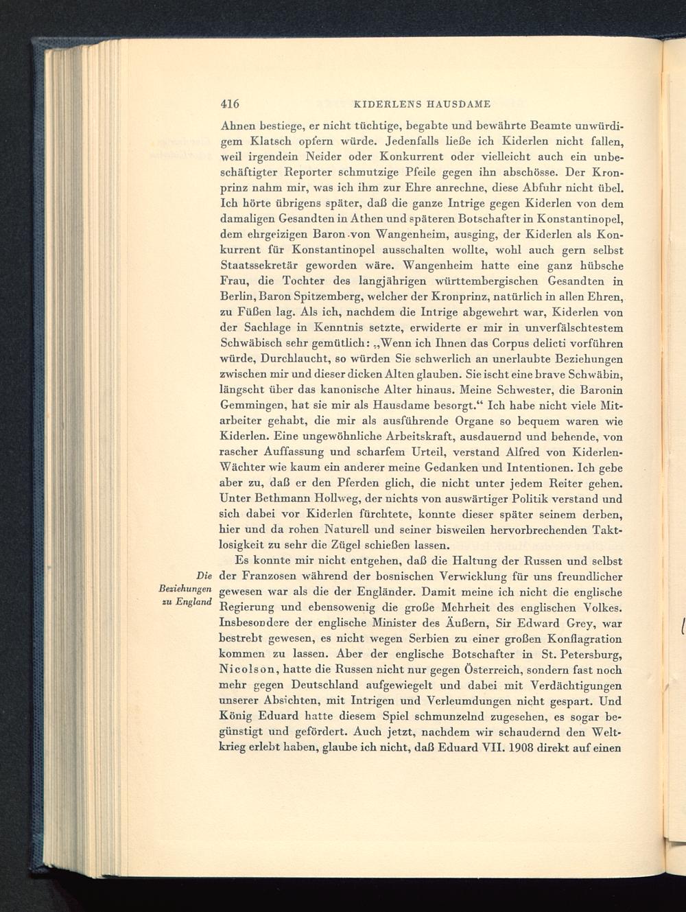 Ahnen bestiege, er nicht tüchtige, begabte und bewährte Beamte unwürdi-gem Klatsch opfern würde. Jedenfalls ließe ich Kiderlen nicht fallen,weil irgendein Neider oder Konkurrent oder vielleicht auch ein unbe-schäftigter Reporter schmutzige Pfeile gegen ihn abschösse. Der Kron-prinz nahm mir, was ich ihm zur Ehre anrechne, diese Abfuhr nicht übel.Ich hörte übrigens später, daß die ganze Intrige gegen Kiderlen von demdamaligen Gesandten in Athen und späteren Botschafter in Konstantinopel,dem ehrgeizigen Baron -von Wangenheim, ausging, der Kiderlen als Kon-kurrent für Konstantinopel ausschalten wollte, wohl auch gern selbstStaatssekretär geworden wäre. Wangenheim hatte eine ganz hübscheFrau, die Tochter des langjährigen württembergischen Gesandten inBerlin , Baron Spitzemberg, welcher der Kronprinz, natürlich in allen Ehren,zu Füßen lag. Als ich, nachdem die Intrige abgewehrt war, Kiderlen vonder Sachlage in Kenntnis setzte, erwiderte er mir in unverfälschtestemSchwäbisch sehr gemütlich: „Wenn ich Ihnen das Corpus delicti vorführenwürde, Durchlaucht, so würden Sie schwerlich an unerlaubte Beziehungenzwischen mir und dieser dicken Alten glauben. Sie ischt eine brave Schwäbin,längscht über das kanonische Alter hinaus. Meine Schwester, die BaroninGemmingen, hat sie mir als Hausdame besorgt." Ich habe nicht viele Mit-arbeiter gehabt, die mir als ausführende Organe so bequem waren wieKiderlen. Eine ungewöhnliche Arbeitskraft, ausdauernd und behende, vonrascher Auffassung und scharfem Urteil, verstand Alfred von Kiderlen-Wächter wie kaum ein anderer meine Gedanken und Intentionen. Ich gebeaber zu, daß er den Pferden glich, die nicht unter jedem Reiter gehen.Unter Bethmann Hollweg, der nichts von auswärtiger Politik verstand undsich dabei vor Kiderlen fürchtete, konnte dieser später seinem derben,hier und da rohen Naturell und seiner bisweilen hervorbrechenden Takt-losigkeit zu sehr die Zügel schießen lassen.