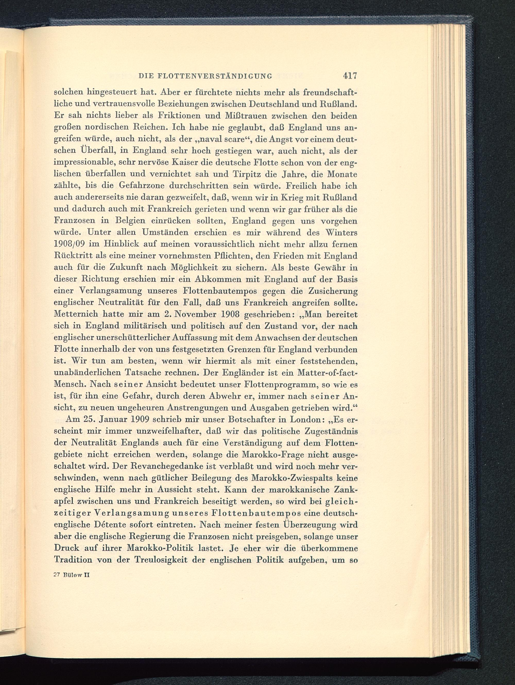 solchen hingesteuert hat. Aber er fürchtete nichts mehr als freundschaft-liche und vertrauensvolle Beziehungen zwischen Deutschland und Rußland .Er sah nichts lieber als Friktionen und Mißtrauen zwischen den beidengroßen nordischen Reichen. Ich habe nie geglaubt, daß England uns an-greifen würde, auch nicht, als der „naval scare", die Angst vor einem deut-schen Überfall, in England sehr hoch gestiegen war, auch nicht, als derimpressionable, sehr nervöse Kaiser die deutsche Flotte schon von der eng-lischen überfallen und vernichtet sah und Tirpitz die Jahre, die Monatezählte, bis die Gefahrzone durchschritten sein würde. Freilich habe ichauch andererseits nie daran gezweifelt, daß, wenn wir in Krieg mit Rußland und dadurch auch mit Frankreich gerieten und wenn wir gar früher als dieFranzosen in Belgien einrücken sollten, England gegen uns vorgehenwürde. Unter allen Umständen erschien es mir während des Winters1908/09 im Hinblick auf meinen voraussichtlich nicht mehr allzu fernenRücktritt als eine meiner vornehmsten Pflichten, den Frieden mit England auch für die Zukunft nach Möglichkeit zu sichern. Als beste Gewähr indieser Richtung erschien mir ein Abkommen mit England auf der Basiseiner Verlangsamung unseres Flottenbautempos gegen die Zusicherungenglischer Neutralität für den Fall, daß uns Frankreich angreifen sollte.Metternich hatte mir am 2. November 1908 geschrieben: „Man bereitetsich in England militärisch und politisch auf den Zustand vor, der nachenglischer unerschütterlicher Auffassung mit dem Anwachsen der deutschenFlotte innerhalb der von uns festgesetzten Grenzen für England verbundenist. Wir tun am besten, wenn wir hiermit als mit einer feststehenden,unabänderlichen Tatsache rechnen. Der Engländer ist ein Matter-of-fact-Mensch. Nach seiner Ansicht bedeutet unser Flottenprogramm, so wie esist, für ihn eine Gefahr, durch deren Abwehr er, immer nach seiner An-sicht, zu neuen ungeheuren Anstrengungen und Ausgaben getrieben wird."