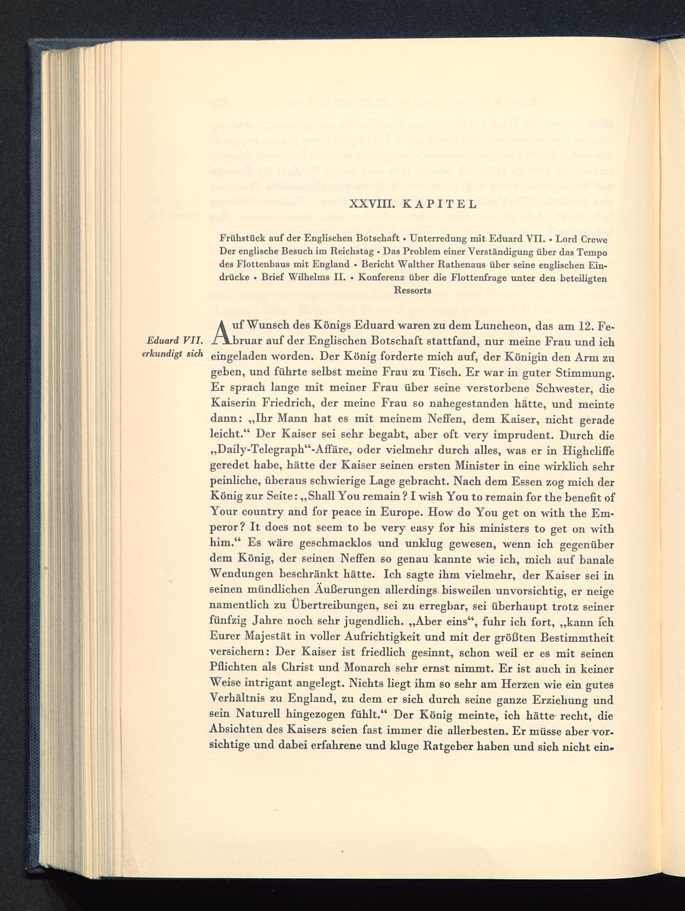 Frühstück auf der Englischen Botschaft • Unterredung mit Eduard VII . • Lord CreweDer englische Besuch im Reichstag • Das Problem einer Verständigung über das Tempodes Flottenbaus mit England • Bericht Walther Rathenaus über seine englischen Ein-drücke • Brief Wilhelms II. • Konferenz über die Flottenfrage unter den beteiligten
