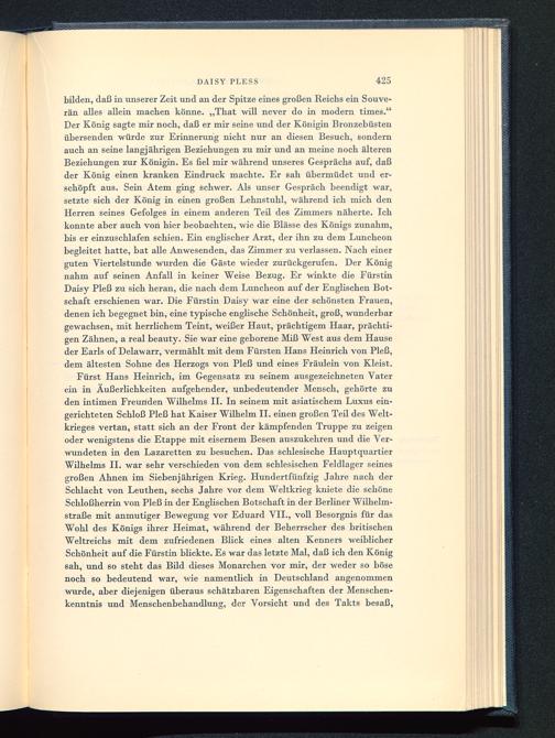 bilden, daß in unserer Zeit und an der Spitze eines großen Reichs ein Souve-rän alles allein machen könne. „That will never do in modern times."Der König sagte mir noch, daß er mir seine und der Königin Bronzebüstenübersenden würde zur Erinnerung nicht nur an diesen Besuch, sondernauch an seine langjährigen Beziehungen zu mir und an meine noch älterenBeziehungen zur Königin. Es fiel mir während unseres Gesprächs auf, daßder König einen kranken Eindruck machte. Er sah übermüdet und er-schöpft aus. Sein Atem ging schwer. Als unser Gespräch beendigt war,setzte sich der König in einen großen Lehnstuhl, während ich mich denHerren seines Gefolges in einem anderen Teil des Zimmers näherte. Ichkonnte aber auch von hier beobachten, wie die Blässe des Königs zunahm,bis er einzuschlafen schien. Ein englischer Arzt, der ihn zu dem Luncheon begleitet hatte, bat alle Anwesenden, das Zimmer zu verlassen. Nach einerguten Viertelstunde wurden die Gäste wieder zurückgerufen. Der Könignahm auf seinen Anfall in keiner Weise Bezug. Er winkte die FürstinDaisy Pleß zu sich heran, die nach dem Luncheon auf der Englischen Bot-schaft erschienen war. Die Fürstin Daisy war eine der schönsten Frauen,denen ich begegnet bin, eine typische englische Schönheit, groß, wunderbargewachsen, mit herrlichem Teint, weißer Haut, prächtigem Haar, prächti-gen Zähnen, a real beauty. Sie war eine geborene Miß West aus dem Hauseder Earls of Delawarr, vermählt mit dem Fürsten Hans Heinrich von Pleß,dem ältesten Sohne des Herzogs von Pleß und eines Fräulein von Kleist .