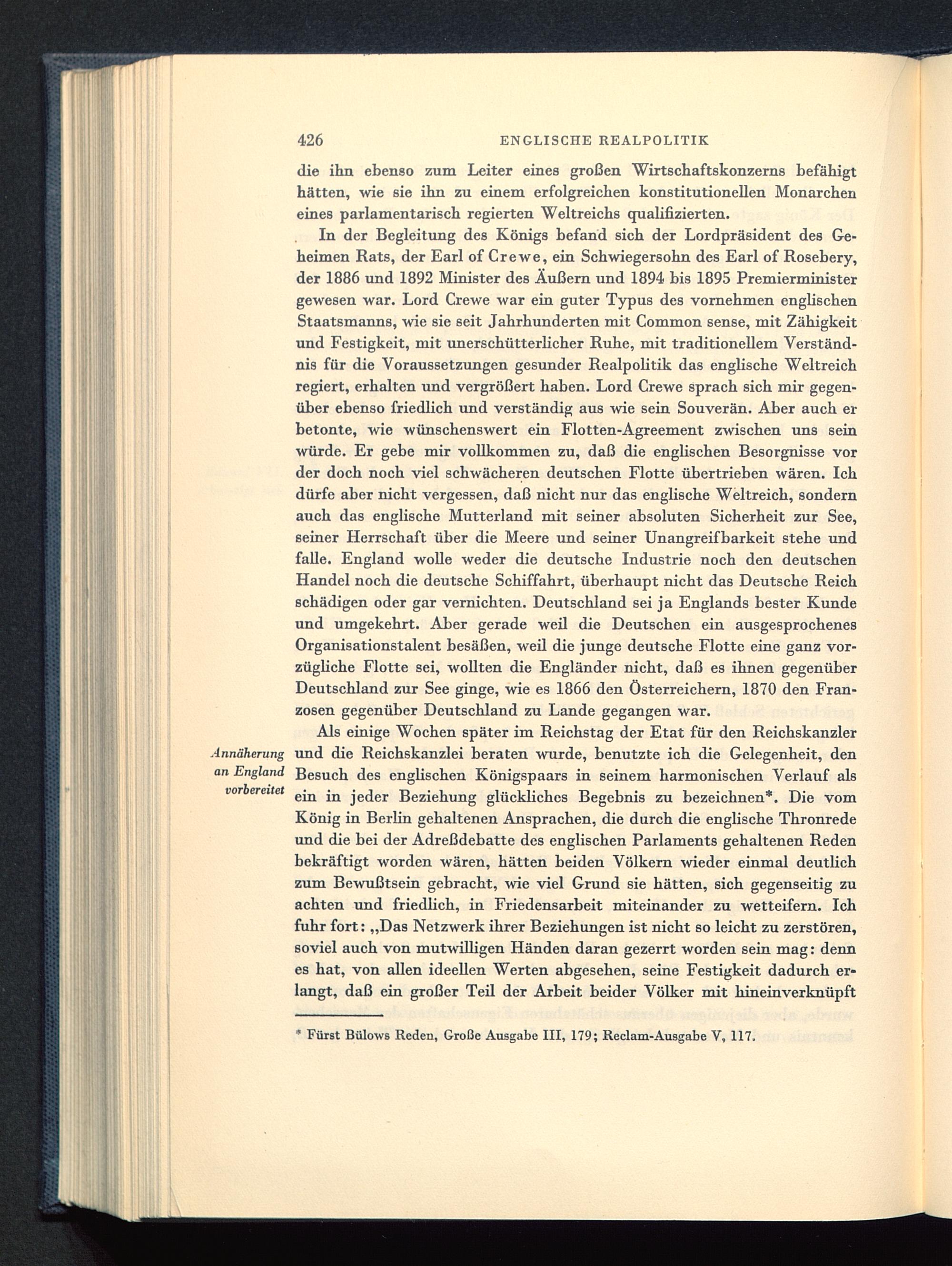 In der Begleitung des Königs befand sich der Lordpräsident des Ge-heimen Rats, der Earl of Crewe, ein Schwiegersohn des Earl of Rosebery ,der 1886 und 1892 Minister des Äußern und 1894 bis 1895 Premierministergewesen war. Lord Crewe war ein guter Typus des vornehmen englischenStaatsmanns, wie sie seit Jahrhunderten mit Common sense, mit Zähigkeitund Festigkeit, mit unerschütterlicher Ruhe, mit traditionellem Verständ-nis für die Voraussetzungen gesunder Realpolitik das englische Weltreichregiert, erhalten und vergrößert haben. Lord Crewe sprach sich mir gegen-über ebenso friedlich und verständig aus wie sein Souverän. Aber auch erbetonte, wie wünschenswert ein Flotten-Agreement zwischen uns seinwürde. Er gebe mir vollkommen zu, daß die englischen Besorgnisse vorder doch noch viel schwächeren deutschen Flotte übertrieben wären. Ichdürfe aber nicht vergessen, daß nicht nur das englische Weltreich, sondernauch das englische Mutterland mit seiner absoluten Sicherheit zur See,seiner Herrschaft über die Meere und seiner Unangreifbarkeit stehe undfalle. England wolle weder die deutsche Industrie noch den deutschen Handel noch die deutsche Schiffahrt, überhaupt nicht das Deutsche Reichschädigen oder gar vernichten. Deutschland sei ja Englands bester Kundeund umgekehrt. Aber gerade weil die Deutschen ein ausgesprochenesOrganisationstalent besäßen, weil die junge deutsche Flotte eine ganz vor-zügliche Flotte sei, wollten die Engländer nicht, daß es ihnen gegenüberDeutschland zur See ginge, wie es 1866 den Österreichern, 1870 den Fran-zosen gegenüber Deutschland zu Lande gegangen war.
