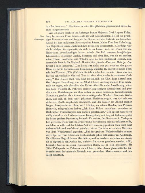 Am 12. März erschien im Auftrage Seiner Majestät Graf August Eulen-Neue bürg bei meiner Frau, überreichte ihr auf Allerhöchsten Befehl ein präch-Abirrungen tiges Blumenbukett und frug, ob der Kaiser mit der Kaiserin an demselbenAbend bei uns im kleinen Kreise speisen könne. Meine Frau bat Eulenburg,den Majestäten ihren Dank und ihre Freude zu übermitteln. Allerdings warsie in einiger Verlegenheit, ob sich in so kurzer Zeit ein Diner für dieMajestäten bewerkstelligen lassen würde. Sie Heß unseren langjährigenKüchenchef, Monsieur Cholin, kommen und frug ihn, was da zu machenwäre. Dieser erwiderte mit Würde: „Je ne suis nullement etonne, celaressemble bien ä Sa Majeste. II n'en fait jamais d'autres. Mais je n'entirerai ä mon honneur." Das Essen war nicht nur gut, sondern das ganzeDiner verlief in harmonischer Stimmung. Wilhelm II. begrüßte meine Fraumit den Worten: „Wie glücklich bin ich, wieder hier zu sein! Was war dasfür ein schrecklicher Winter! Nun ist aber alles wieder in schönster Ord-nung." Der Kaiser bbeb von acht bis einhalb ein Uhr. Tags darauf kamGraf August Eulenburg, um im Allerhöchsten Auftrag meiner Frau noch-mals zu sagen, wie glückhch der Kaiser über die volle Aussöhnung wäre.Ich habe Wilhelm II. während meiner langjährigen dienstlichen und per-sönlichen Beziehungen zu ihm selten in einer besseren, freundlicherenStimmung gesehen als während der nun folgenden Wochen. Das erste Wölk-chen, das sich an dem sonst geklärten Horizont zeigte, war die mir aussicherster Quelle zugehende Nachricht, daß der Kaiser am Abend meinerlangen Aussprache mit ihm, am 11. März, an seinen Bruder, den PrinzenHeinrich, telegraphiert habe: „Ich habe Bülow verziehen, nachdem erMich unter Weinkrämpfen um Pardon gebeten hat." Ich sprach über diesevöllig unwahre, doch sehr seltsame Kundgebung mit August Eulenburg, derihr keine größere Bedeutung beimaß. Er meinte, der Kaiser sei in Verlegen-heit gewesen, wie er seinem Bruder seine Versöhnung mit mir erklären solle,nachdem er während der letzten Zeit sich diesem gegenüber über mich sehrunfreundlich und ausfallend geäußert hätte. Da habe er zu dem Märchenvon dem Weinkrampf gegriffen. „Bei der größten Wahrheitsliebe kommtderjenige, der vom Absurden Rechenschaft geben soll, immer ins Gedränge.Er will einen Begriff davon überliefern, und so macht er es schon zu etwas,da es eigentlich ein Nichts ist, welches für etwas gehalten werden will",bemerkt Goethe in seiner italienischen Reise, als er sich anschickt, dieVilla Pallagonia in Palermo zu schildern, über deren phantastische Ex-zentrizitäten der normale Mensch von gesundem Menschenverstand denKopf schüttelt.