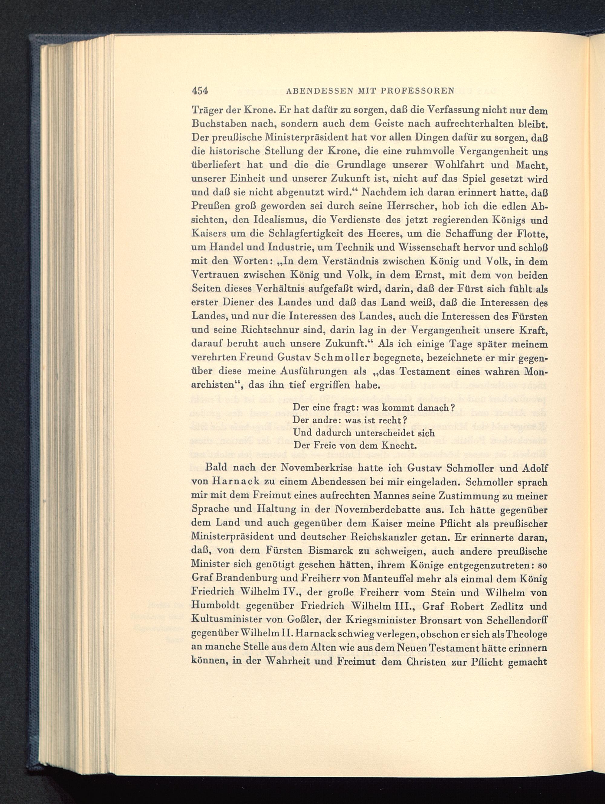 Bald nach der Novemberkrise hatte ich Gustav Schmoller und Adolfvon Harnack zu einem Abendessen bei mir eingeladen. Schmoller sprachmir mit dem Freimut eines aufrechten Mannes seine Zustimmung zu meinerSprache und Haltung in der Novemberdebatte aus. Ich hätte gegenüberdem Land und auch gegenüber dem Kaiser meine Pflicht als preußischerMinisterpräsident und deutscher Reichskanzler getan. Er erinnerte daran,daß, von dem Fürsten Bismarck zu schweigen, auch andere preußischeMinister sich genötigt gesehen hätten, ihrem Könige entgegenzutreten: soGraf Brandenburg und Freiherr von Manteuffel mehr als einmal dem KönigFriedrich Wilhelm IV., der große Freiherr vom Stein und Wilhelm vonHumboldt gegenüber Friedrich Wilhelm HL, Graf Robert Zedlitz undKultusminister von Goßler, der Kriegsminister Bronsart von Schellendorffgegenüber Wilhelm II. Harnack schwieg verlegen, obschon er sich als Theologean manche Stelle aus dem Alten wie aus dem Neuen Testament hätte erinnernkönnen, in der Wahrheit und Freimut dem Christen zur Pflicht gemacht