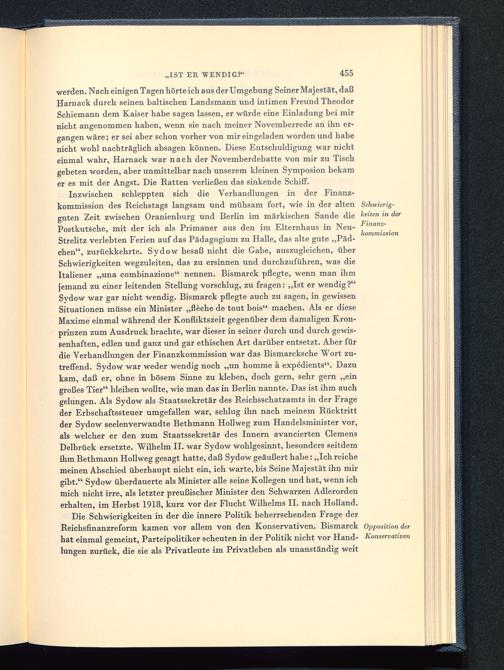 Inzwischen schleppten sich die Verhandlungen in der Finanz-kommission des Reichstags langsam und mühsam fort, wie in der alten Schwicrig-guten Zeit zwischen Oranienburg und Berlin im märkischen Sande die leiten in derPostkutsche, mit der ich als Primaner aus den im Elternhaus in Neu- J?lnanz 'Strelitz verlebten Ferien auf das Pädagogium zu Halle, das alte gute „Päd-chen", zurückkehrte. Sydow besaß nicht die Gabe, auszugleichen, überSchwierigkeiten wegzuleiten, das zu ersinnen und durchzuführen, was dieItaliener „una combinazione" nennen. Bismarck pflegte, wenn man ihmjemand zu einer leitenden Stellung vorschlug, zu fragen: „Ist er wendig ?"Sydow war gar nicht wendig. Bismarck pflegte auch zu sagen, in gewissenSituationen müsse ein Minister „fleche de tout bois" machen. Als er dieseMaxime einmal während der Konfliktszeit gegenüber dem damaligen Kron-prinzen zum Ausdruck brachte, war dieser in seiner durch und durch gewis-senhaften, edlen und ganz und gar ethischen Art darüber entsetzt. Aber fürdie Verhandlungen der Finanzkommission war das Bismarcksche Wort zu-treffend. Sydow war weder wendig noch „un homme ä expedients". Dazukam, daß er, ohne in bösem Sinne zu kleben, doch gern, sehr gern „eingroßes Tier" bleiben wollte, wie man das in Berlin nannte. Das ist ihm auchgelungen. Als Sydow als Staatssekretär des Reichsschatzamts in der Frageder Erbschaftssteuer umgefallen war, schlug ihn nach meinem Rücktrittder Sydow seelenverwandte Bethmann Hollweg zum Handelsminister vor,als welcher er den zum Staatssekretär des Innern avancierten ClemensDelbrück ersetzte. Wilhelm II. war Sydow wohlgesinnt, besonders seitdemihm Bethmann Hollweg gesagt hatte, daß Sydow geäußert habe: „Ich reichemeinen Abschied überhaupt nicht ein, ich warte, bis Seine Majestät ihn mirgibt." Sydow überdauerte als Minister alle seine Kollegen und hat, wenn ichmich nicht irre, als letzter preußischer Minister den Schwarzen Adlerordenerhalten, im Herbst 1918, kurz vor der Flucht Wilhelms II. nach Holland .