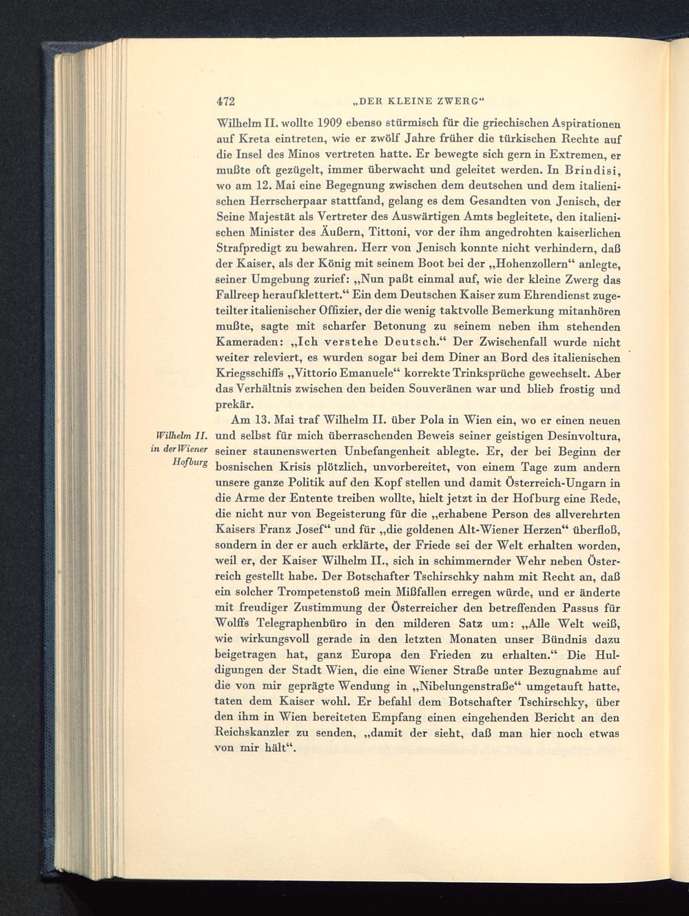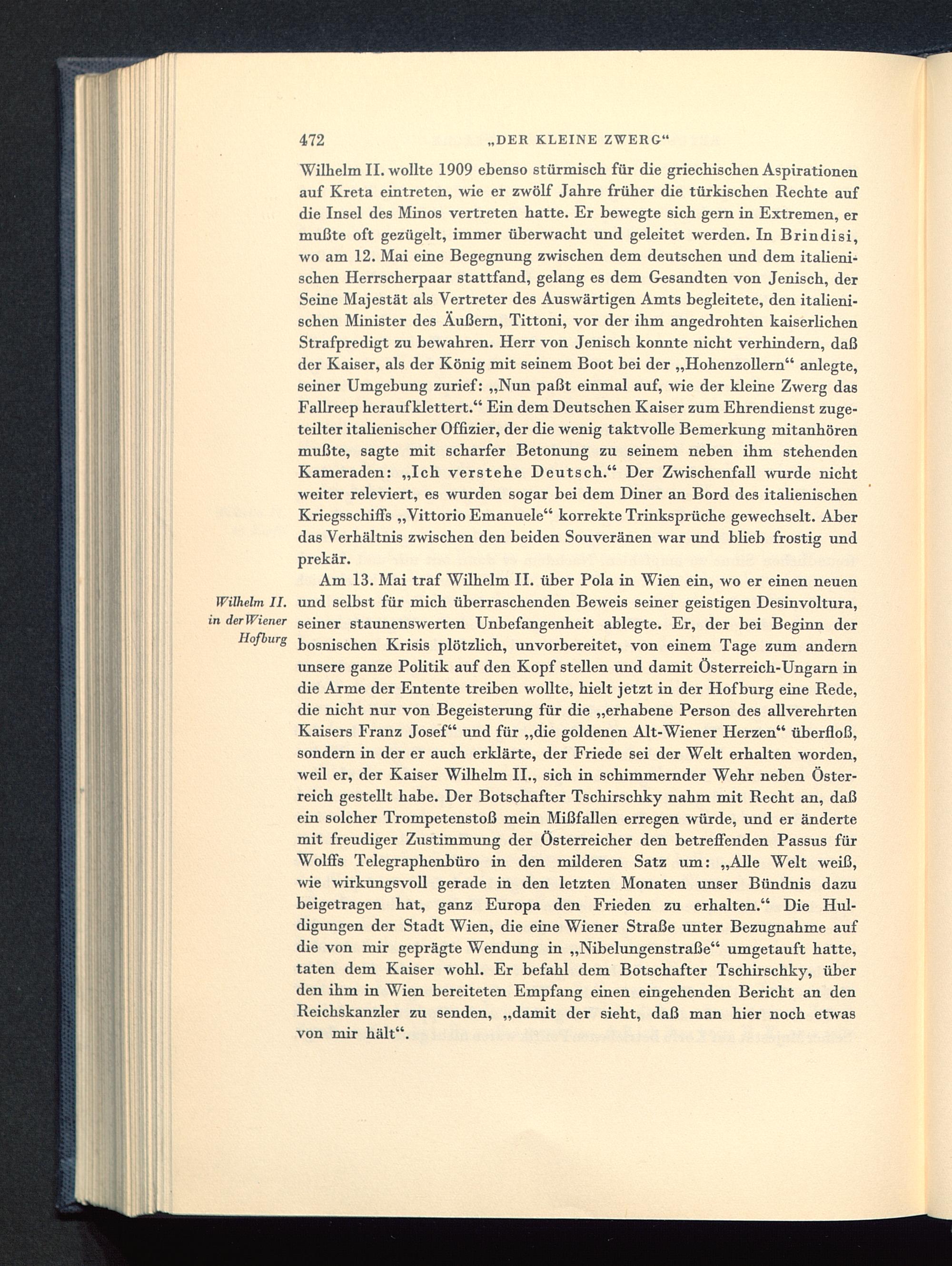Wilhelm II. wollte 1909 ebenso stürmisch für die griechischen Aspirationenauf Kreta eintreten, wie er zwölf Jahre früher die türkischen Rechte aufdie Insel des Minos vertreten hatte. Er bewegte sich gern in Extremen, ermußte oft gezügelt, immer überwacht und geleitet werden. In Brindisi ,wo am 12. Mai eine Begegnung zwischen dem deutschen und dem italieni-schen Herrscherpaar stattfand, gelang es dem Gesandten von Jenisch, derSeine Majestät als Vertreter des Auswärtigen Amts begleitete, den italieni-schen Minister des Äußern, Tittoni , vor der ihm angedrohten kaiserlichenStrafpredigt zu bewahren. Herr von Jenisch konnte nicht verhindern, daßder Kaiser, als der König mit seinem Boot bei der „Hohenzollern " anlegte,seiner Umgebung zurief: „Nun paßt einmal auf, wie der kleine Zwerg dasFallreep herauf klettert." Ein dem Deutschen Kaiser zum Ehrendienst zuge-teilter italienischer Offizier, der die wenig taktvolle Bemerkung mitanhörenmußte, sagte mit scharfer Betonung zu seinem neben ihm stehendenKameraden: „Ich verstehe Deutsch ." Der Zwischenfall wurde nichtweiter releviert, es wurden sogar bei dem Diner an Bord des italienischenKriegsschiffs „Vittorio Emanuele" korrekte Trinksprüche gewechselt. Aberdas Verhältnis zwischen den beiden Souveränen war und blieb frostig undprekär.