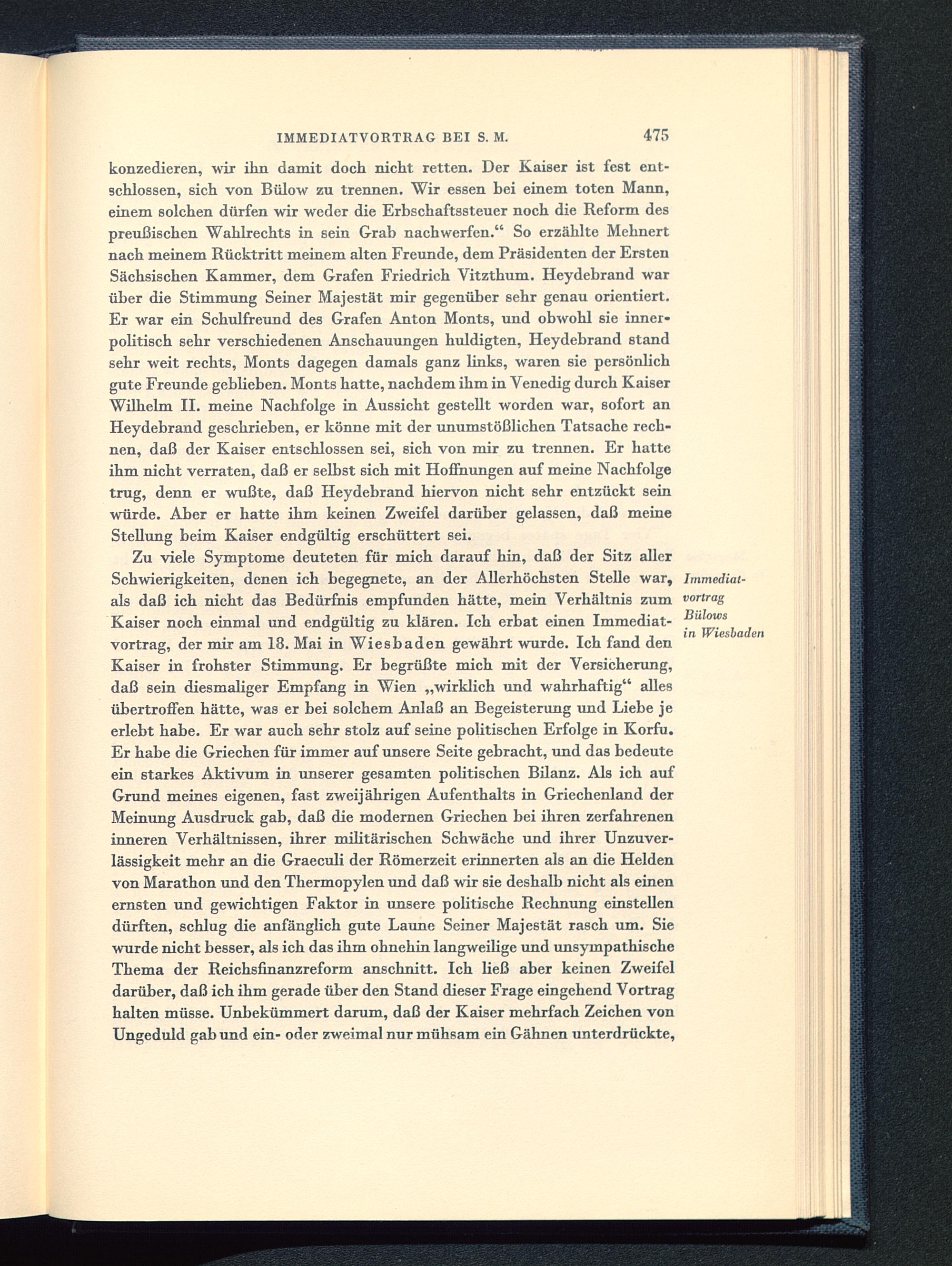 konzedieren, wir ihn damit doch nicht retten. Der Kaiser ist fest ent-schlossen, sich von Bülow zu trennen. Wir essen bei einem toten Mann,einem solchen dürfen wir weder die Erbschaftssteuer noch die Reform despreußischen Wahlrechts in sein Grab nachwerfen." So erzählte Mehnertnach meinem Rücktritt meinem alten Freunde, dem Präsidenten der ErstenSächsischen Kammer, dem Grafen Friedrich Vitzthum. Heydebrand warüber die Stimmung Seiner Majestät mir gegenüber sehr genau orientiert.Er war ein Schulfreund des Grafen Anton Monts , und obwohl sie inner-politisch sehr verschiedenen Anschauungen huldigten, Heydebrand standsehr weit rechts, Monts dagegen damals ganz links, waren sie persönlichgute Freunde geblieben. Monts hatte, nachdem ihm in Venedig durch KaiserWilhelm II. meine Nachfolge in Aussicht gestellt worden war, sofort anHeydebrand geschrieben, er könne mit der unumstößlichen Tatsache rech-nen, daß der Kaiser entschlossen sei, sich von mir zu trennen. Er hatteihm nicht verraten, daß er selbst sich mit Hoffnungen auf meine Nachfolgetrug, denn er wußte, daß Heydebrand hiervon nicht sehr entzückt seinwürde. Aber er hatte ihm keinen Zweifel darüber gelassen, daß meineStellung beim Kaiser endgültig erschüttert sei.