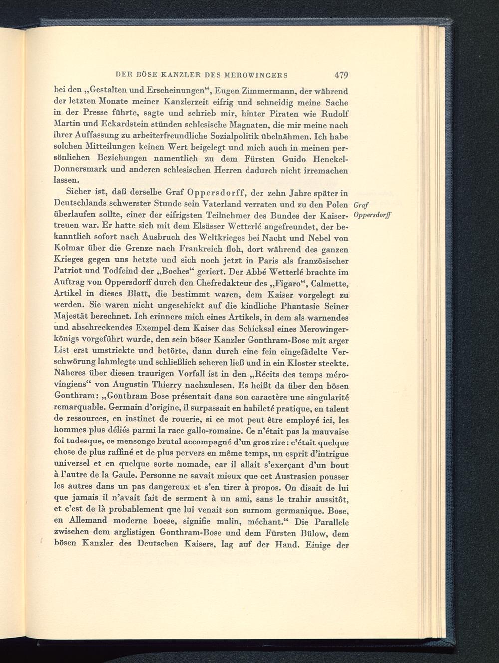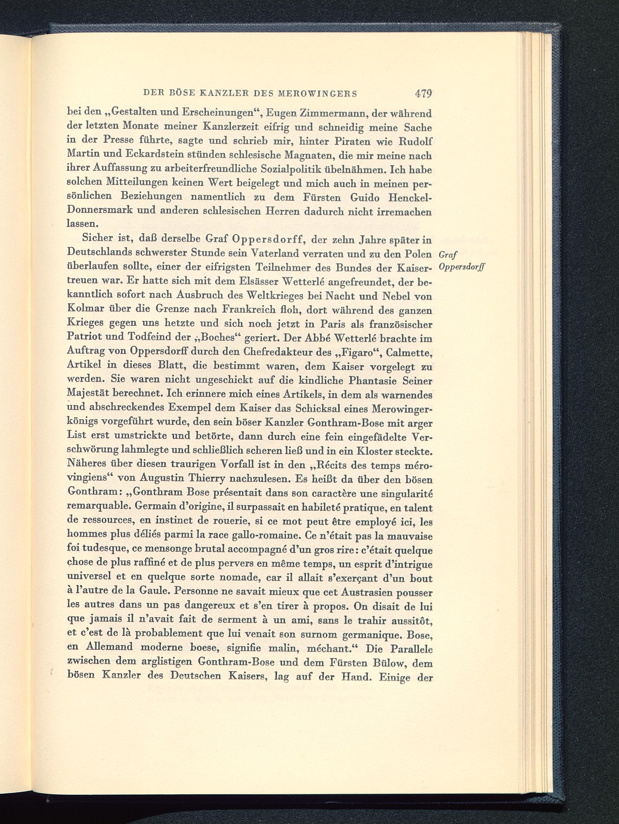 Sicher ist, daß derselbe Graf Oppersdorff, der zehn Jahre später inDeutschlands schwerster Stunde sein Vaterland verraten und zu den Polen Grafüberlaufen sollte, einer der eifrigsten Teilnehmer des Bundes der Kaiser- Oppersdorfftreuen war. Er hatte sich mit dem Elsässer Wetterle angefreundet, der be-kanntlich sofort nach Ausbruch des Weltkrieges bei Nacht und Nebel vonKolmar über die Grenze nach Frankreich floh, dort während des ganzenKrieges gegen uns hetzte und sich noch jetzt in Paris als französischerPatriot und Todfeind der ,-,Boches" geriert. Der Abbe Wetterle brachte imAuftrag von Oppersdorff durch den Chefredakteur des „Figaro", Calmette,Artikel in dieses Blatt, die bestimmt waren, dem Kaiser vorgelegt zuwerden. Sie waren nicht ungeschickt auf die kindliche Phantasie SeinerMajestät berechnet. Ich erinnere mich eines Artikels, in dem als warnendesund abschreckendes Exempel dem Kaiser das Schicksal eines Merowinger -königs vorgeführt wurde, den sein böser Kanzler Gonthram-Bose mit argerList erst umstrickte und betörte, dann durch eine fein eingefädelte Ver-schwörung lahmlegte und schließlich scheren ließ und in ein Kloster steckte.Näheres über diesen traurigen Vorfall ist in den „Recits des temps mero-vingiens" von Augustin Thierry nachzulesen. Es heißt da über den bösenGonthram: „Gonthram Bose presentait dans son caractere une singulariteremarquable. Germain d'origine, il surpassait en habilete pratique, en talentde ressources, en instinct de rouerie, si ce mot peut Stre employe ici, leshommes plus delies parmi la race gallo-romaine. Ce n'etait pas la mauvaisefoi tudesque, ce mensonge brutal accompagne d'un gros rire: c'etait quelquechose de plus raffine et de plus pervers en meme temps, un esprit d'intrigueuniversel et en quelque sorte nomade, car il allait s'exercant d'un boutä l'autre de la Gaule. Personne ne savait mieux que cet Austrasien pousserles autres dans un pas dangereux et s'en tirer ä propos. On disait de luique jamais il n'avait fait de serment ä un ami, sans le trahir aussitöt,et c'est de lä probablement que lui venait son surnom germanique. Bose,en Allemand moderne boese, signifie mahn, mechant." Die Parallelezwischen dem argbstigen Gonthram-Bose und dem Fürsten Bülow, dembösen Kanzler des Deutschen Kaisers, lag auf der Hand. Einige der