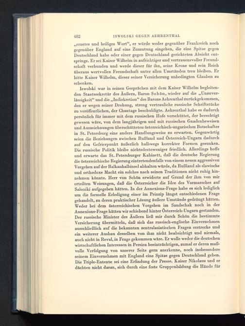 Iswolski war in seinen Gesprächen mit dem Kaiser Wilhelm begleiten-den Staatssekretär des Äußern, Baron Schön, wieder auf die „Unzuver-lässigkeit" und die „Indiskretion" des Barons Aehrenthal zurückgekommen,den er wegen seiner Drohung, streng vertrauliche russische Schriftstückezu veröffentlichen, der Chantage beschuldigte. Aehrenthal habe es dadurchpersönlich für immer mit dem russischen Hofe verschüttet, der berechtigtgewesen wäre, von dem langjährigen und mit russischen Gnadenbeweisenund Auszeichnungen überschütteten österreichisch-ungarischen Botschafterin St. Petersburg eine andere Handlungsweise zu erwarten. Gegenwärtigseien die Beziehungen zwischen Rußland und Österreich-Ungarn dadurchauf den Gefrierpunkt äußerlich halbwegs korrekter Formen gesunken.Die russische Politik bleibe nichtsdestoweniger friedlich. Allerdings hoffeund erwarte das St. Petersburger Kabinett, daß die deutsche Regierungdie österreichische Regierung eintretendenfalls von einem neuen aggressivenVorgehen auf der Balkanhalbinsel abhalten würde, da Rußland als slawischeund orthodoxe Macht ein solches nach seinen Traditionen nicht ruhig hin-nehmen könnte. Herr von Schön erwiderte auf Grund der ihm von mirerteilten Weisungen, daß die Österreicher die Idee des Vormarsches aufSaloniki aufgegeben hätten. In der Annexions-Frage habe es sich lediglichum die formelle Erledigung einer im Prinzip längst entschiedenen Fragegehandelt, zu deren praktischer Lösung äußere Umstände gedrängt hätten.Weder bei dem österreichischen Vorgehen im Sandschak noch in derAnnexions-Frage hätten wir schiebend hinter Österreich-Ungarn gestanden.Der russische Minister des Äußern beß mir durch Schön die bestimmteVersicherung übermitteln, daß sich das russisch -engbsche Einvernehmenausschließbch auf die bekannten zentralasiatischen Fragen erstrecke undein weiterer Ausbau desselben von ihm nicht beabsichtigt und niemals,auch nicht in Reval, in Frage gekommen wäre. Er wolle weder die deutschenwirtschaftbchen Interessen in Persien beeinträchtigen, zumal er deren maß-volle Verfolgung von unserer Seite gern anerkenne, noch insbesondereseinem Einvernehmen mit England eine Spitze gegen Deutschland geben.Die Triple-Entente sei eine Erfindung der Presse. Kaiser Nikolaus und erdächten nicht daran, sich durch eine feste Gruppenbildung die Hände für