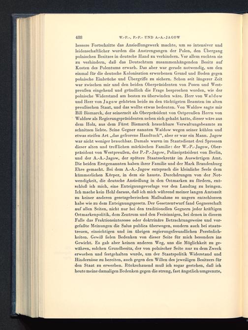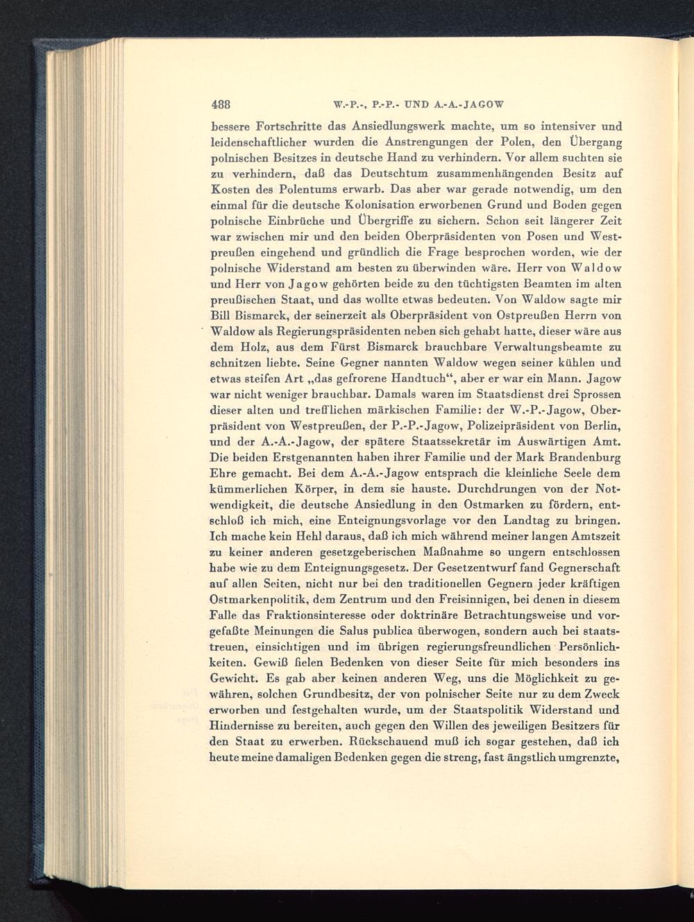 bessere Fortschritte das Ansiedlungswerk machte, um so intensiver undleidenschaftlicher wurden die Anstrengungen der Polen , den Übergangpolnischen Besitzes in deutsche Hand zu verhindern. Vor allem suchten siezu verhindern, daß das Deutschtum zusammenhängenden Besitz aufKosten des Polentums erwarb. Das aber war gerade notwendig, um deneinmal für die deutsche Kolonisation erworbenen Grund und Boden gegenpohlische Einbrüche und Übergriffe zu sichern. Schon seit längerer Zeitwar zwischen mir und den beiden Oberpräsidenten von Posen und West-preußen eingehend und gründlich die Frage besprochen worden, wie derpolnische Widerstand am besten zu überwinden wäre. Herr von Waldowund Herr von Jagow gehörten beide zu den tüchtigsten Beamten im altenpreußischen Staat, und das wollte etwas bedeuten. Von Waldow sagte mirBill Bismarck, der seinerzeit als Oberpräsident von Ostpreußen Herrn vonWaldow als Regierungspräsidenten neben sich gehabt hatte, dieser wäre ausdem Holz, aus dem Fürst Bismarck brauchbare Verwaltungsbeamte zuschnitzen liebte. Seine Gegner nannten Waldow wegen seiner kühlen undetwas steifen Art „das gefrorene Handtuch", aber er war ein Mann. Jagowwar nicht weniger brauchbar. Damals waren im Staatsdienst drei Sprossendieser alten und trefflichen märkischen Familie: der W.-P.-Jagow, Ober-präsident von Westpreußen , der P.-P.-Jagow, Polizeipräsident von Berlin,und der A.-A.-Jagow, der spätere Staatssekretär im Auswärtigen Amt .Die beiden Erstgenannten haben ihrer Familie und der Mark BrandenburgEhre gemacht. Bei dem A.-A.-Jagow entsprach die kleinliche Seele demkümmerlichen Körper, in dem sie hauste. Durchdrungen von der Not-wendigkeit, die deutsche Ansiedlung in den Ostmarken zu fördern, ent-schloß ich mich, eine Enteignungsvorlage vor den Landtag zu bringen.Ich mache kein Hehl daraus, daß ich mich während meiner langen Amtszeitzu keiner anderen gesetzgeberischen Maßnahme so ungern entschlossenhabe wie zu dem Enteignungsgesetz. Der Gesetzentwurf fand Gegnerschaftauf allen Seiten, nicht nur bei den traditionellen Gegnern jeder kräftigenOstmarkenpolitik, dem Zentrum und den Freisinnigen, bei denen in diesemFalle das Fraktionsinteresse oder doktrinäre Betrachtungsweise und vor-gefaßte Meinungen die Salus publica überwogen, sondern auch bei staats-treuen, einsichtigen und im übrigen regierungsfreundlichen Persönlich-keiten. Gewiß fielen Bedenken von dieser Seite für mich besonders insGewicht. Es gab aber keinen anderen Weg, uns die Möglichkeit zu ge-währen, solchen Grundbesitz, der von polnischer Seite nur zu dem Zweckerworben und festgehalten wurde, um der Staatspolitik Widerstand undHindernisse zu bereiten, auch gegen den Willen des jeweiligen Besitzers fürden Staat zu erwerben. Rückschauend muß ich sogar gestehen, daß ichheute meine damaligen Bedenken gegen die streng, fast ängstlich umgrenzte,
